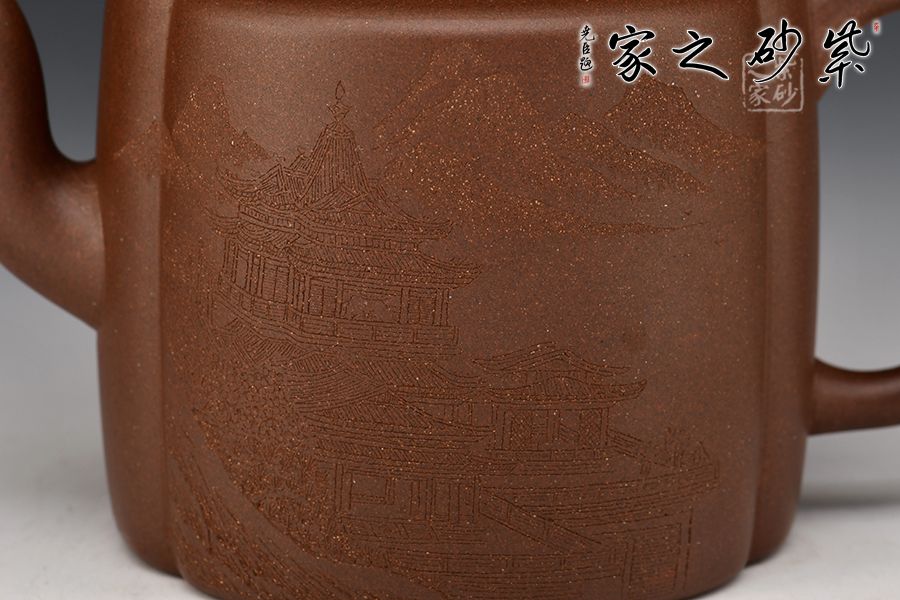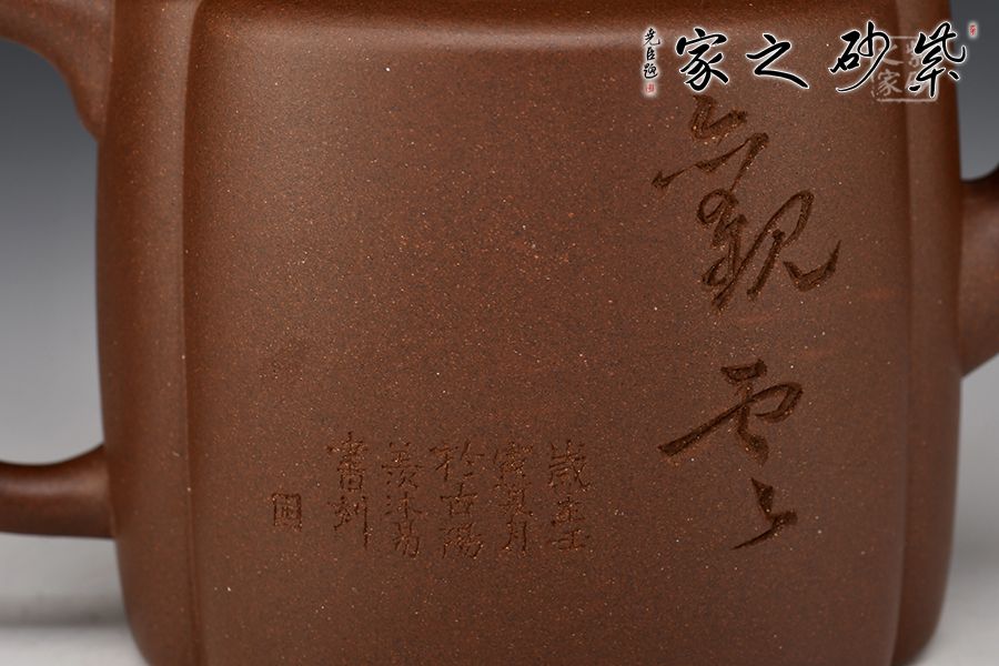 整壺古樸大方,鈕、蓋、身猶如三個圓球疊落而成,壺頸較長,立體空間感極好,壺蓋的卷沿古樸厚重,壓蓋有氣勢。一彎流昂揚,耳形把精巧。整體比例勻稱,造型大氣,刻繪精美,渾樸豐潤,是一把高性價比的殺茶利器,值得把玩。