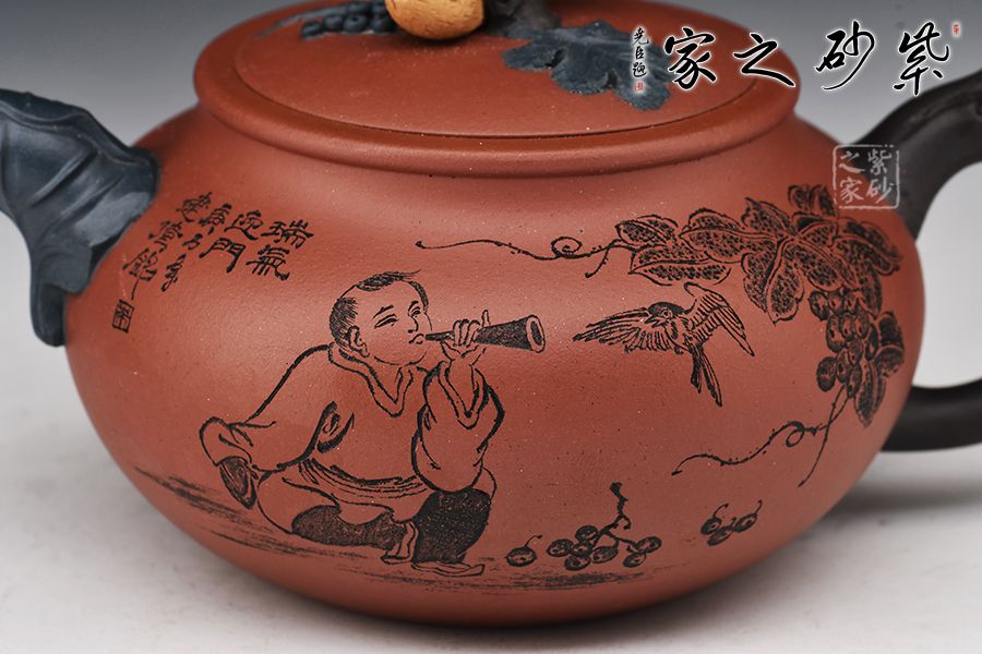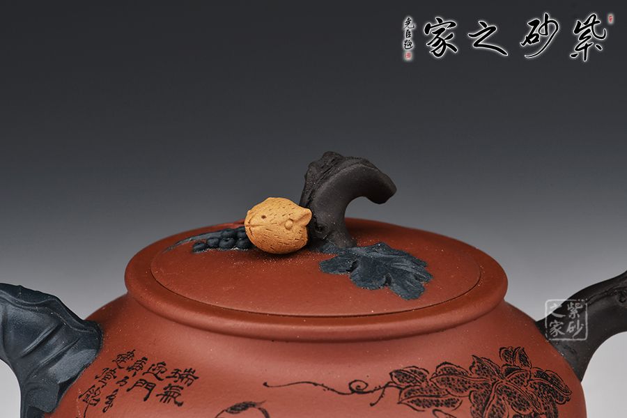 此作品外觀設(shè)計(jì)新穎,別具巧思,獨(dú)一無(wú)二。取材豐富,裝飾手法眾多,融入了貼花,泥繪,描金等眾多技法成就的一把作品,足見(jiàn)老師功力非凡,而此壺制作耗時(shí)耗力,成品難得。壺蓋像猴子的臉,設(shè)計(jì)巧妙,壺身上有蝙蝠與金幣,寓意招財(cái)進(jìn)寶,福氣綿延,壺身貼花生動(dòng),栩栩如生,細(xì)節(jié)處理巧妙,實(shí)為佳品!