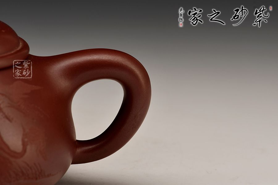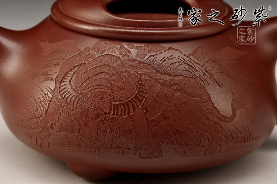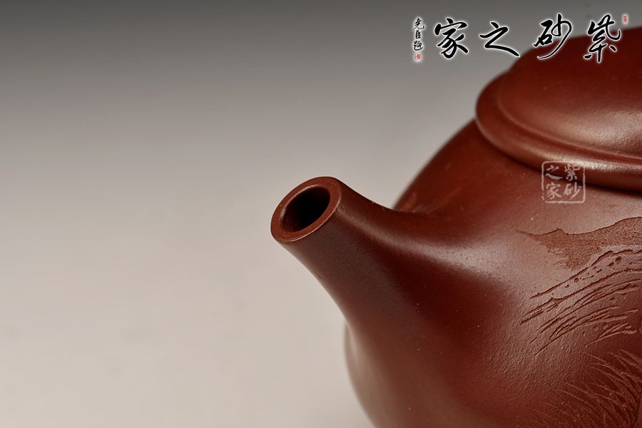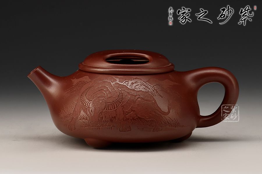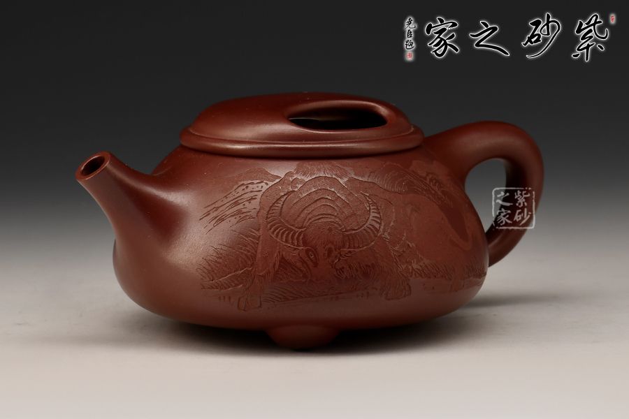 此把牛蓋石瓢,脫胎于景舟石瓢,經(jīng)典造型,采用截蓋設(shè)計(jì),因形似牛鼻,故名為“牛蓋石瓢壺”。全手制作,工藝細(xì)節(jié)之處足夠嚴(yán)謹(jǐn),壺嘴與壺身銜接自然,渾然天成。壺身刻繪牛身,栩栩如生,佳作一把。