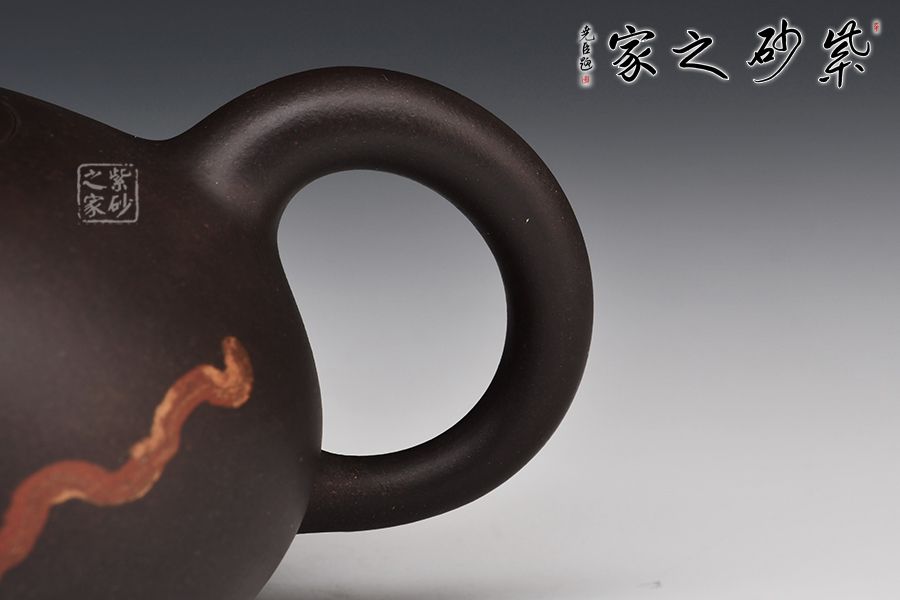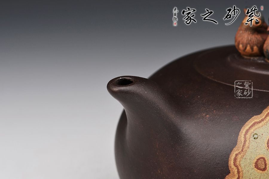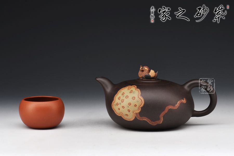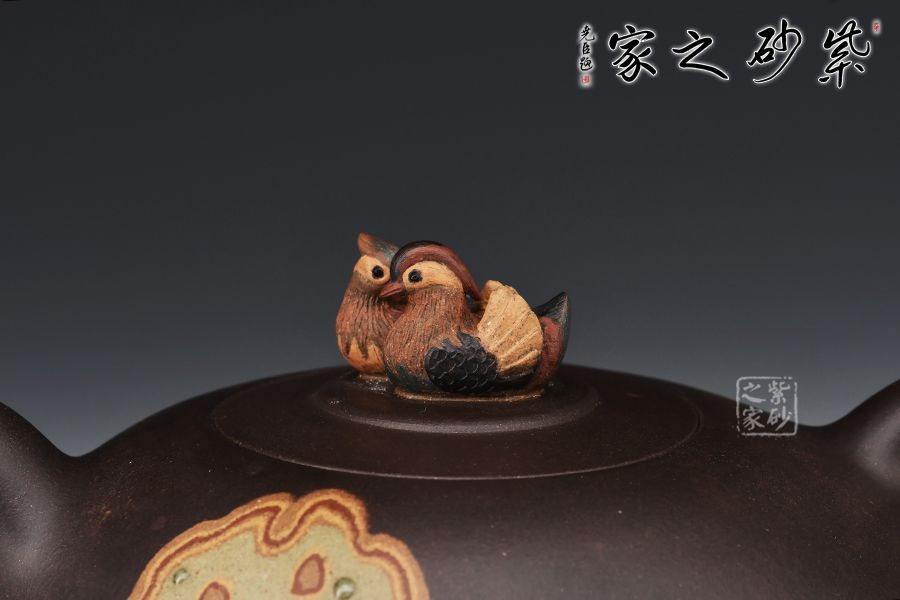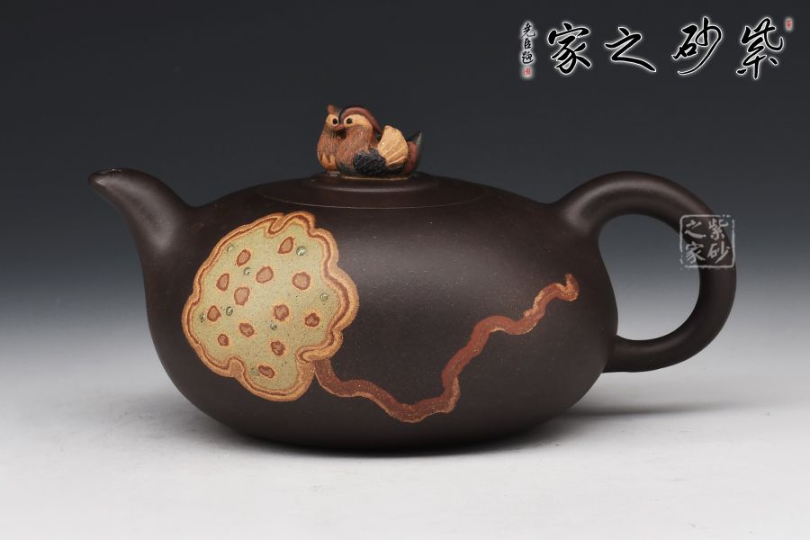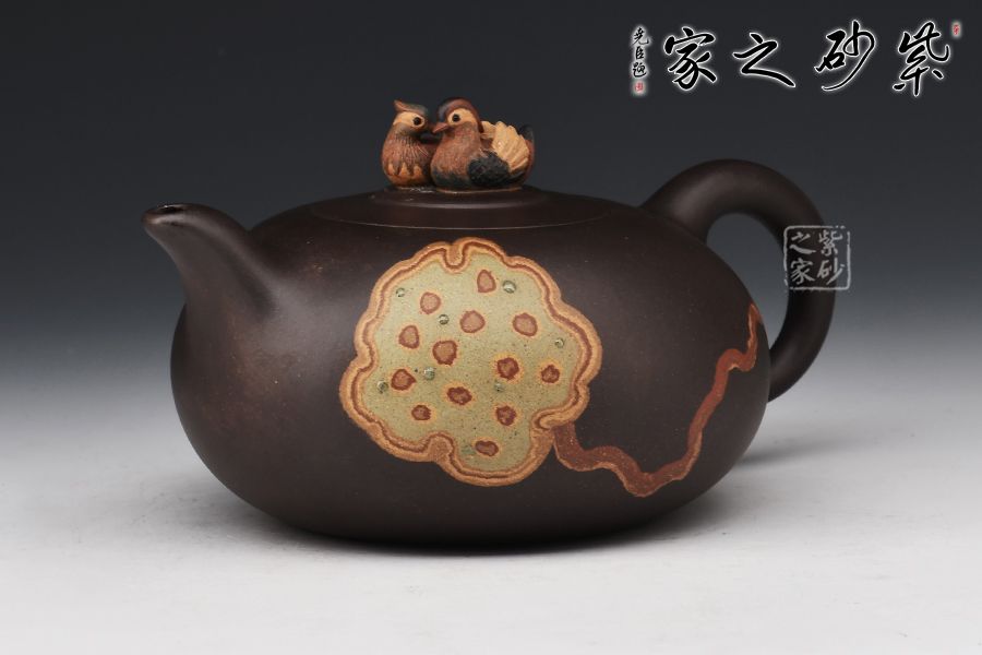 此款鴛鴦壺壺身飽滿圓潤,壺鈕為兩只鴛鴦,形象自然,栩栩如生。壺身以荷葉荷花蓮蓬裝飾,趣味橫生!荷葉之上,水珠粒??梢姡そ承募毠?jié)經得起推敲,賞藏用皆為上佳!推薦!