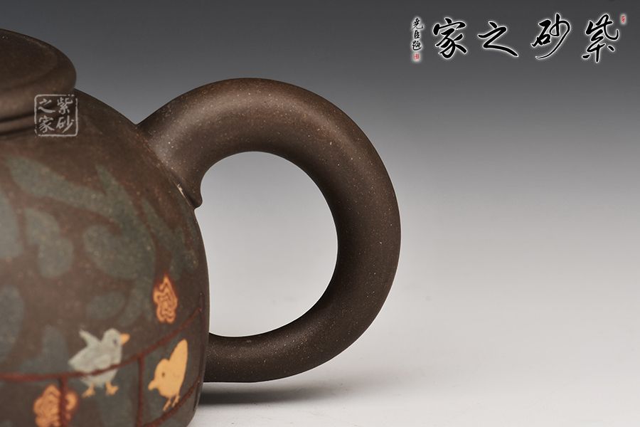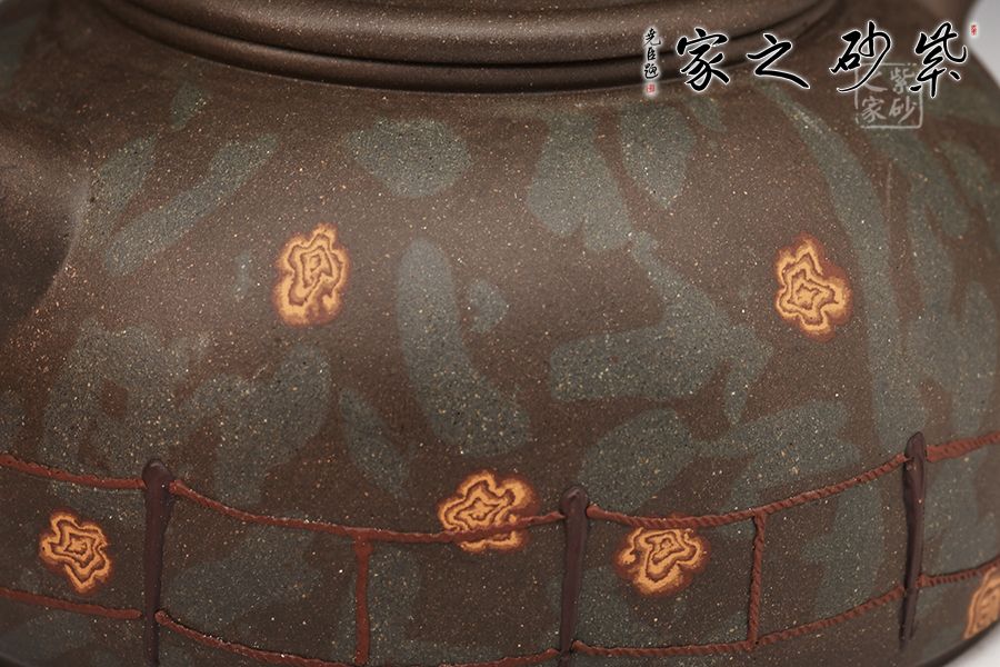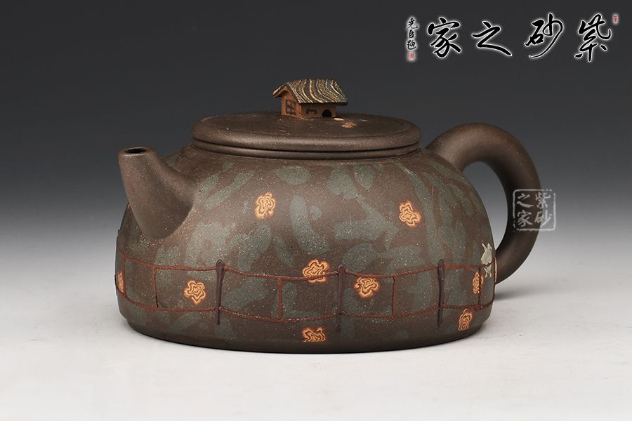 此款作品精選原礦綠泥為胎,老師全手工制作而成。壺身圓潤,線條流暢,絞泥裝飾,隔著圍欄遠(yuǎn)遠(yuǎn)望去,一片草原,幾只綿羊低著頭在吃草,遠(yuǎn)遠(yuǎn)看去,像一兩朵在草園上行走的白云。一彎嘴,出水流暢,耳把拿鈕舒適,壓蓋設(shè)計,嚴(yán)絲合縫,壺鈕形似一棟小房子,精制可愛。