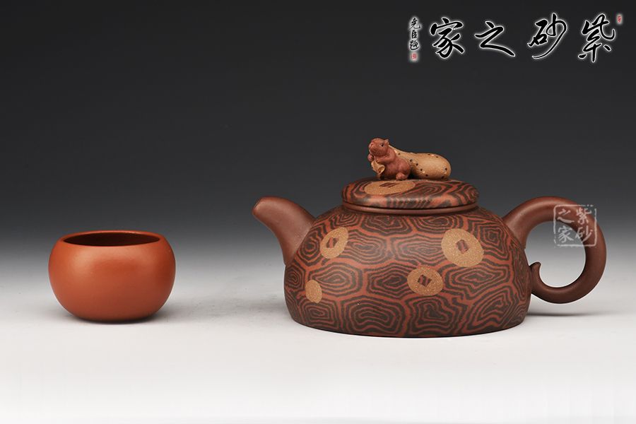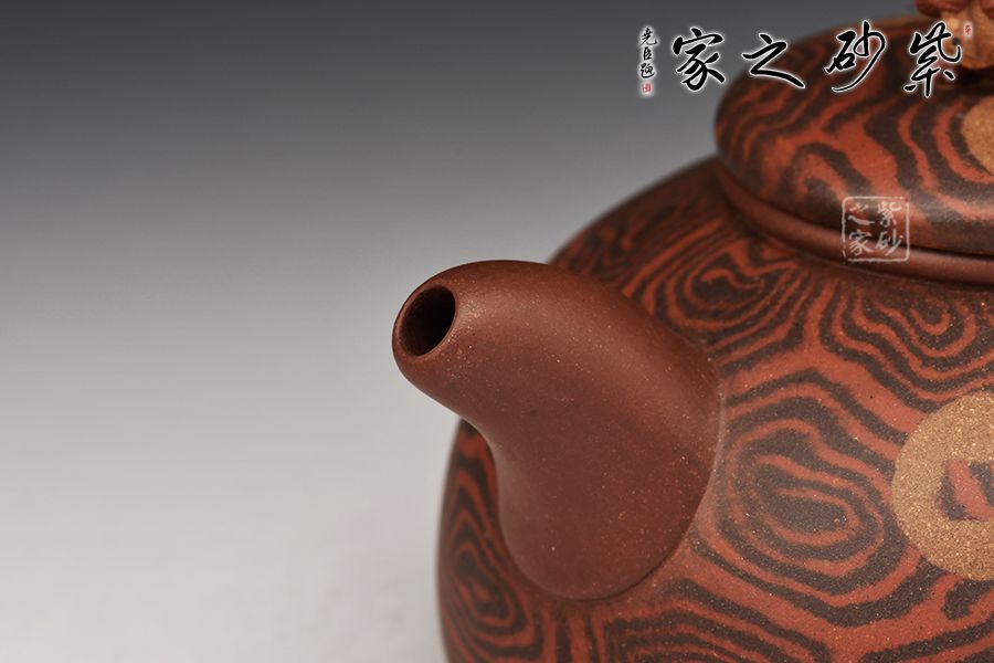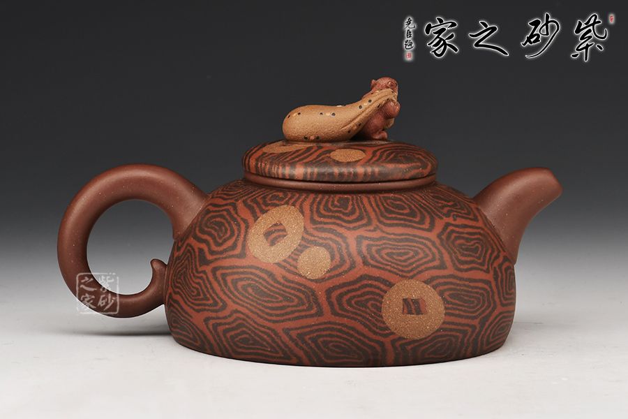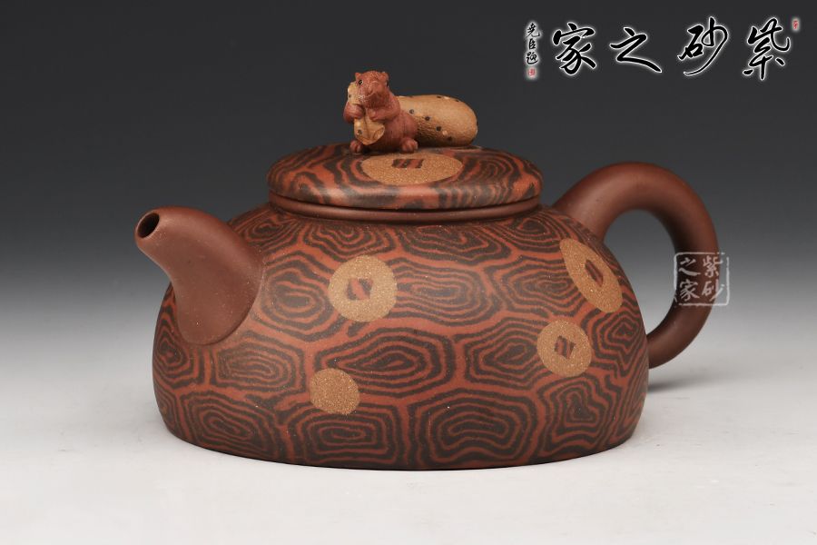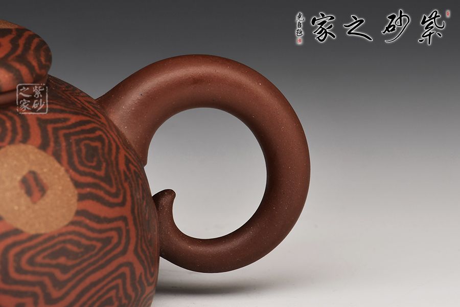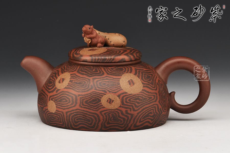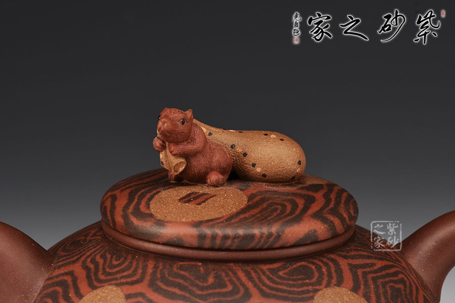 整壺以鼠元素入砂壺,塑“鼠拖糧袋”之造型,精雕細(xì)琢于鈕,栩栩如生,靈動可愛。壺身一側(cè)置耳把,彎曲的弧度,亦如細(xì)長靈巧的鼠尾,與主題相呼應(yīng)。此外,壺身絞泥銅錢圖案,象征著財(cái)源滾滾和人丁興旺,推薦收藏!