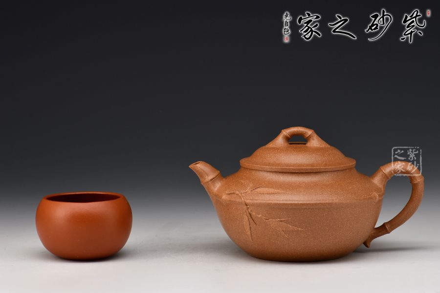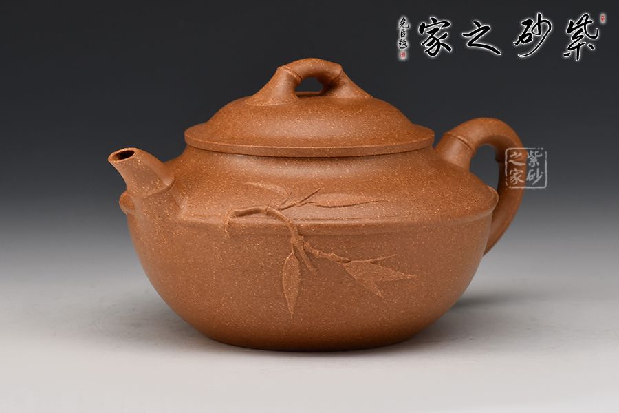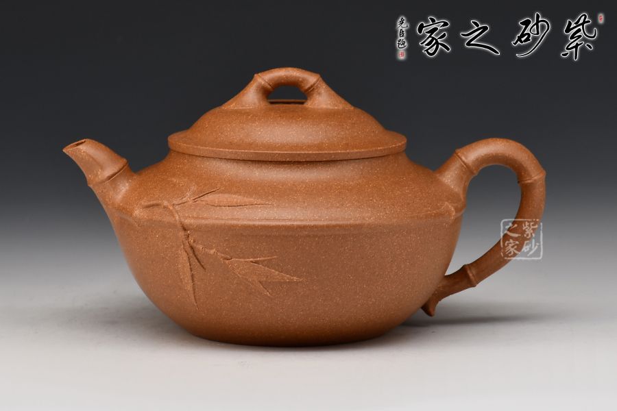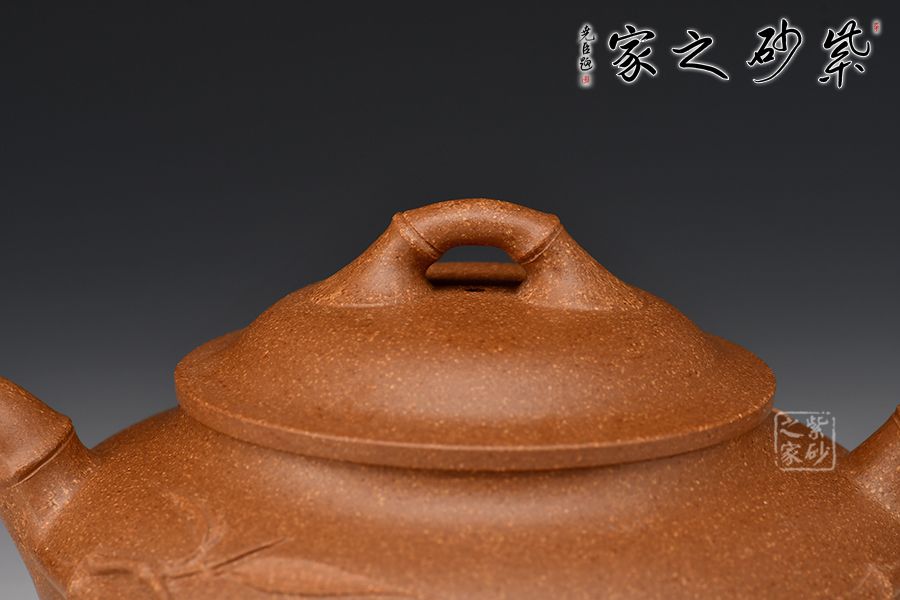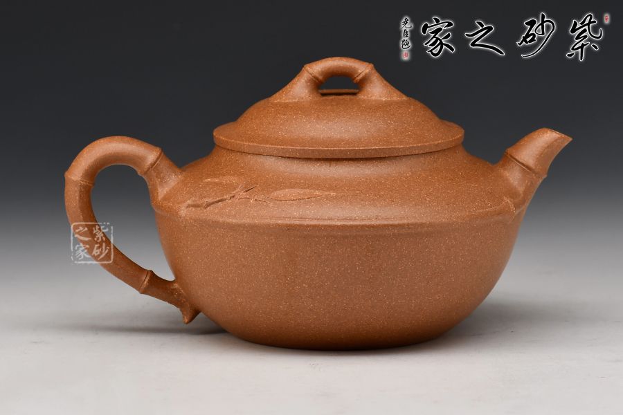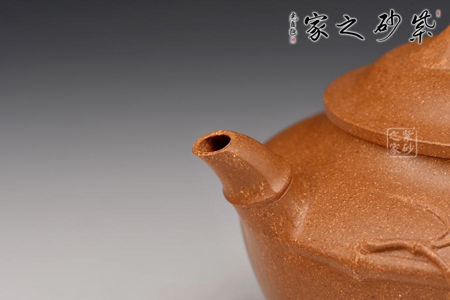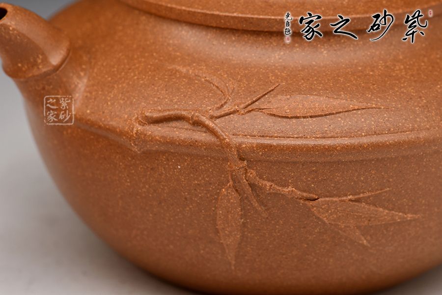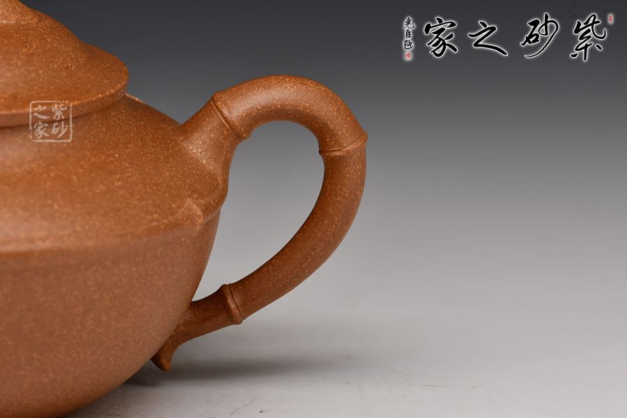的流把竹節(jié)造型,一變嘴二節(jié)竹節(jié)裝飾而成,弧鈕散開在略微鼓起的壺蓋之上,蓋沿明顯厚于口沿,形成強勁的壓蓋之勢,耳形端把四節(jié)竹節(jié)裝飾,一條清晰的線條從壺腹中間穿過,似是一條寬闊的腰帶橫亙其中;整款壺竹韻清疏,竹葉自壺嘴清淺胥出,貼于壺身之上,再也無其他裝飾,韻味不失,毫無矯飾。