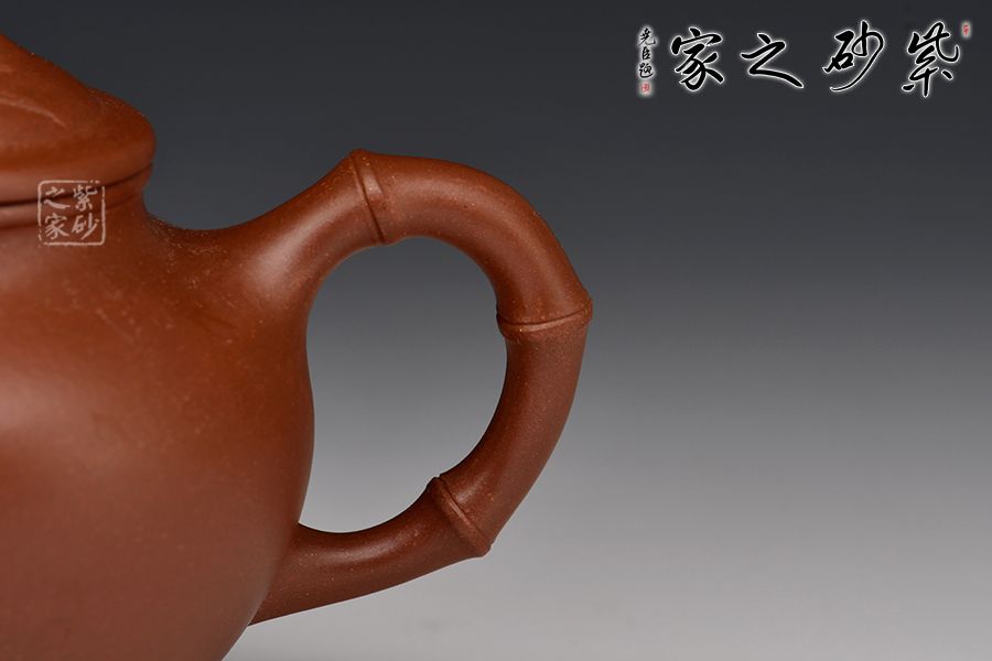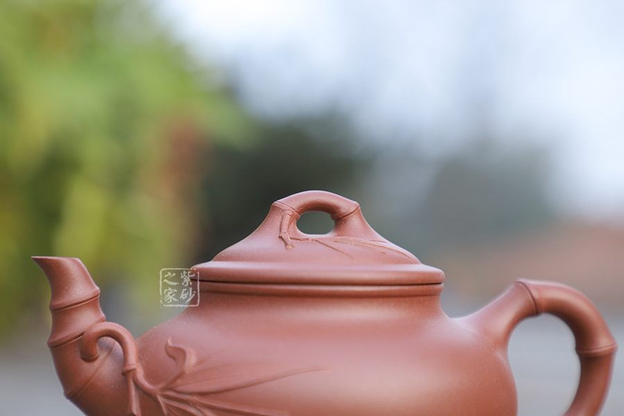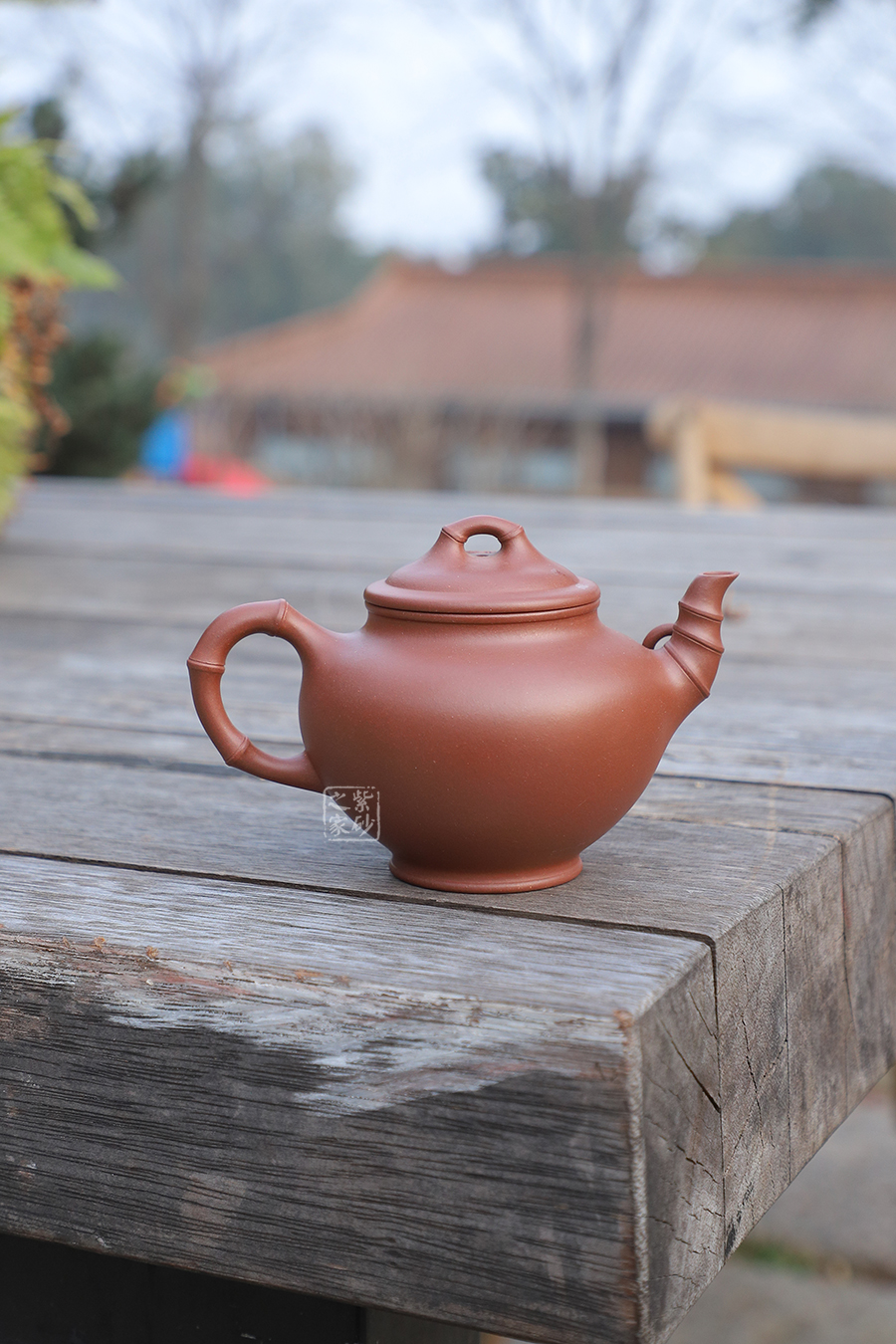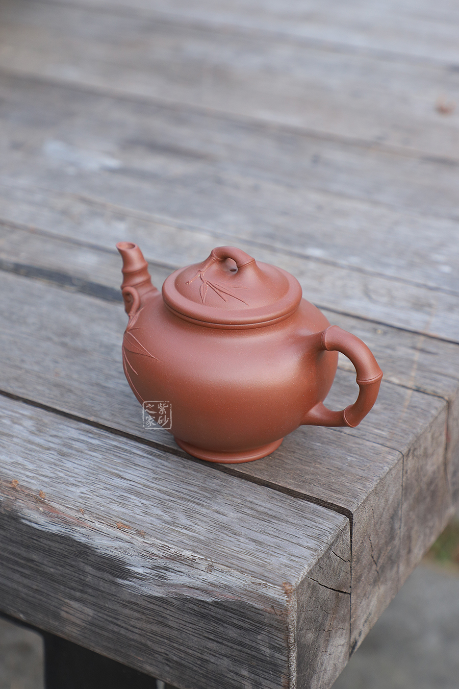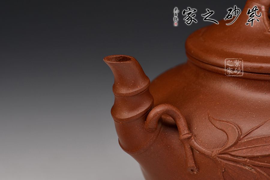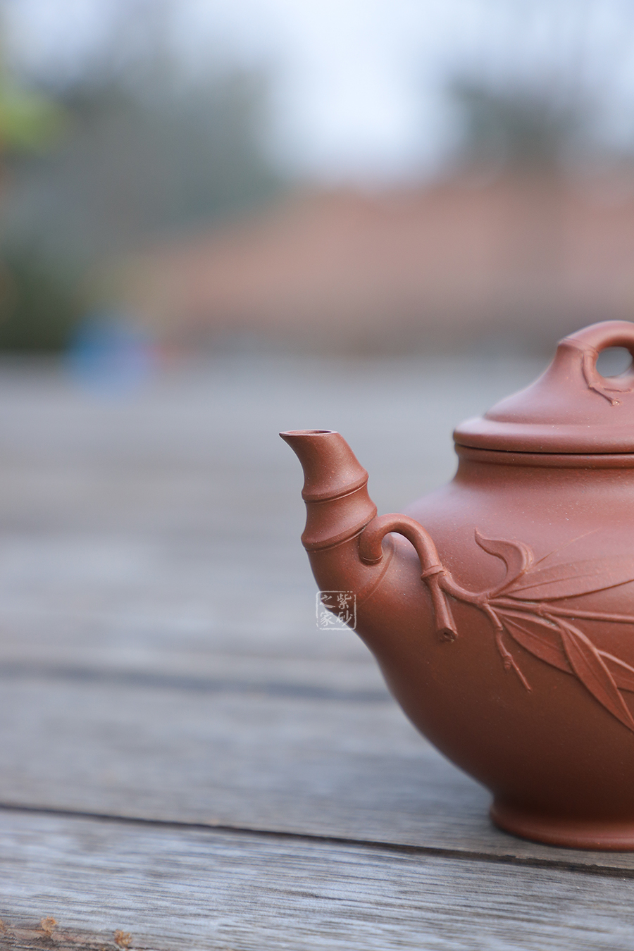 古樸間透著雅致,是一款十分有意思的作品;壺身的輪廓還是以笑櫻壺為基礎(chǔ),線條優(yōu)美流暢,手感佳;壺身形體飽滿,線條流暢,有君子之風(fēng);壺嘴以竹節(jié)為形,蒼勁古雅,一枝竹葉匐于壺身,纖薄靈秀;耳形端把亦呈竹節(jié)造型,纖瘦有節(jié),彎曲有致,線條優(yōu)美自然,肩部云肩線挺括利落,壓蓋嚴(yán)絲合縫,三段竹節(jié)作鈕,別致有趣。