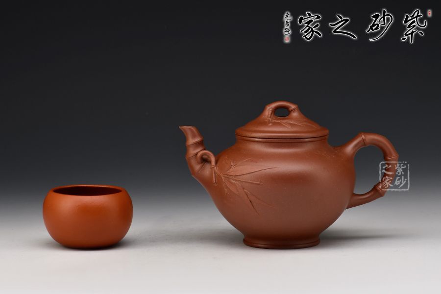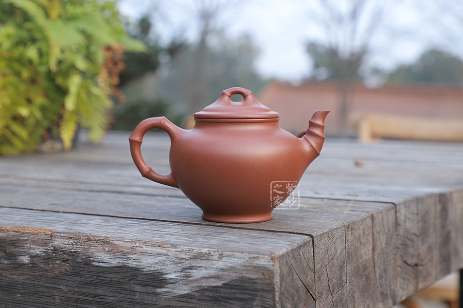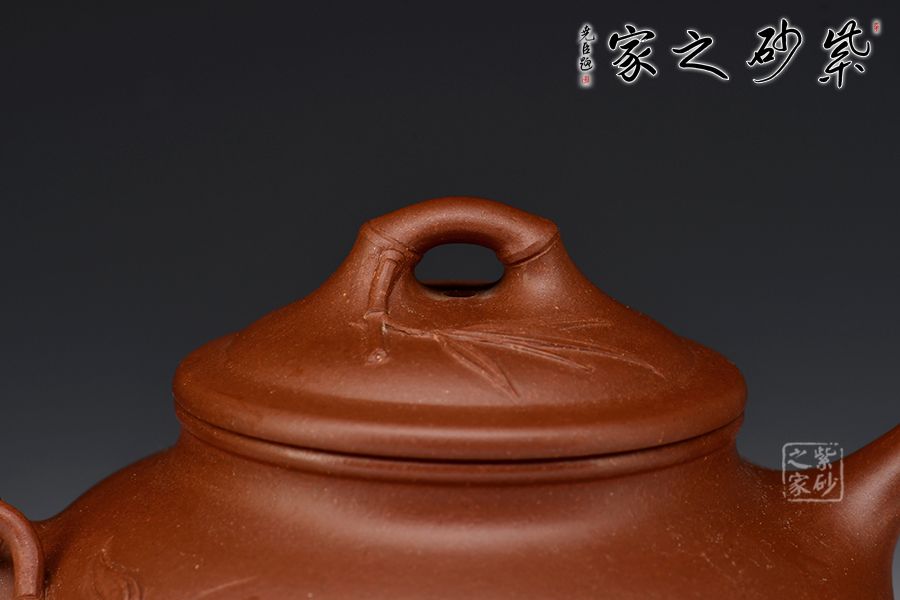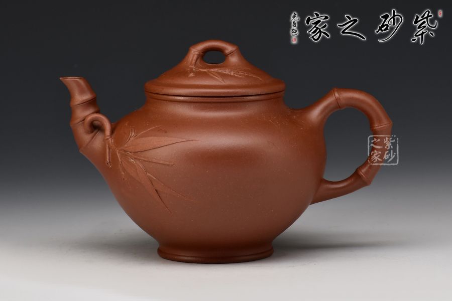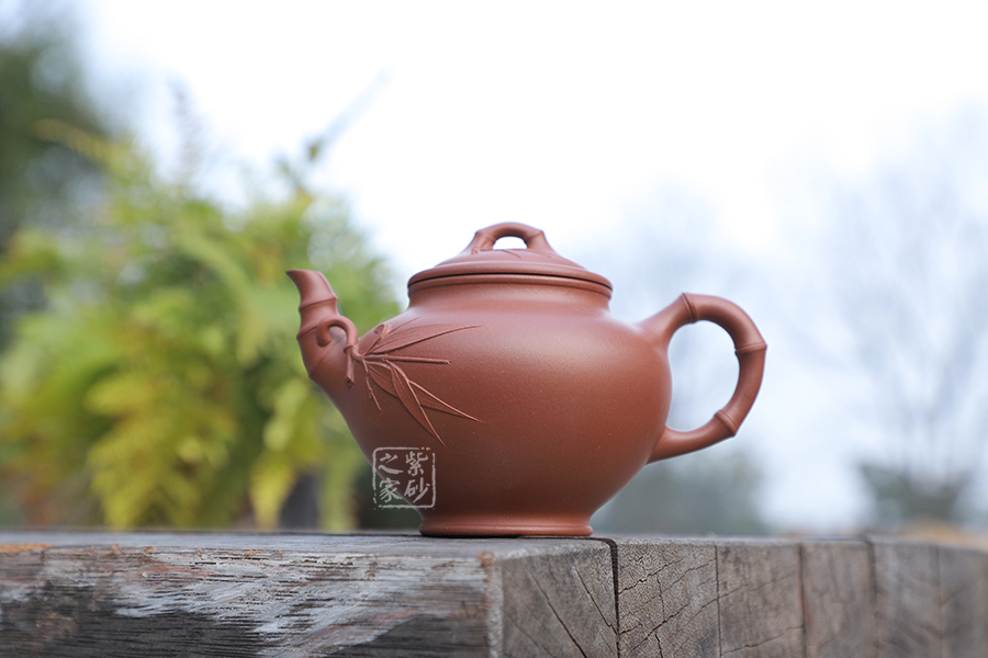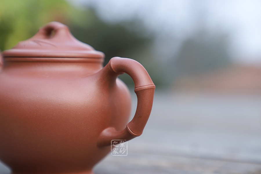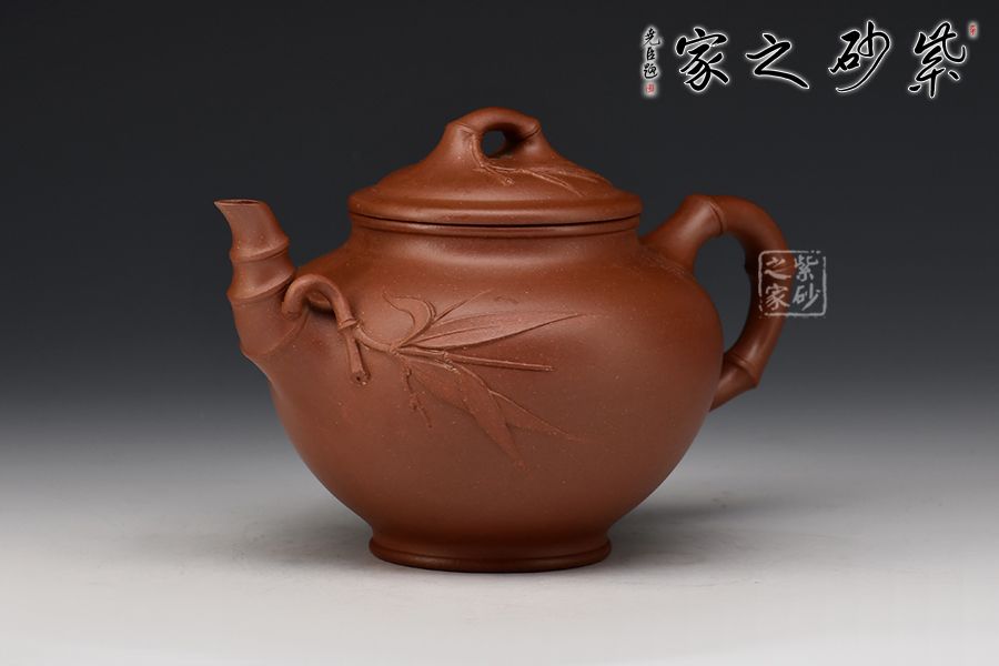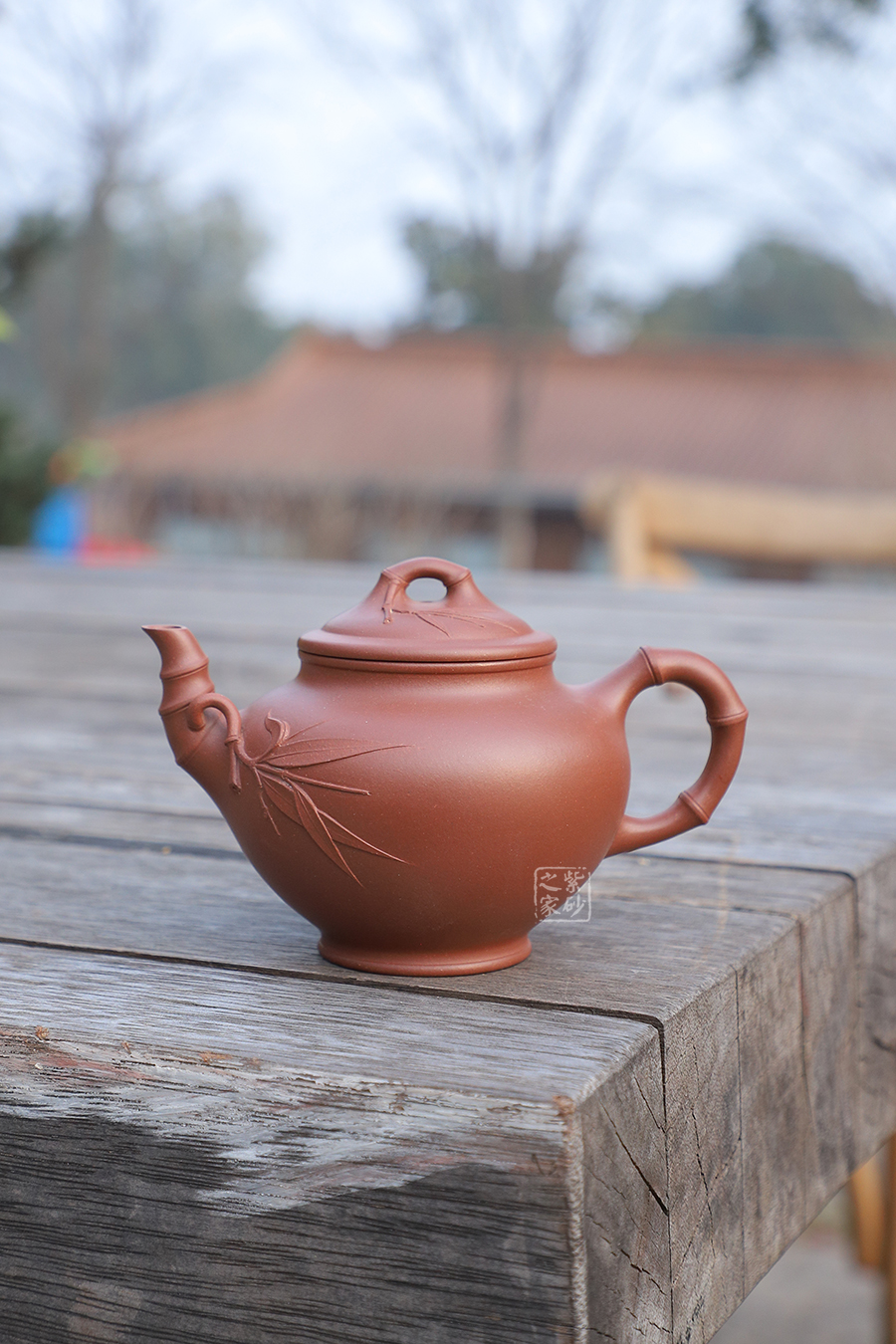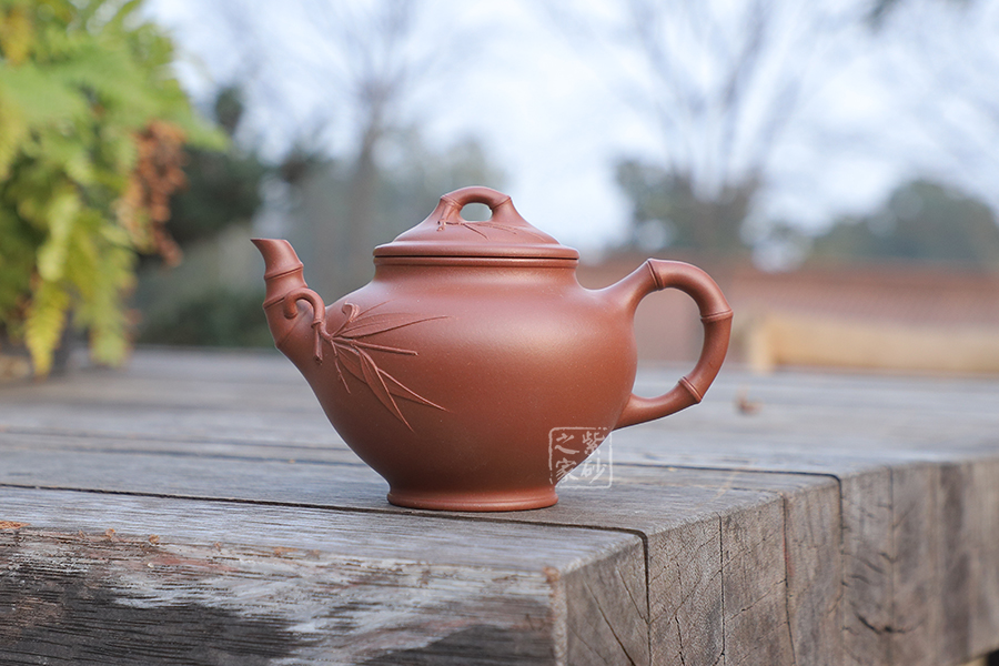 古樸間透著雅致,是一款十分有意思的作品;壺身的輪廓還是以笑櫻壺為基礎(chǔ),線條優(yōu)美流暢,手感佳;壺身形體飽滿,線條流暢,有君子之風(fēng);壺嘴以竹節(jié)為形,蒼勁古雅,一枝竹葉匐于壺身,纖薄靈秀;耳形端把亦呈竹節(jié)造型,纖瘦有節(jié),彎曲有致,線條優(yōu)美自然,肩部云肩線挺括利落,壓蓋嚴(yán)絲合縫,三段竹節(jié)作鈕,別致有趣。