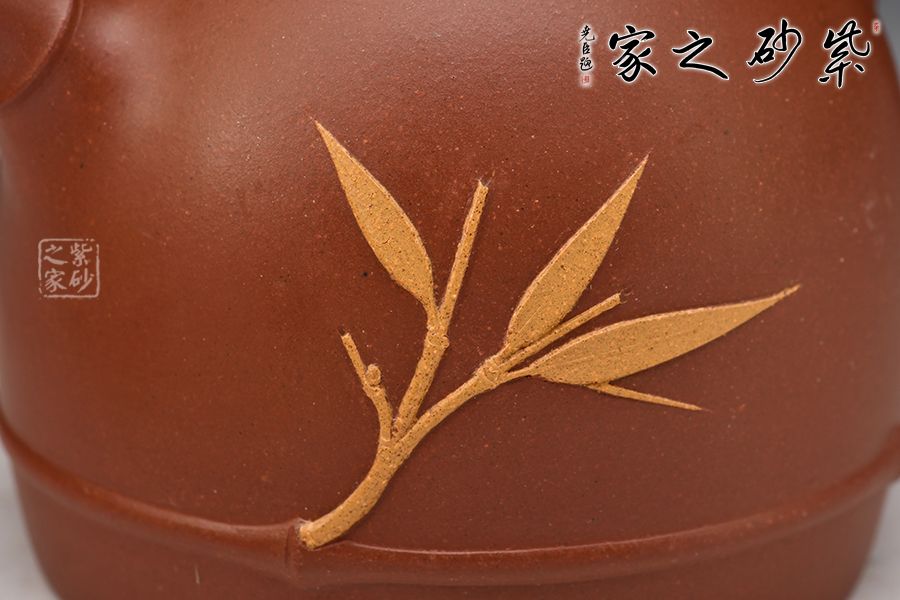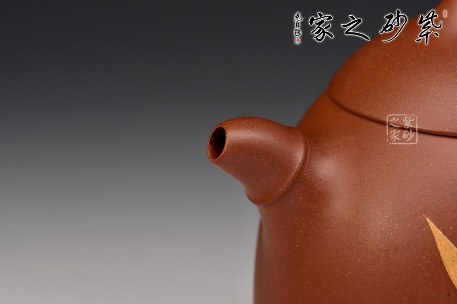 這款秦權將竹的題材融入,古樸間透著雅致,是一款十分有意思的作品。秦權造型來源于秦朝秤砣,古色古香,應有的神韻與氣度一點不差。壺嘴、壺把均以竹節(jié)形制,直流嘴自然胥出,嘴頭齊整,干脆利索,耳形把纖秀飄逸,粗細適中,端握舒適。截蓋讓壺身更完整,橋形鈕孔如秤砣的穿繩孔,精巧別致,壺身飽滿,端莊大氣。