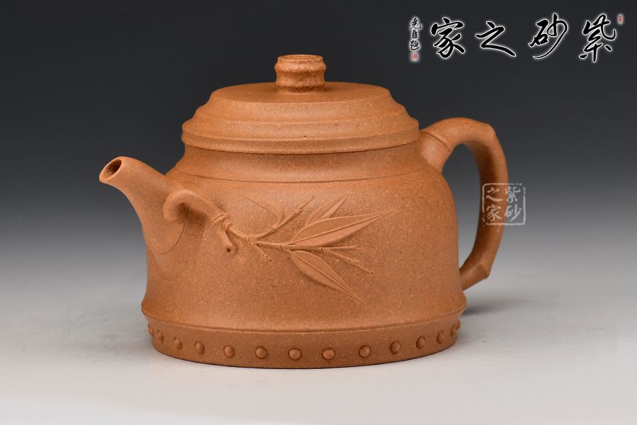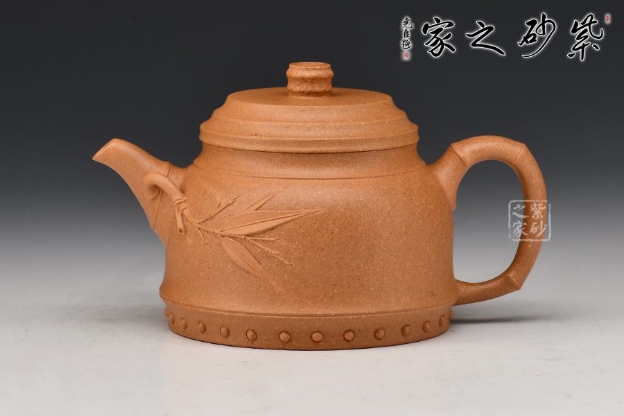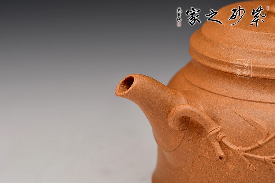 壺身似鐘形,端莊穩(wěn)重。壺身上部稍稍收斂,下部略微散開,整器線條變化豐富,收放自如。壺嘴壺把竹節(jié)形設(shè)計,突顯出節(jié)節(jié)高升的氣韻。壺嘴處一枝竹葉延伸至壺腹,一雅致十足。