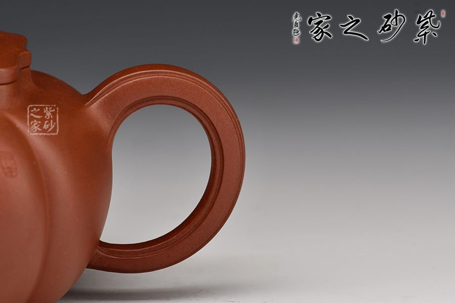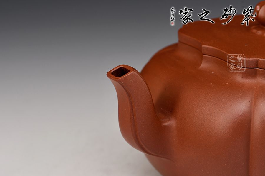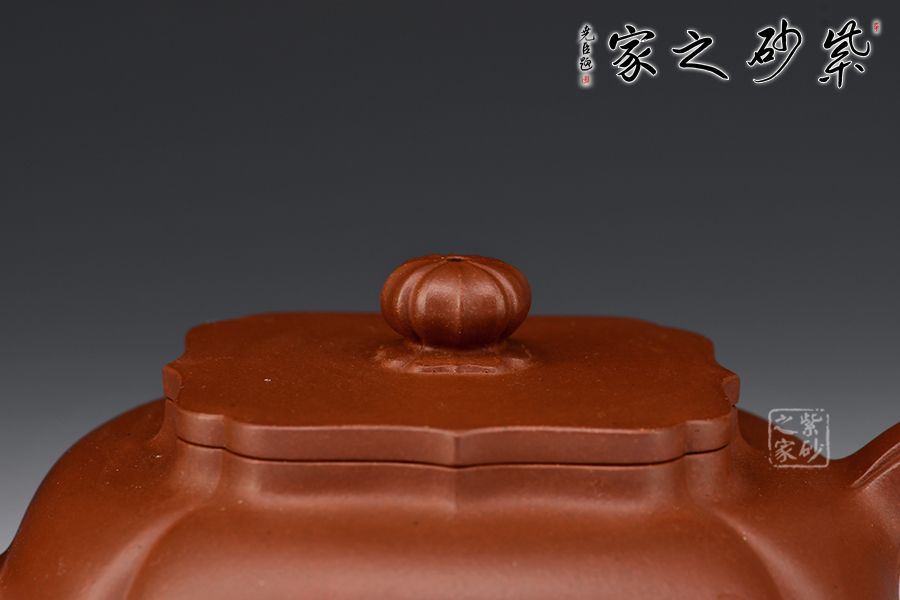 壺身分為四瓣筋囊,作扁球狀,三彎流,正耳把式,蓋沿較短略似海棠形,銜接緊密且面面皆可嚴絲合縫。壺鈕乃點睛之筆,筋紋線條裝飾,形似花骨朵,十分小巧可愛!