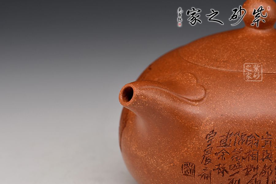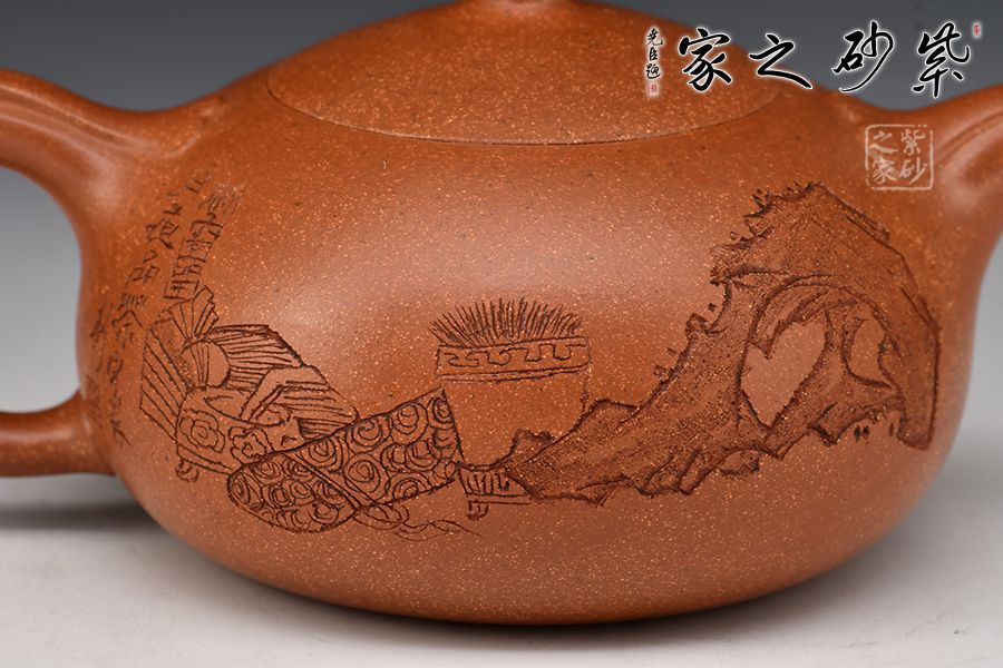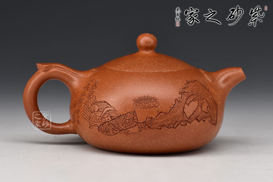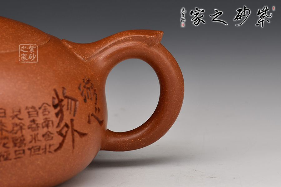 此壺造型簡(jiǎn)練優(yōu)美,線條圓潤(rùn)豐滿,如嬌美的少女。壺鈕以一粒珠飾之,典雅的裝扮出倒把壺增添成熟與雅致。壺嘴、壺把祥云紋裝飾,逸趣橫生,把玩與使用皆備。