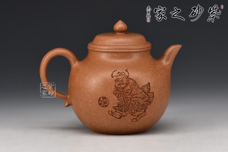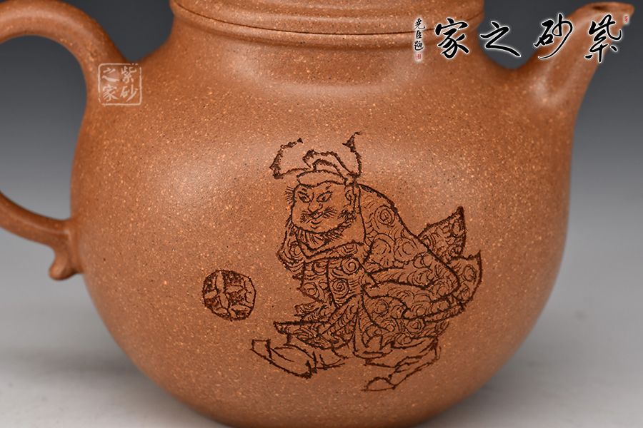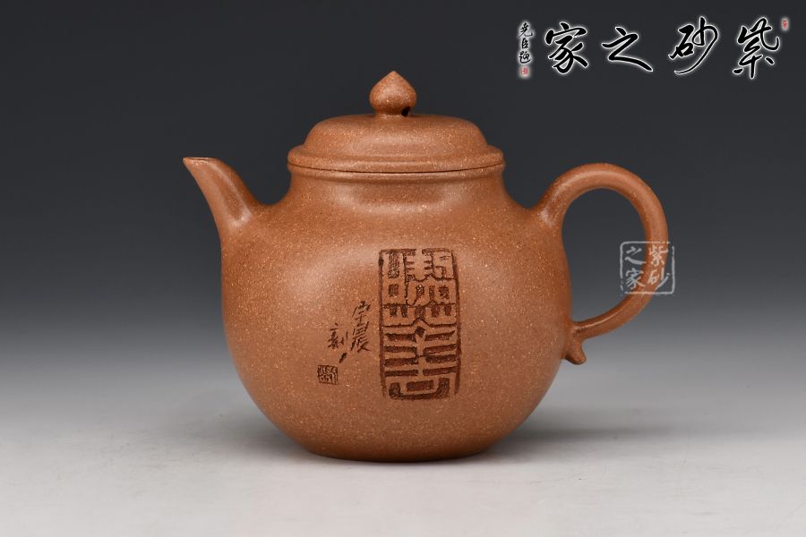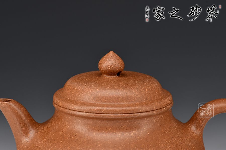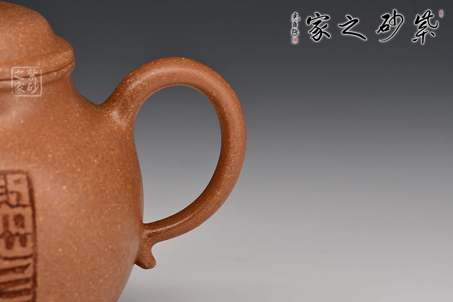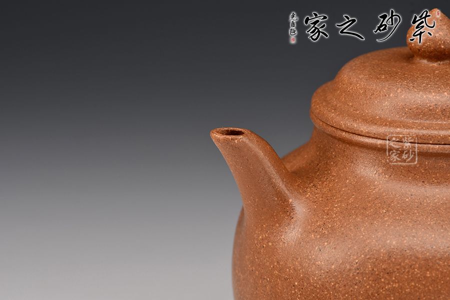 此壺圓潤(rùn)飽滿,壺嘴修長(zhǎng),壺把寬闊,壺鈕尖尖。壓蓋造型,子母線契合緊密,頗具立體感。壺嘴、壺把與壺蓋和諧統(tǒng)一,壺體各部分有優(yōu)美比例,表現(xiàn)出精湛的制作技巧和優(yōu)良的實(shí)用功能。