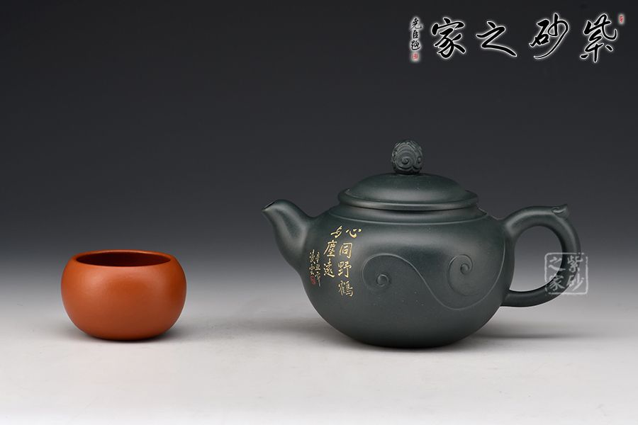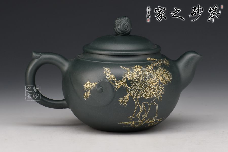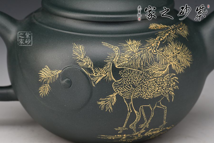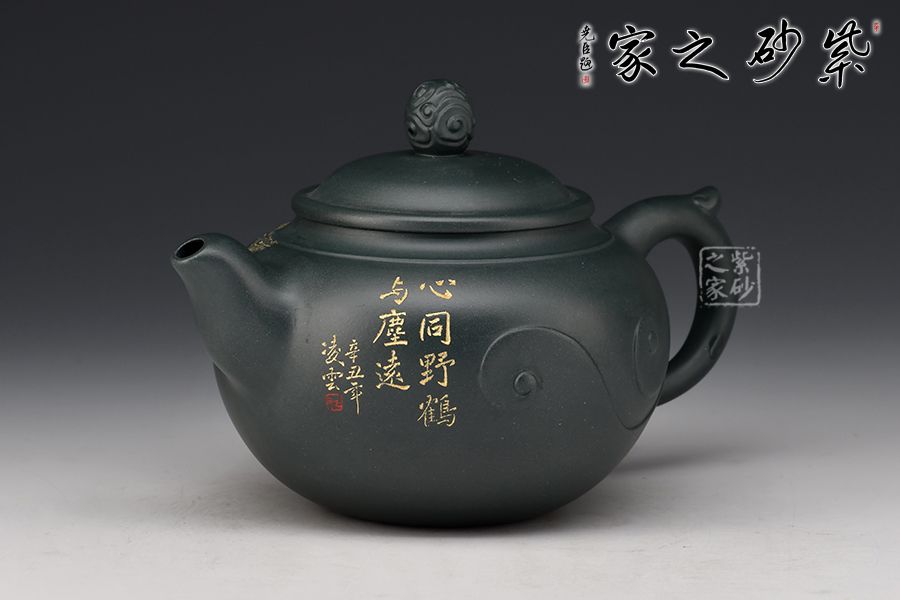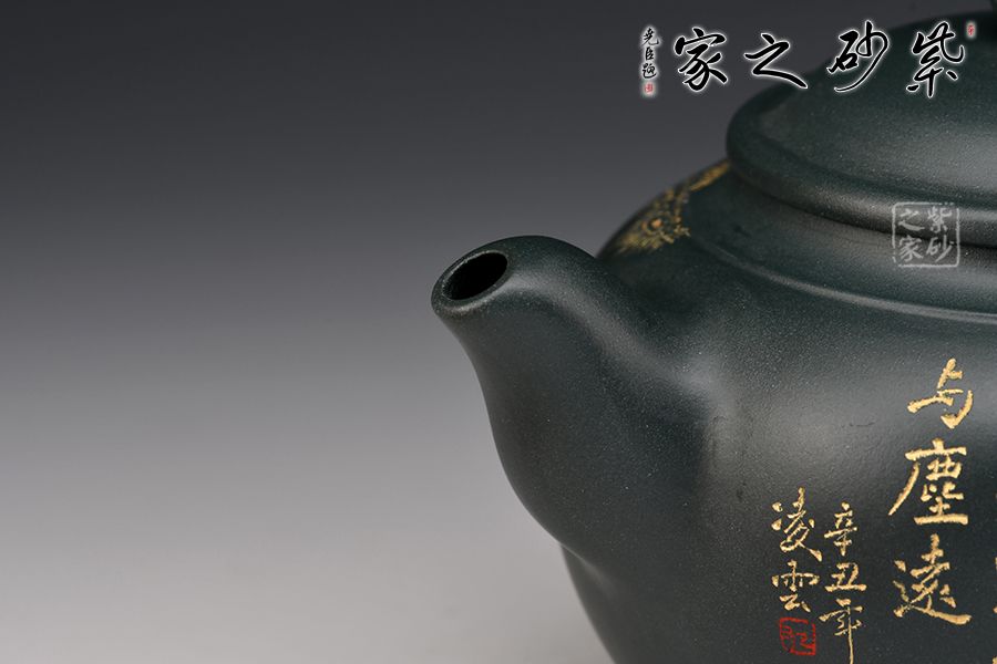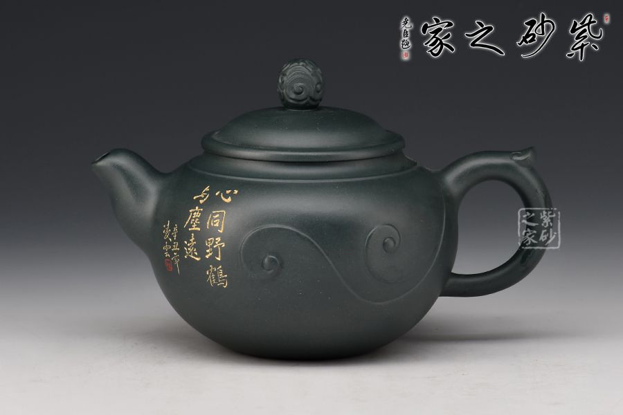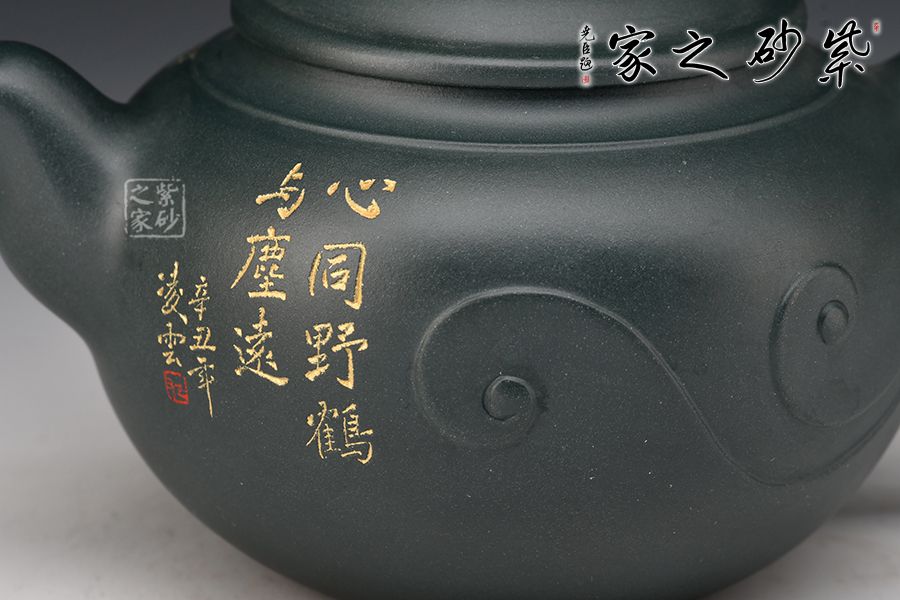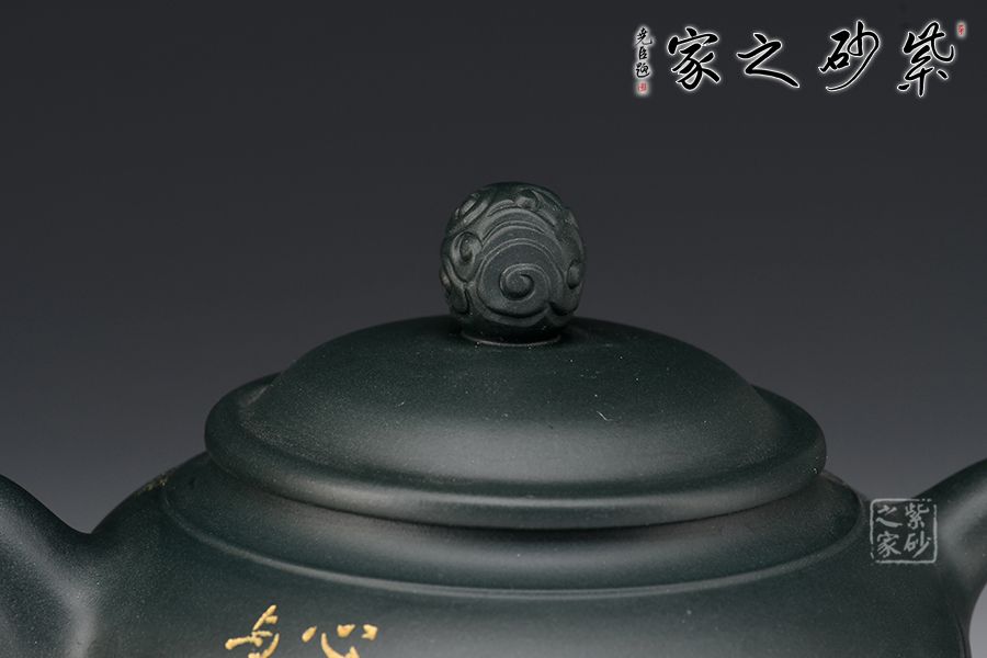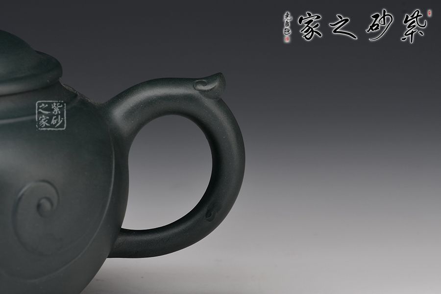 此壺壺身圓潤飽滿,上豐下斂,壺肩處線條自然明確,彎流壺嘴胥出,出水干凈利落,平蓋與如意造型壺鈕,協(xié)調(diào)一致,與壺身渾若一體,自然美觀。壺器整體大氣雅致,線條流暢清晰,秀韻至。