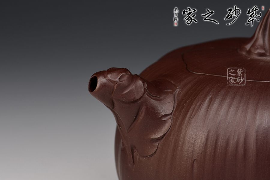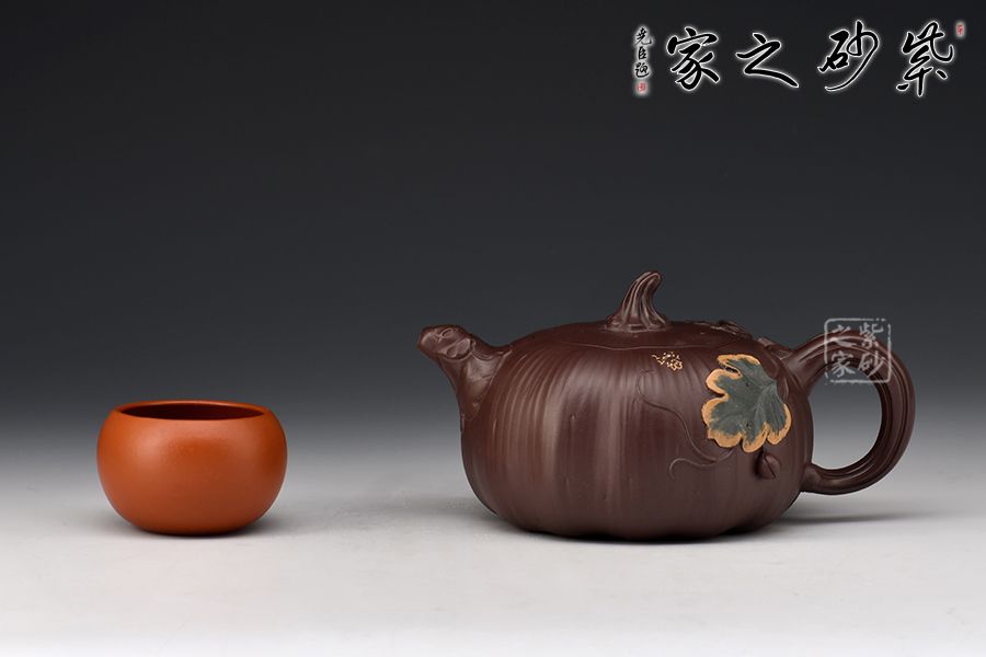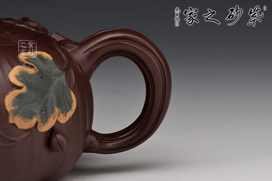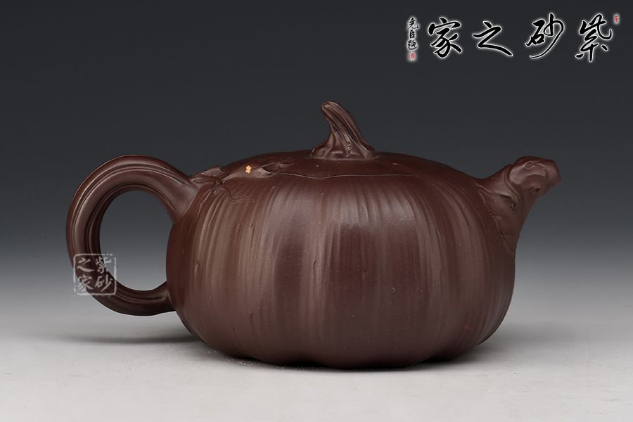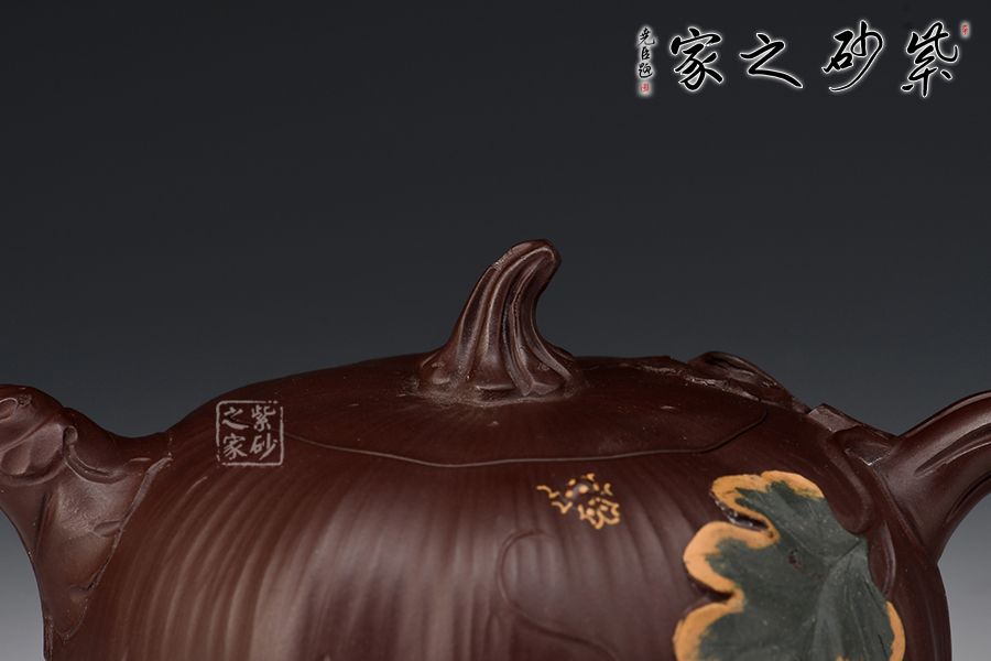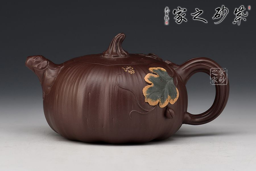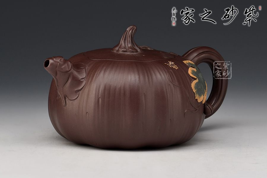 南瓜壺是紫砂壺中很常見的一種款型。此南瓜不僅外形酷似南瓜,更是集聚了南瓜的神韻,猶若瓜熟即將待落。壺鈕、壺把嫉皆以南瓜藤為原型,形象逼真。壺嘴則若南瓜葉包裹而成,精巧別致。壺把處一南瓜葉子胥出,蒼老卻不失神氣。