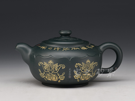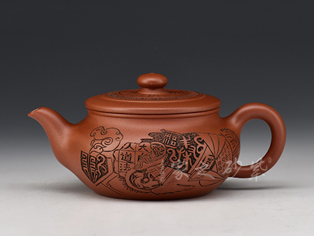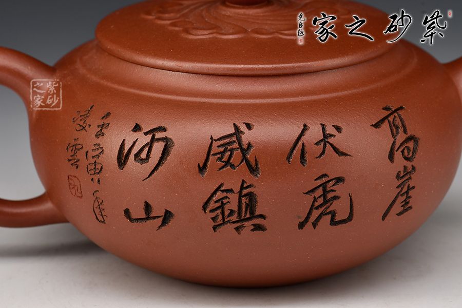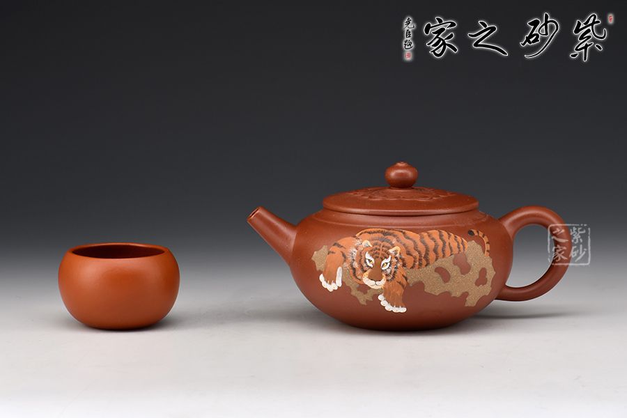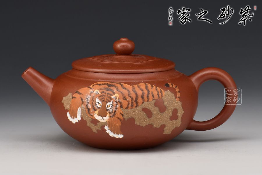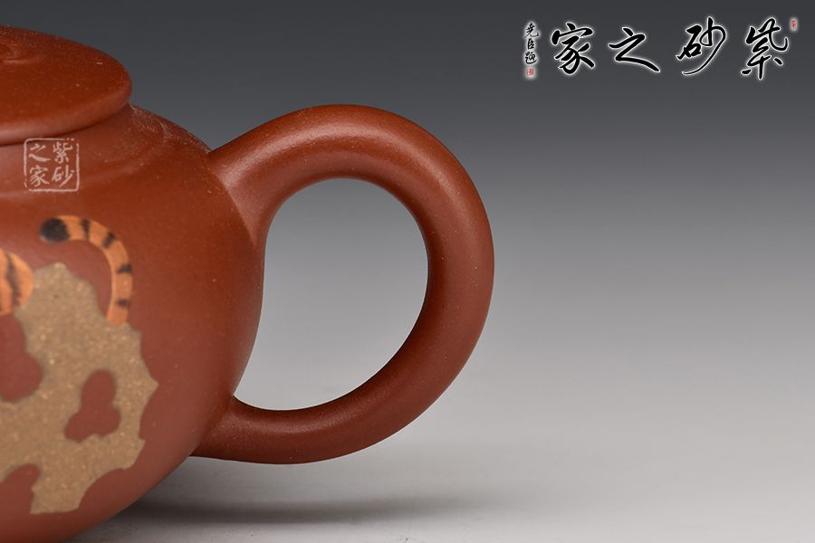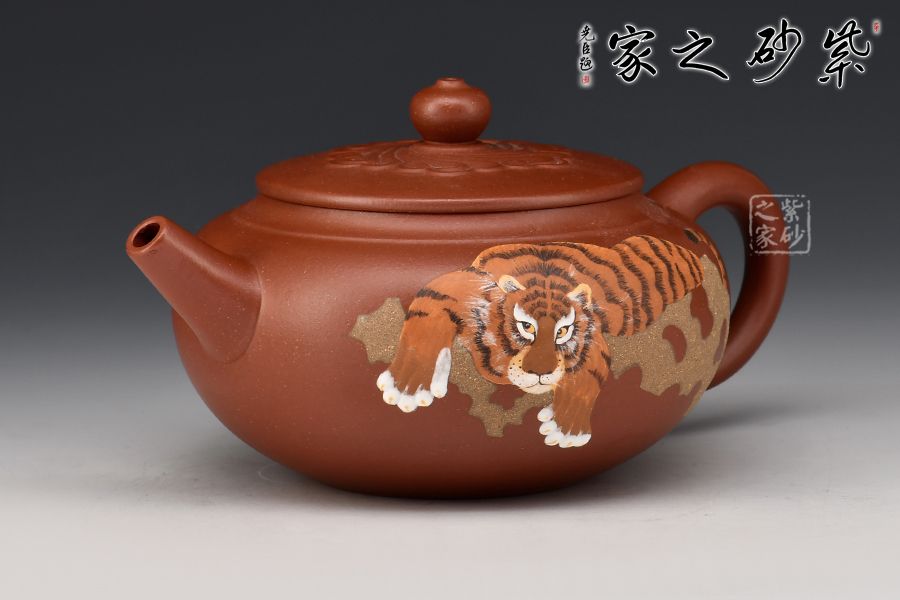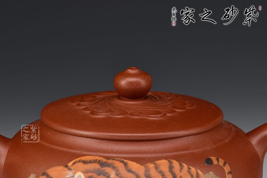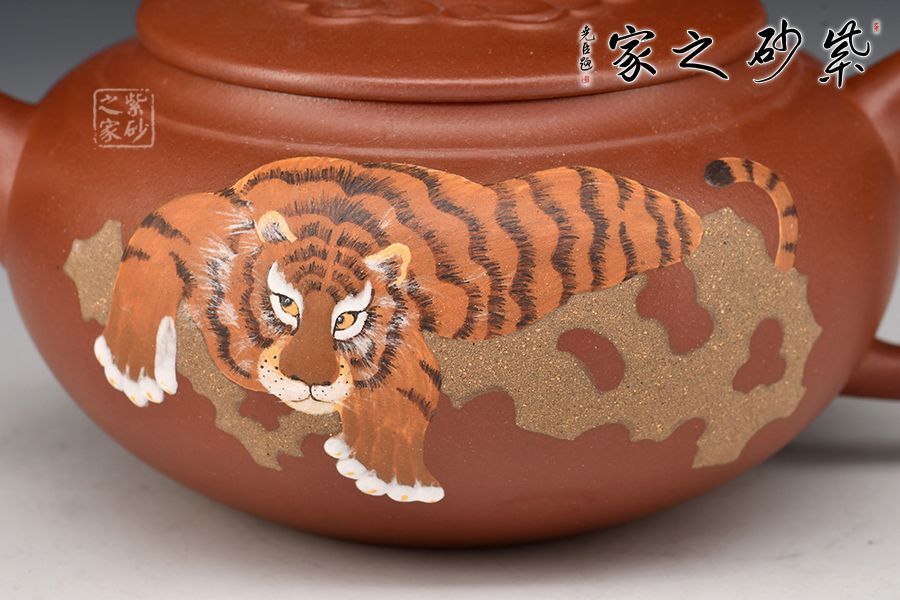 此壺以中國傳統(tǒng)文化中富有吉祥之意的如意為主題,壺蓋之上、壺鈕周圍以一對相扣的如意為裝飾,整款壺以扁圓端莊為基本造型,表達濃濃真情,為世人所喜愛。直流壺嘴出水順暢,耳形壺把拿捏舒適。壺身伏虎圖氣勢恢宏,與背面刻繪“高崖伏虎 威鎮(zhèn)河山”相呼應。