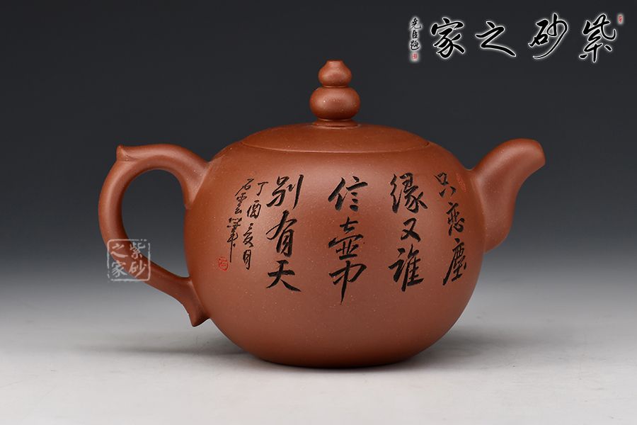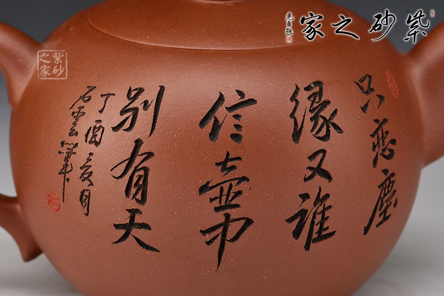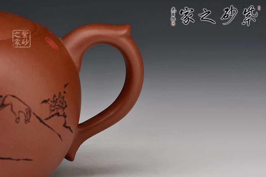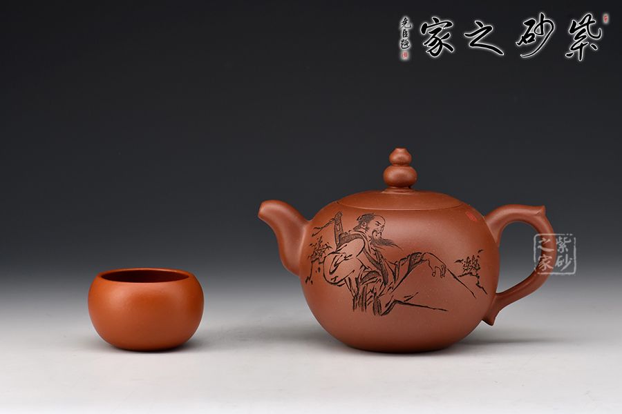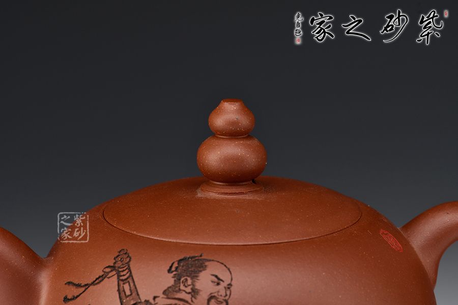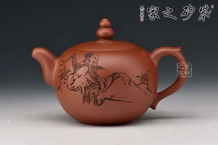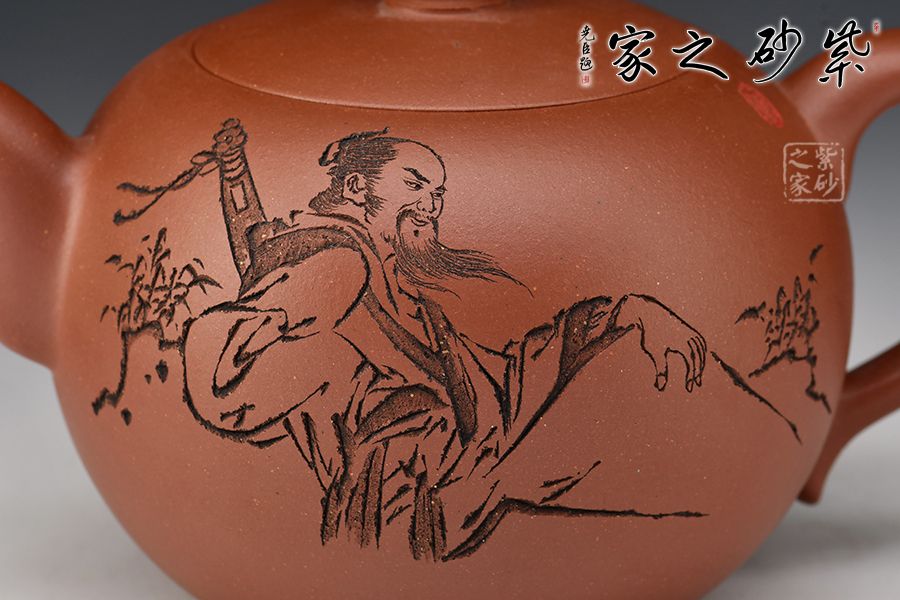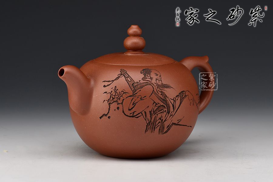 此壺壺體圓潤,腰下漸收,線條流暢舒展,權衡比例協(xié)調(diào)秀美。壺鈕呈葫蘆狀,亭亭玉立。彎流壺嘴與小飛把相呼應。壺身一面刻繪老者迎風而坐,飄逸自然,一面刻繪“只戀塵緣,又誰信壺中別有天”。