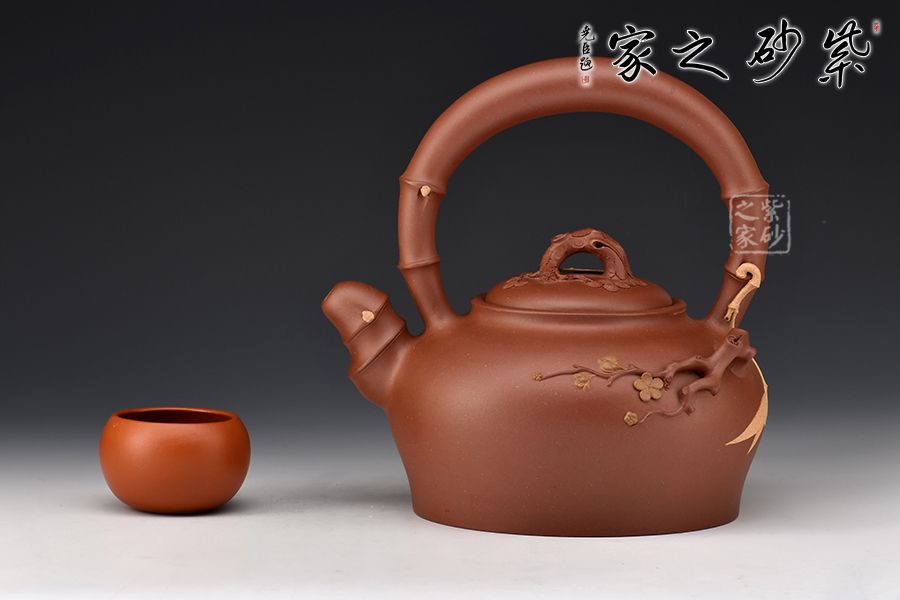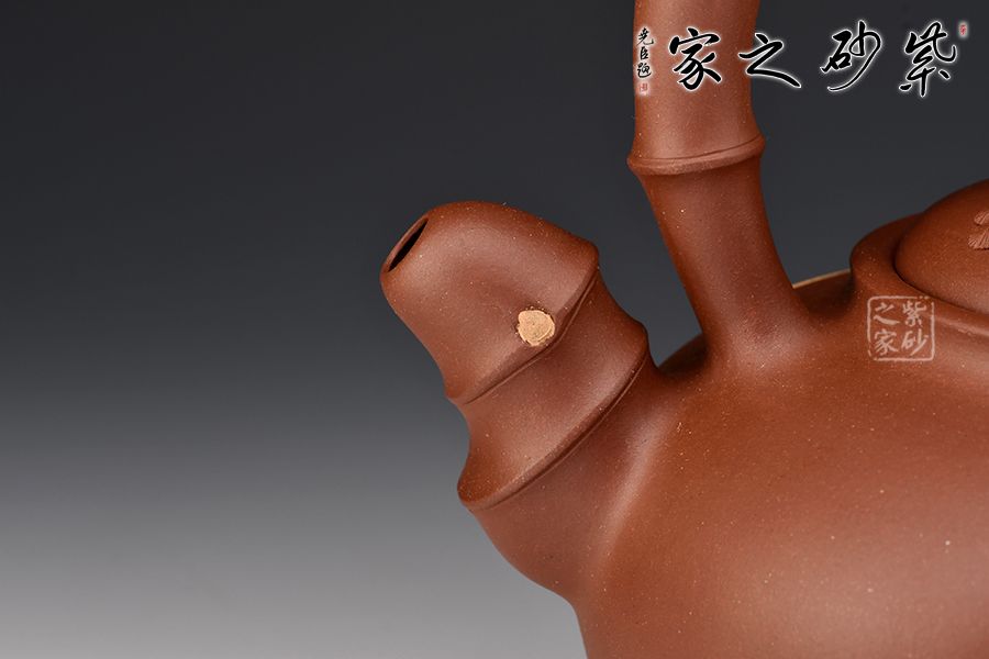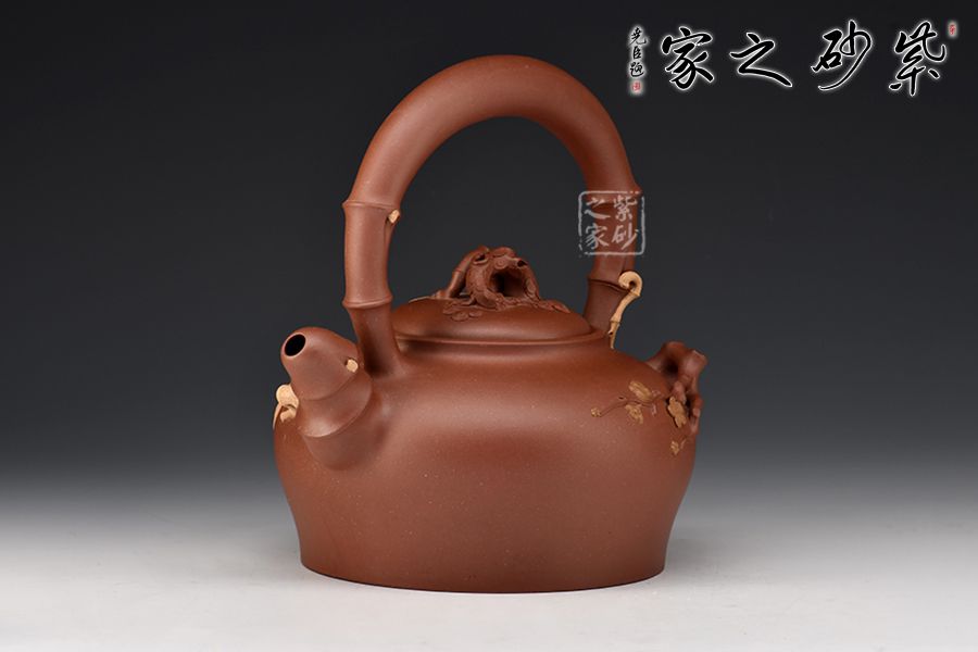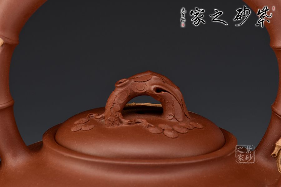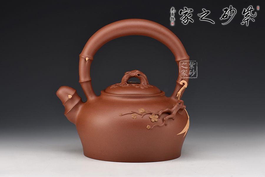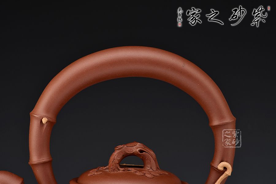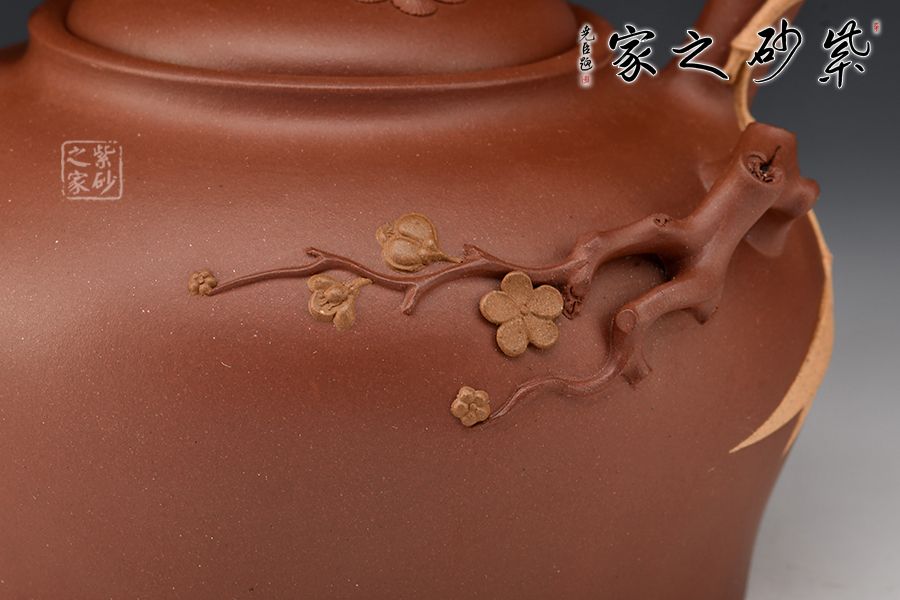 此壺取松竹梅中的“梅、竹”為題材,整器清新自然,含蓄內(nèi)斂。壺身圓潤(rùn)淡雅,竹段提梁上嫁接梅段延伸至壺身,流暢自然。嵌蓋鼓起,梅樁為鈕,蓋面貼塑朵朵梅花,清新可愛(ài)。飽滿的竹段嘴與整器極度和諧,令人心生清風(fēng)。整壺線條飽滿,將梅、竹融洽展現(xiàn)于一把紫砂壺上,通過(guò)細(xì)節(jié)設(shè)計(jì),使梅竹相連,蒼勁的竹段、盤(pán)繞的梅枝間,星星點(diǎn)點(diǎn)梅花傲然獨(dú)放,給人一種雅致清絕之感,韻味飽滿而悠長(zhǎng),是為文人茶客所愛(ài),值得收藏。