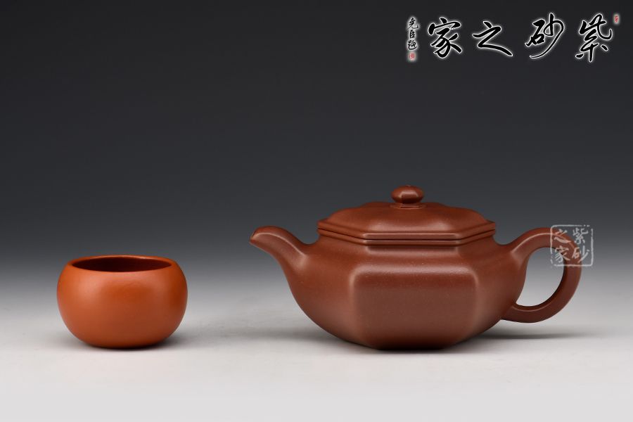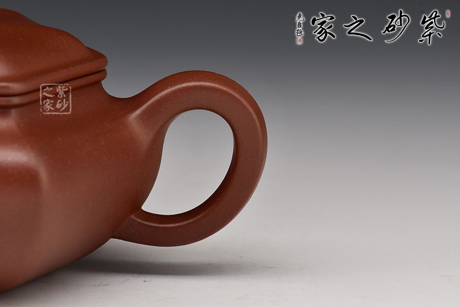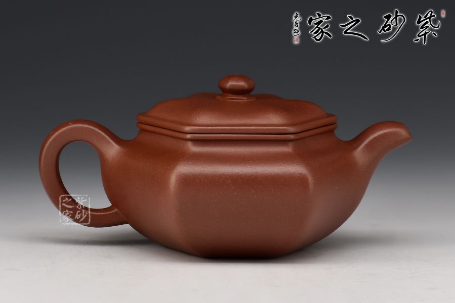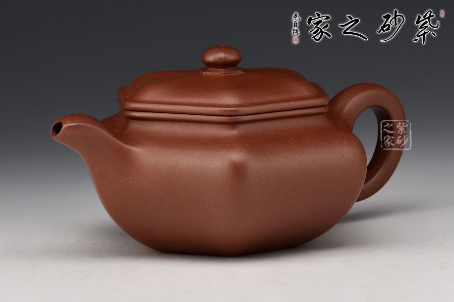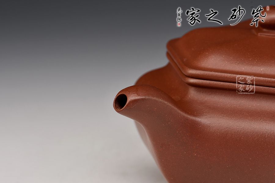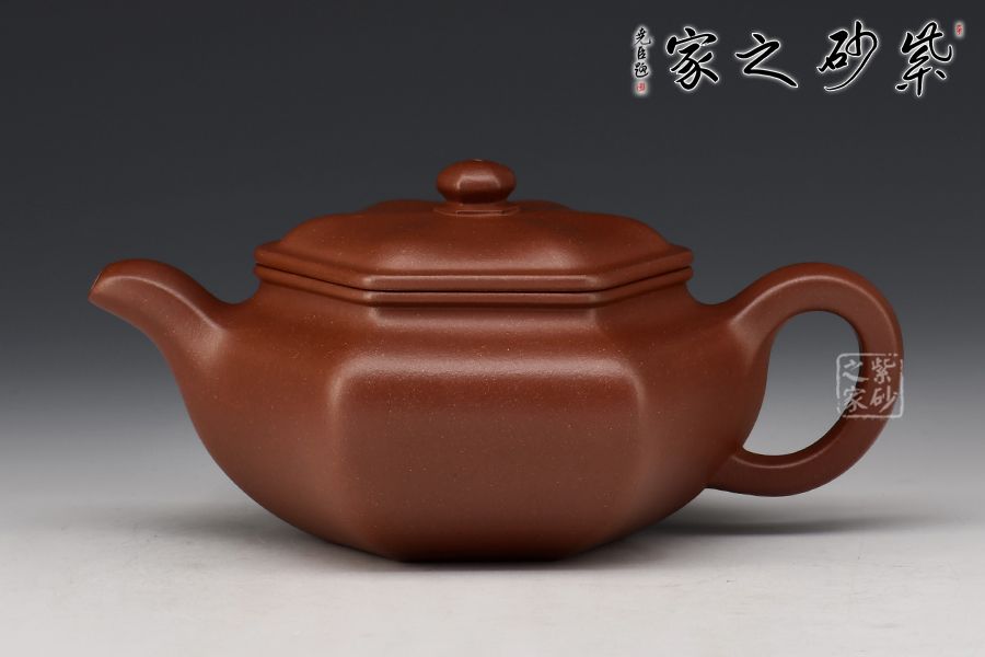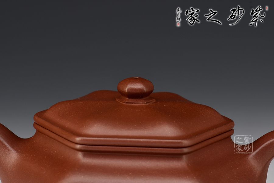 扁腹壺形為紫砂壺傳統(tǒng)樣式,此壺在中又加上六方造型,嘴微彎,壺身線條流暢,傳統(tǒng)韻味十足。壺身扁韻有致,下身的弧度與平肩形成鮮明對(duì)比,顯得典雅絕俗。此扁腹壺在流與壺體銜接處做得有如天成,小巧而不失勁道。