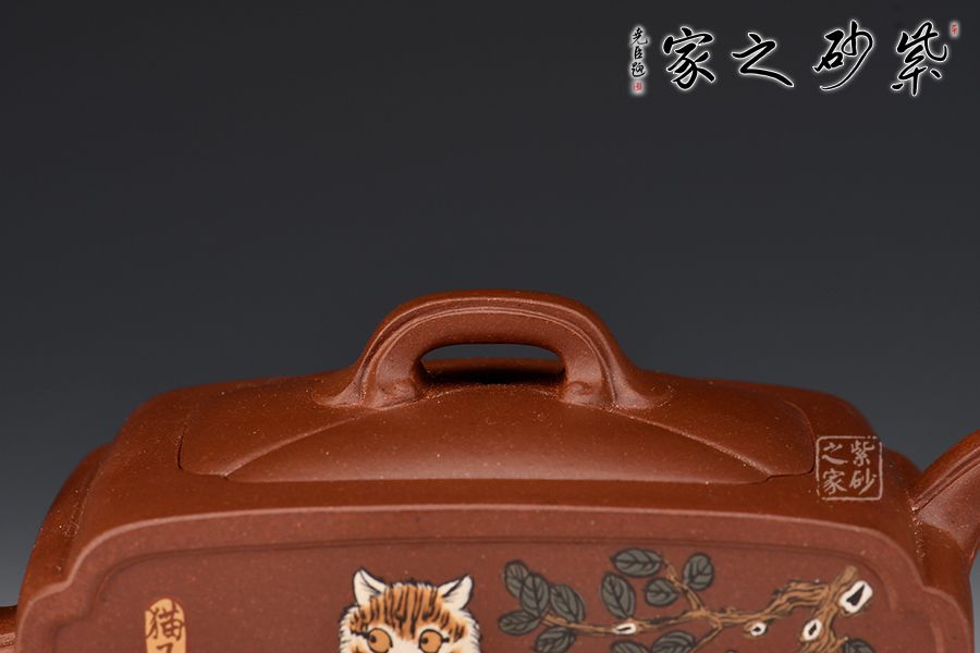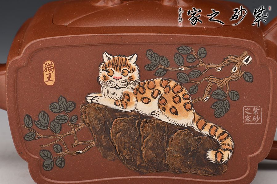楊瑤芬老師這款小橋流水壺可謂是創(chuàng)新新穎,造型美觀。這把壺采用泥繪制壺工藝,勾勒一幅優(yōu)美的壺中之畫,貓咪,憨態(tài)可掬,活靈活現(xiàn)。細觀此壺,壺身方有有圓,圓中有方,線條流暢。拱形橋鈕,方便拿捏,四方三彎嘴,耳把暗接壺身。此壺,藝術(shù)氣息濃厚,值得珍藏。
