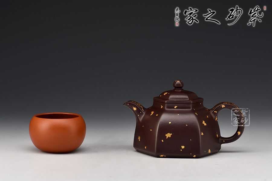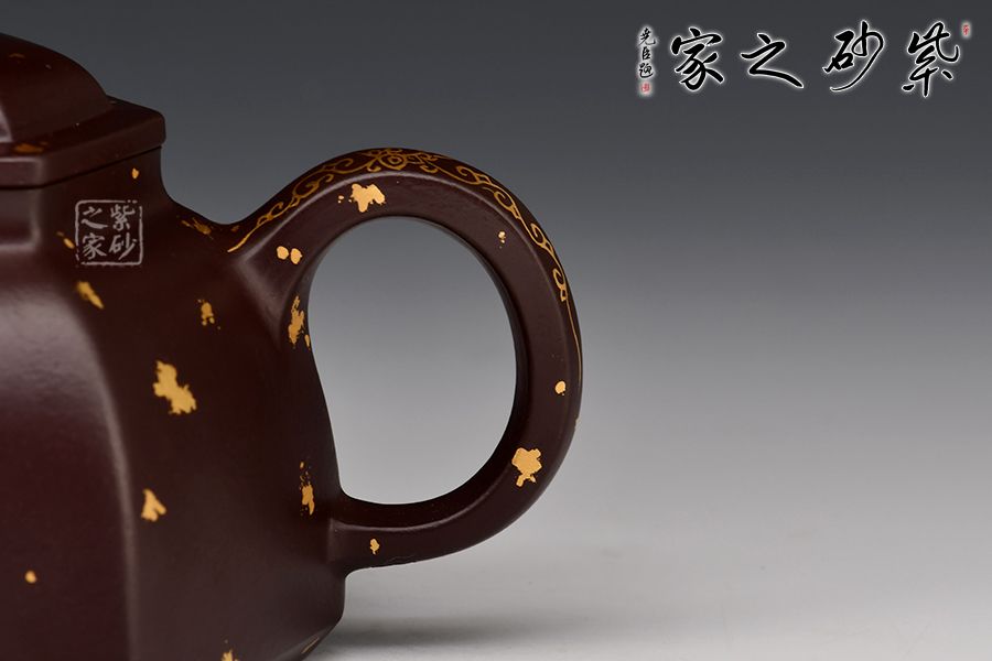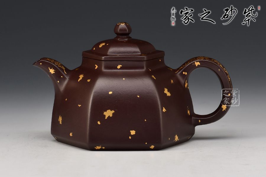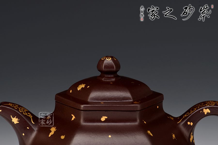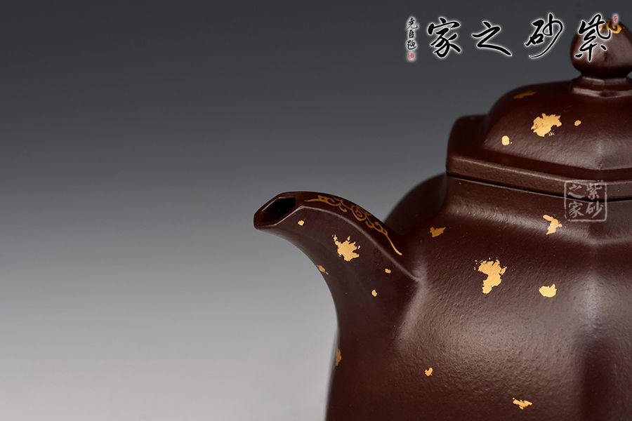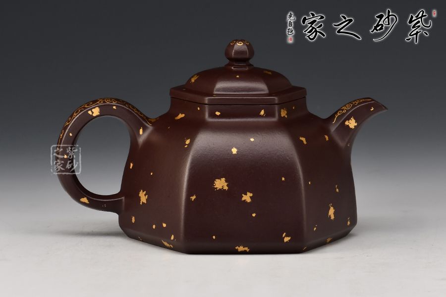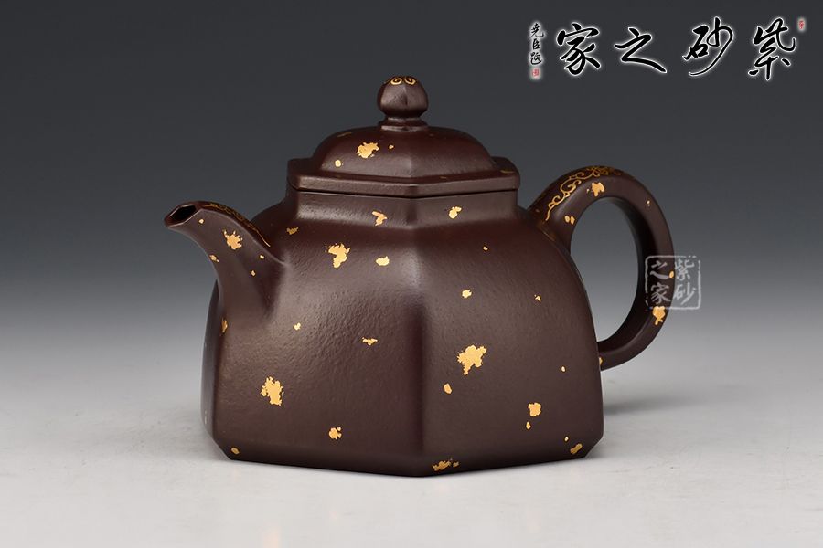 六方金鐘是方器中最常見(jiàn)的器型之一, 此六方金鐘是楊瑤芬老師繁星系列之一。壺鈕狀似倒掛的方鐘,大方的耳把,線(xiàn)條明朗流暢的三彎流舌口嘴。壺身每一個(gè)平面都挺括有力,壺蓋微隆,的子與壺蓋之間有鈕座相連。器型整體器宇軒昂,大氣凜然。整壺灑金裝點(diǎn),富貴華麗,真乃收藏佳品!