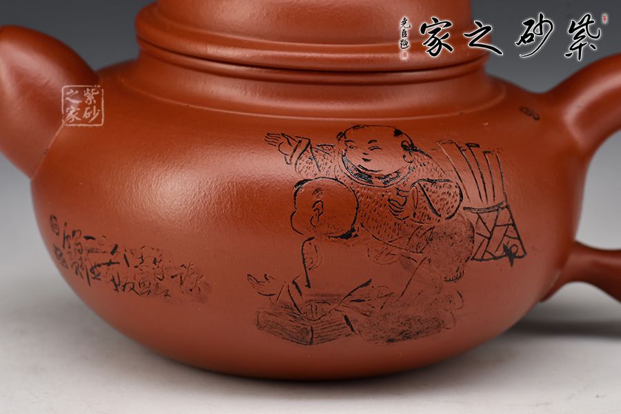 此款玉珠壺精選大紅袍泥料制作而成。整體線條過渡自然,雙線而為,層次分明。底部平滑且工整,肩頸富有變化。整體圓潤精巧,古典優(yōu)美,富有靈氣。正高級工藝美術師何忍群刻繪,筆力飄逸,情趣韻味優(yōu)雅,值得賞藏。