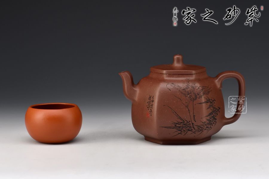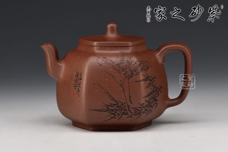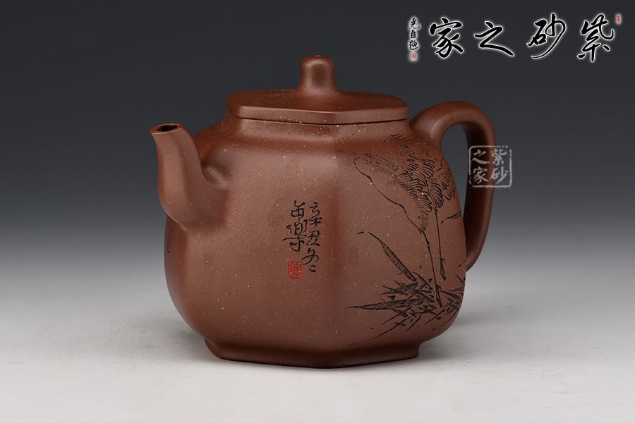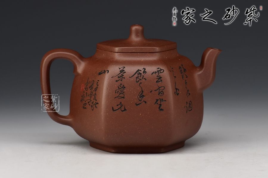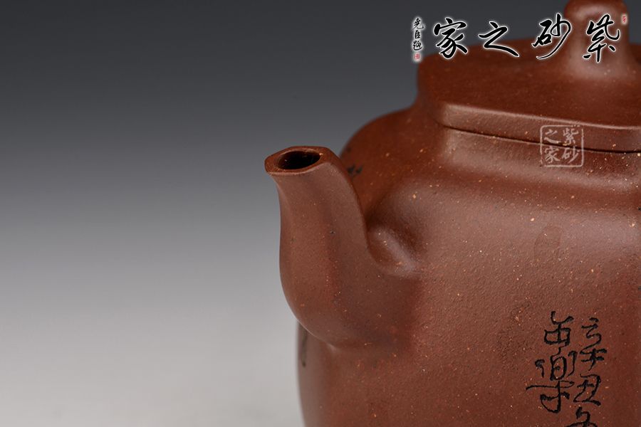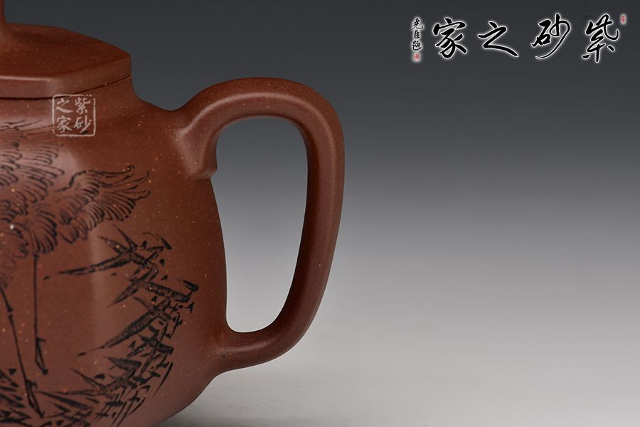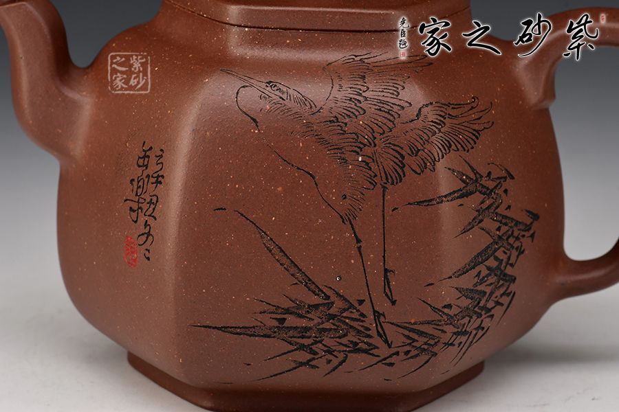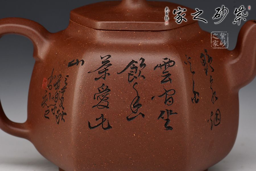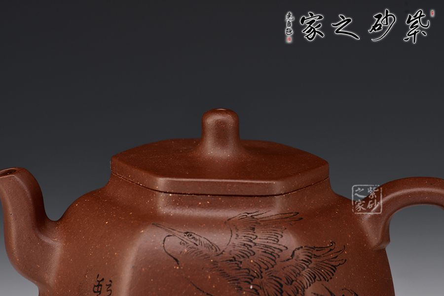 乳鼎六方精選原礦底槽青為胎,色澤古樸,好泡養(yǎng);壺身呈六方形,折角過渡圓潤,線條流暢,折肩直頸,口蓋吻合嚴密,蓋上加泥片做出梯形效果,壺鈕以棱線裝飾;流把起棱線,方圓相濟,弧度優(yōu)美,過渡自然。毛國強高徒范小軍雙面陶刻,正面陶刻少女、荷花、池塘,反面陶刻去年今日此門中,人面桃花相映紅。