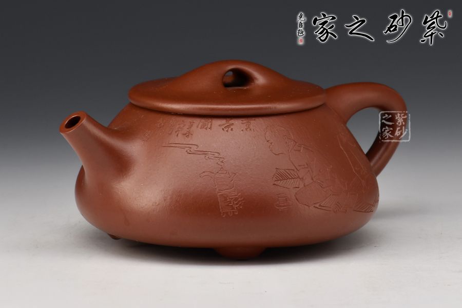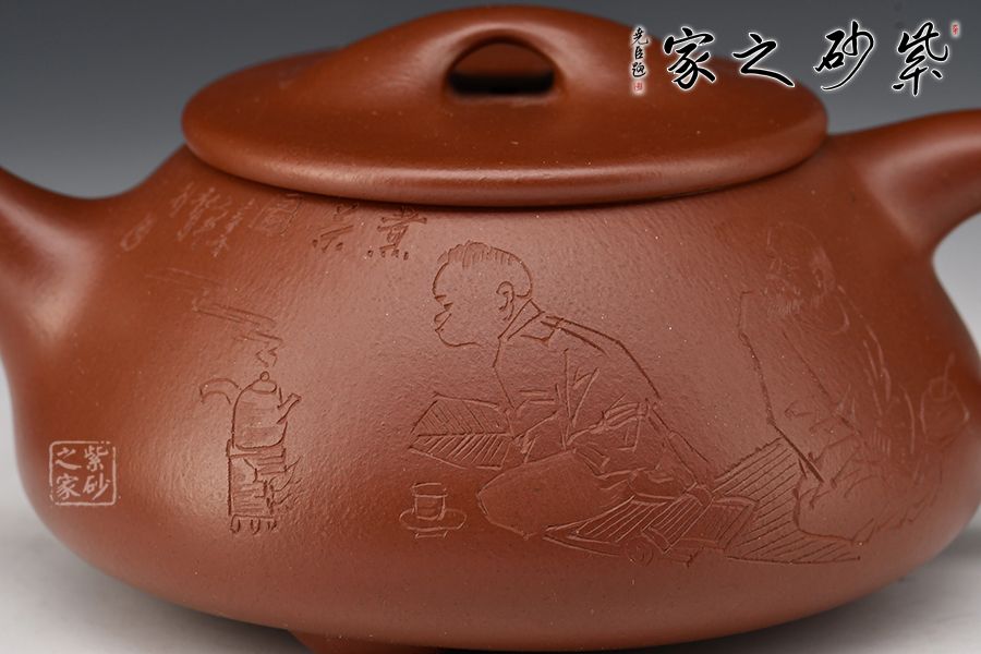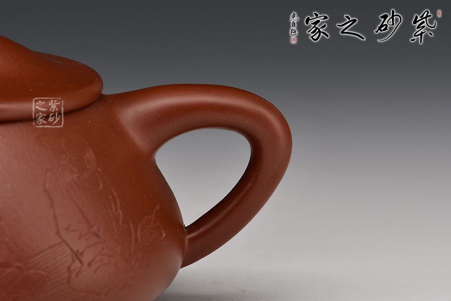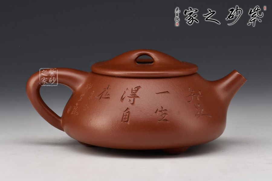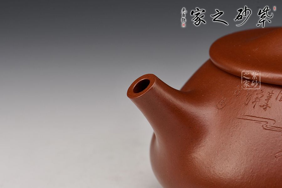 此壺為作者摹古而作,以景舟石瓢為型,紫朱泥作胎,全手工精制而成,泥色溫潤古雅,造型簡約大方。壺身呈八字造型,豐潤飽滿,曲線柔和流暢,平壓蓋、橋鈕,拿取自如,直流簡而有力,出水順暢,壺把上豐下斂,與壺身之型形成和諧的美學(xué)效果,底部三乳足給人以輕靈而穩(wěn)重之感。整器比例精湛,骨肉亭勻,氣韻充沛,300cc黃金容量,是一把非常實(shí)用的品茶利器。