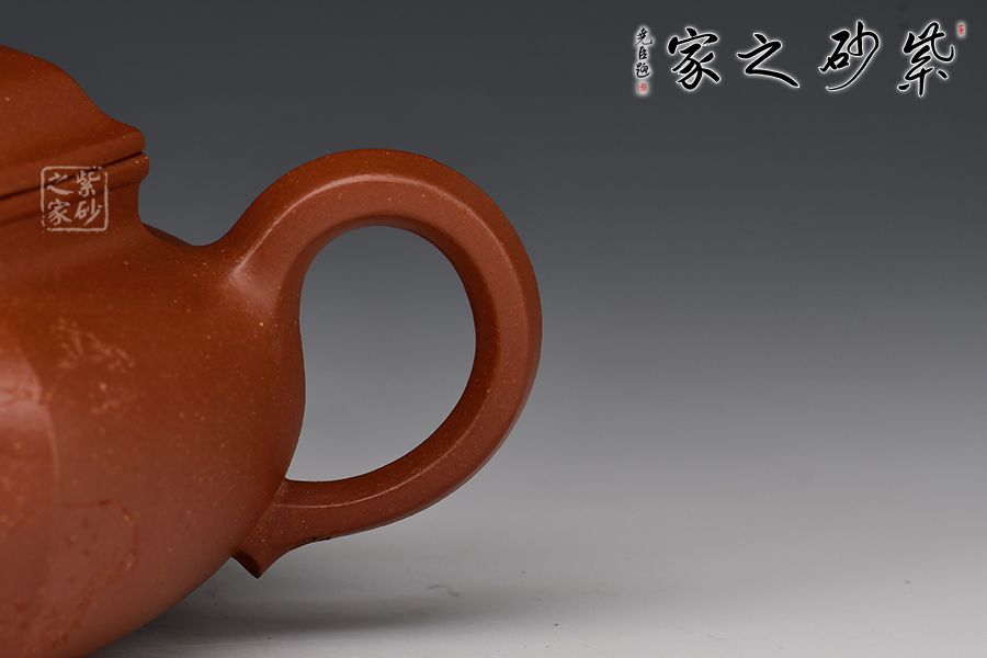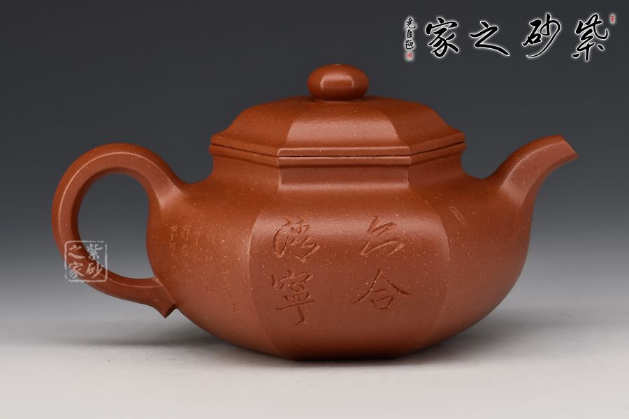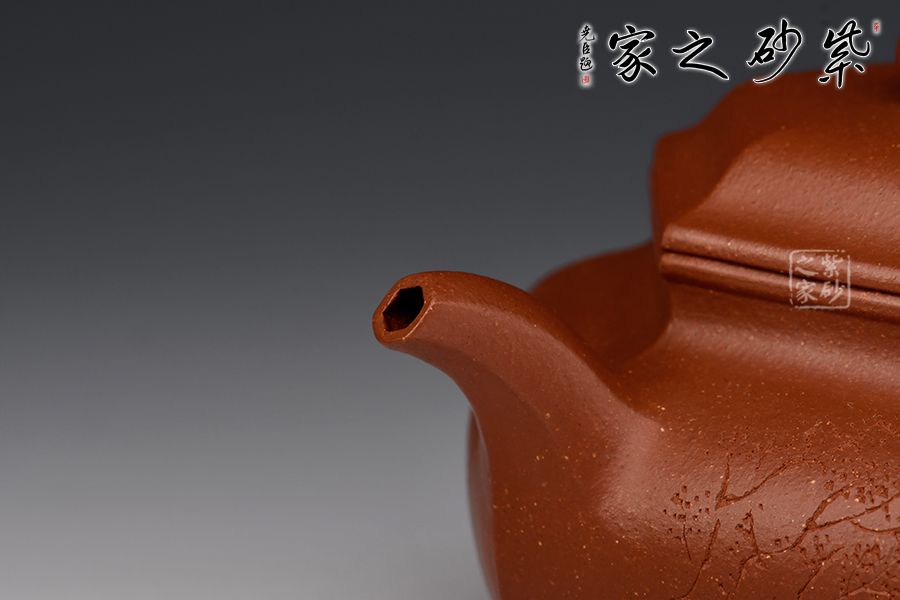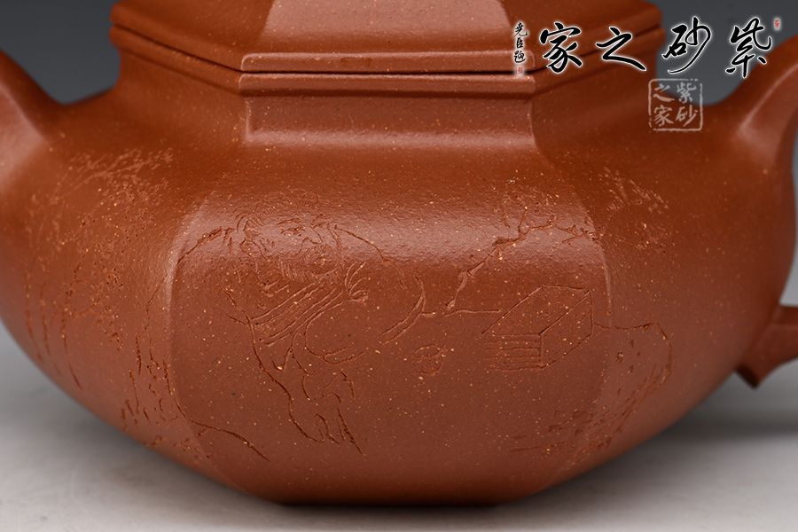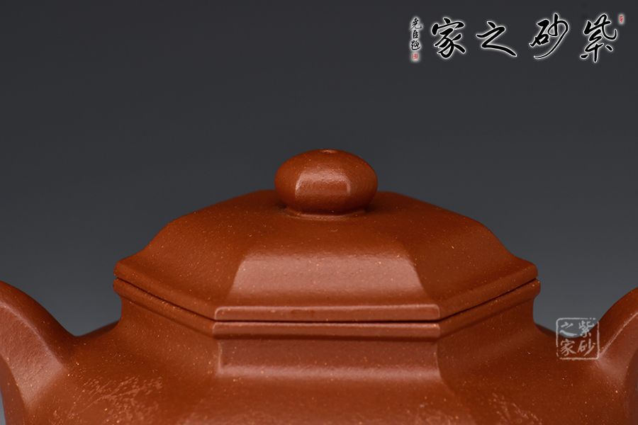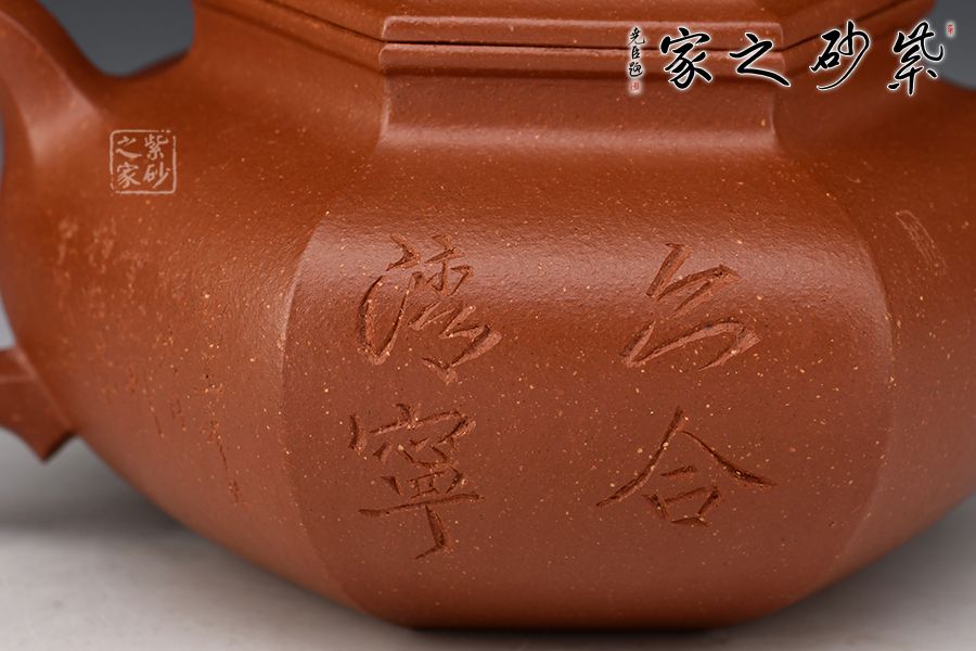 此款六方壺,制作難度很大,整器線條流暢,周正穩(wěn)健,六面鑲接成型,點線面清晰明確,鑲接線面挺括平正,輪廓線條分明,制壺手法干凈利落,成壺明快挺秀。彎流壺嘴,出水順暢;耳形壺把帶垂,彎曲有致。壺身與壺蓋緊密相連,口蓋轉動皆吻合緊密。