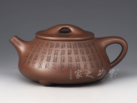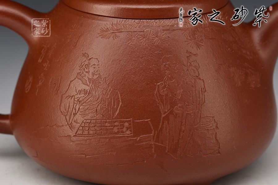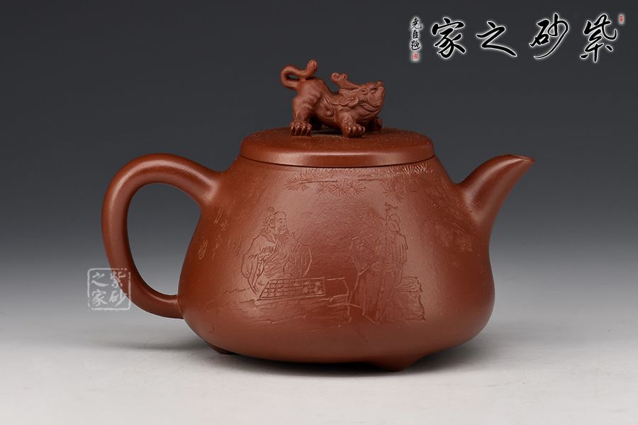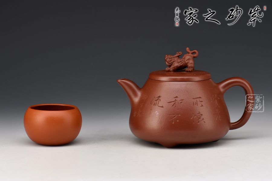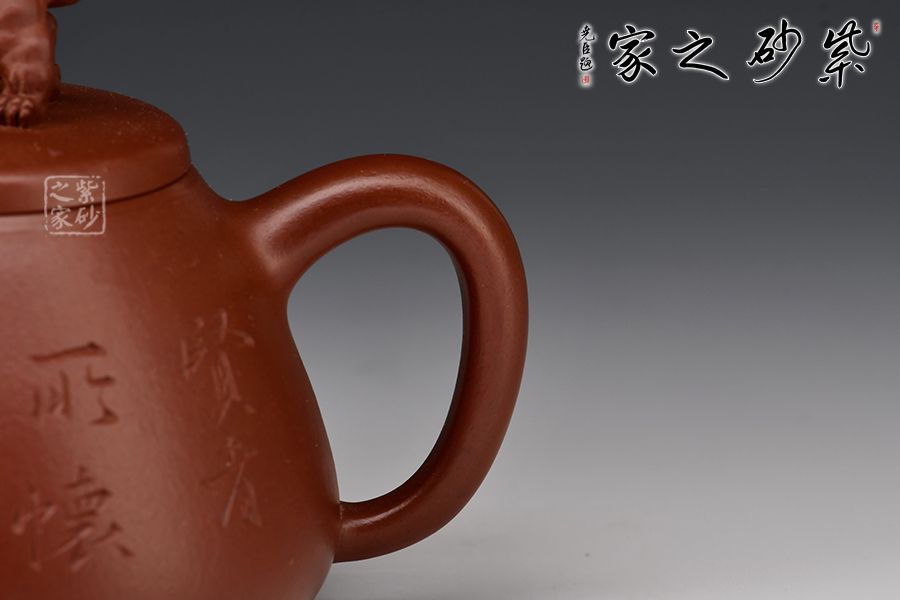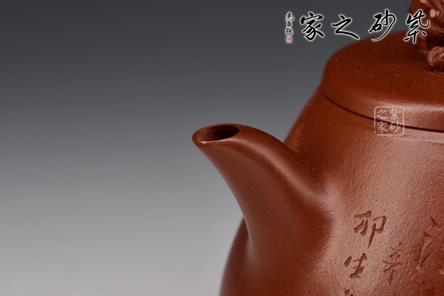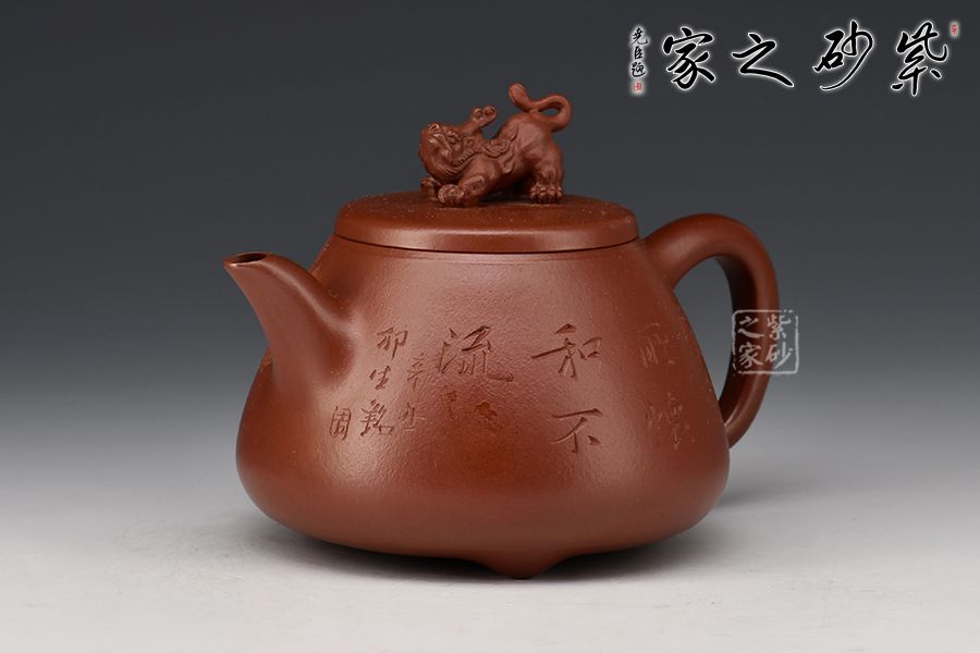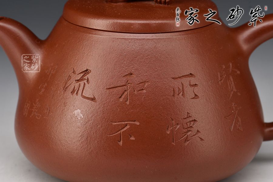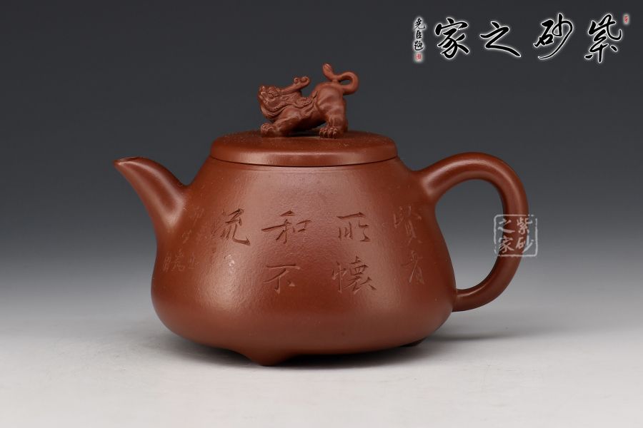 此壺名為祥瑞,寓意吉祥如意,壺身飽滿圓潤,一彎流線條優(yōu)美,出水爽快,耳把抓握舒適,壺鈕為一只瑞獸,神態(tài)栩栩如生,壓蓋與壺口貼合緊密,壺身刻繪:賢者所懷和不留,出自王羲之的《蘭亭序》,可見作者志趣之高,紫朱泥制作,色澤古樸溫潤,值得入手!