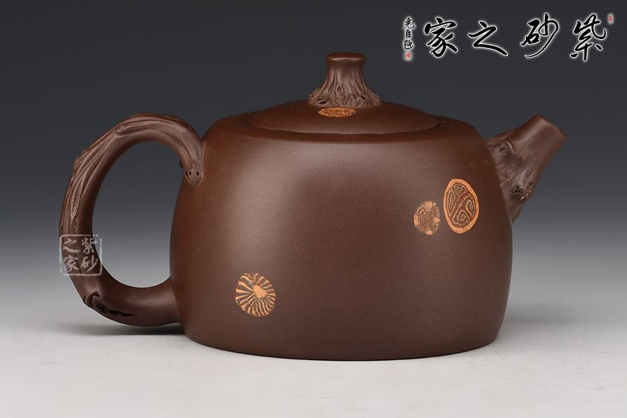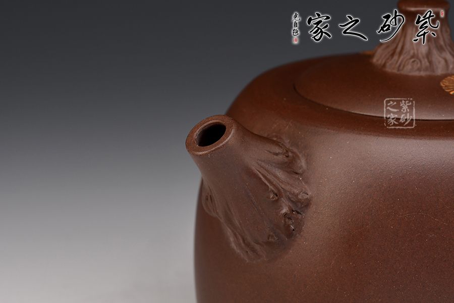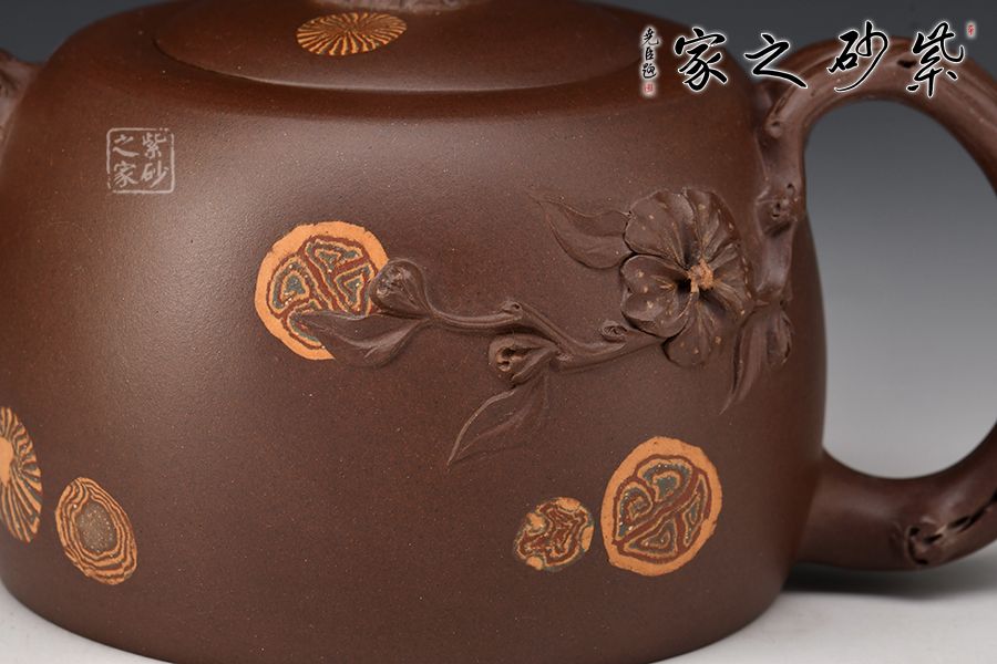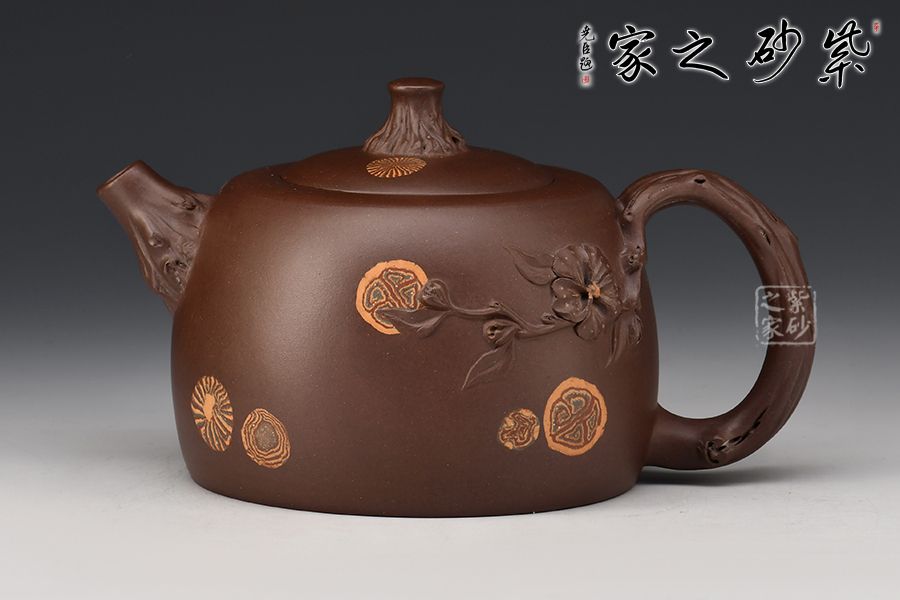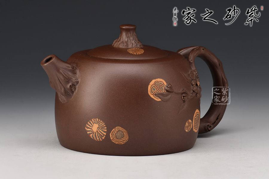 此壺名為“井櫻”,以櫻花為主題,邂逅春天。壺身圓柱狀,絞泥裝點(diǎn)。鈕、流、把化作櫻枝虬曲而出,姿態(tài)各異,壺把處延伸出一段櫻花枝干,朵朵櫻花盛開,雅韻橫生。