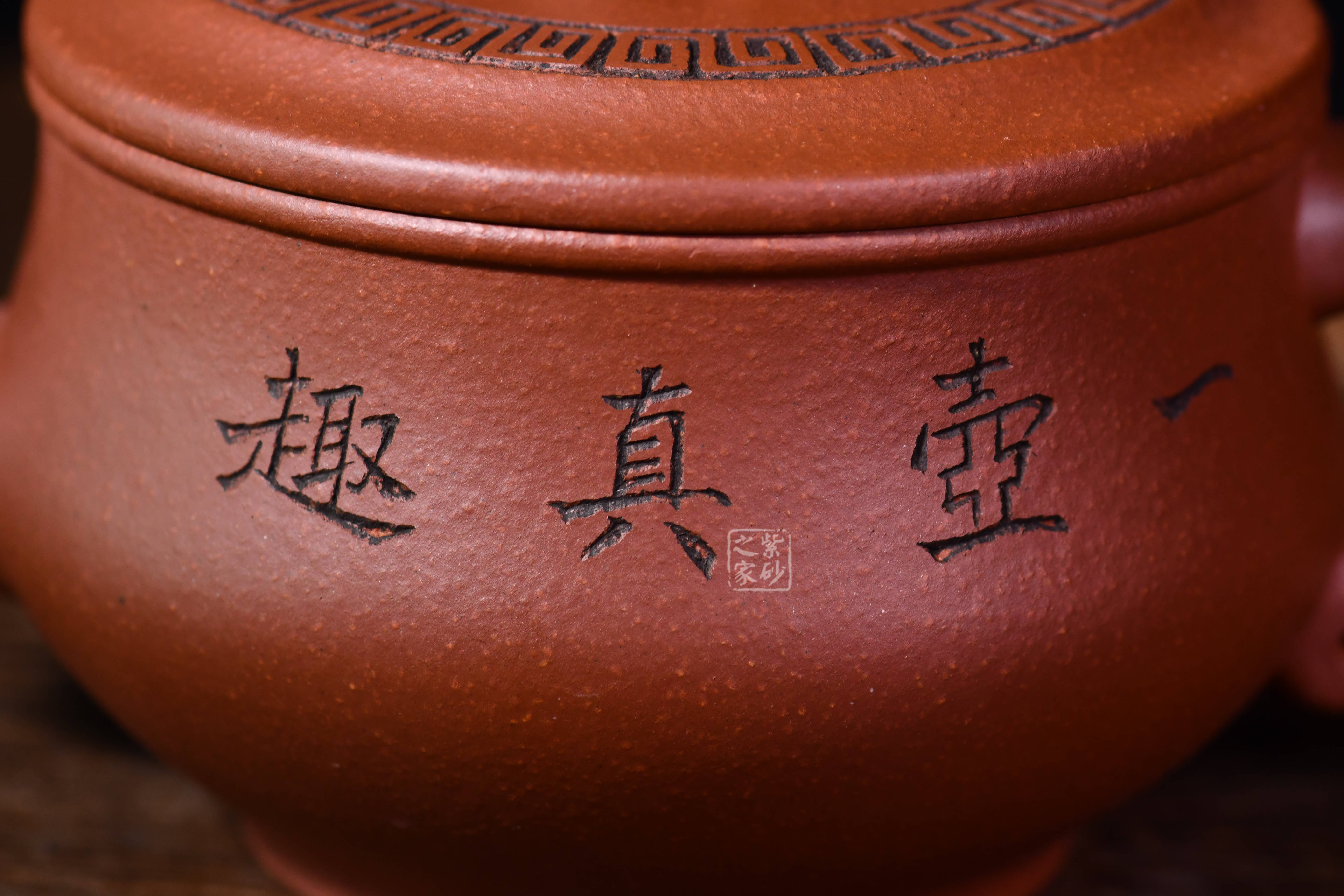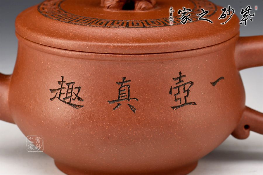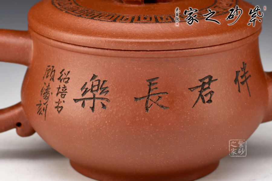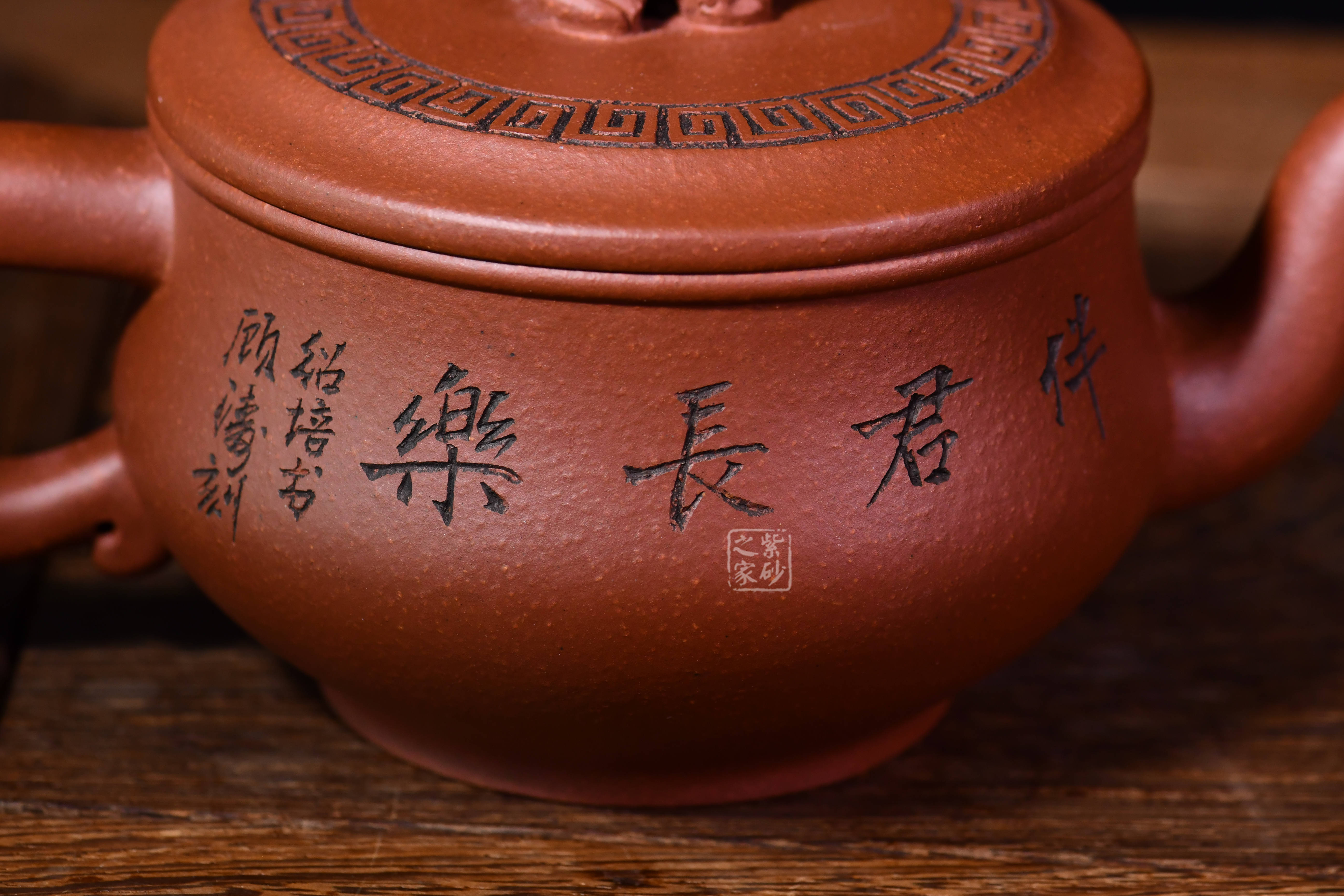 此壺為巾幗紫砂領(lǐng)軍人、顧紹培嫡女顧勤制,國(guó)大師顧紹培書題,正高工顧濤裝飾,壺身刻繪:一壺真趣,伴君常樂,與主題長(zhǎng)樂永春壺相呼應(yīng),大口蓋便于投茶,寓意好,三大師合作,升值潛力極大!