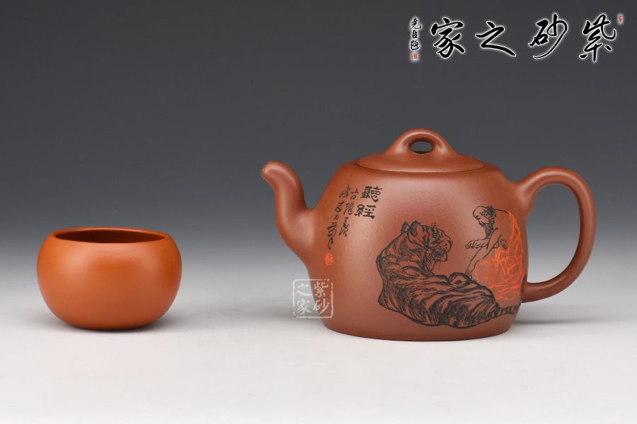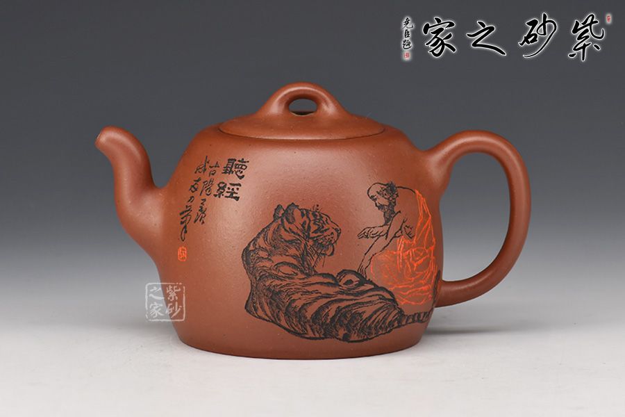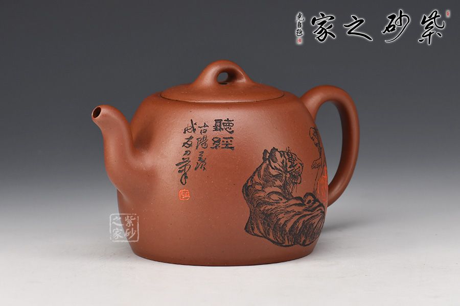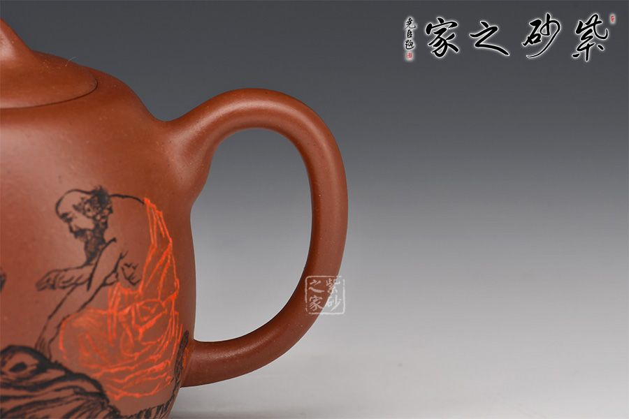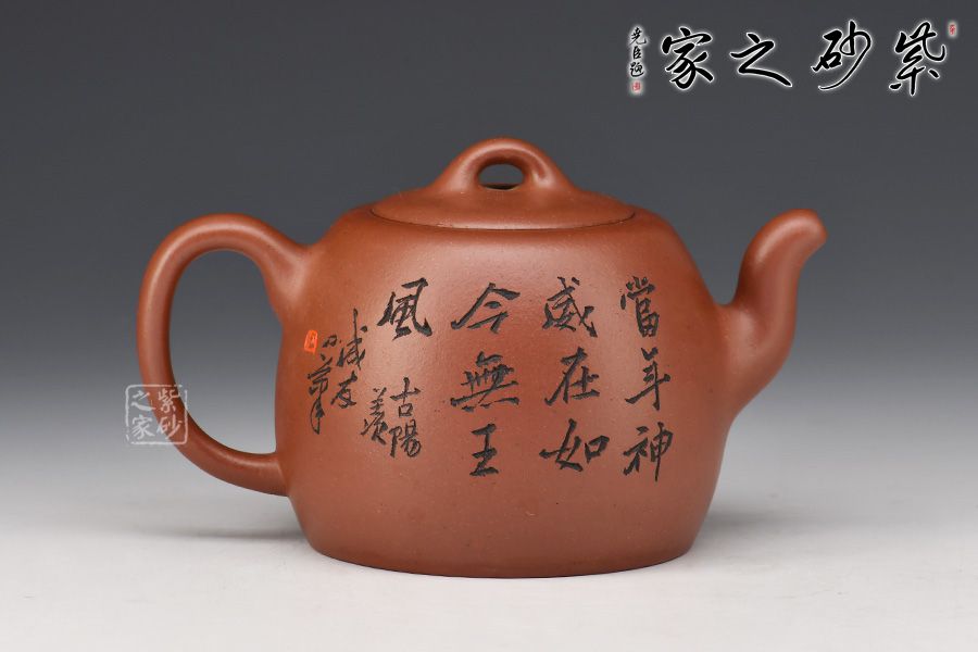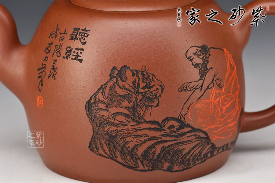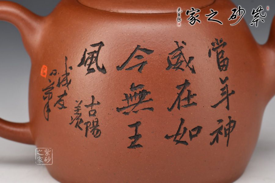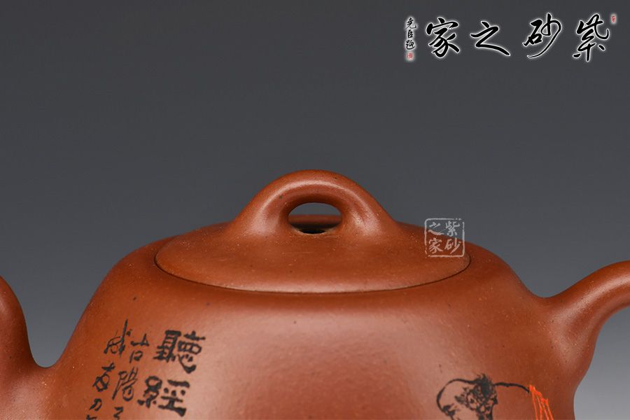 嵌蓋緊密留茗香,蓋面中間略鼓起,其上橋型鈕,挺拔大氣有力度。壺身裝飾圖案書法銘文,其爽勁快意的筆法,出神入化的篆刻,與壺體氣韻貫通,且蘊(yùn)意美滿。