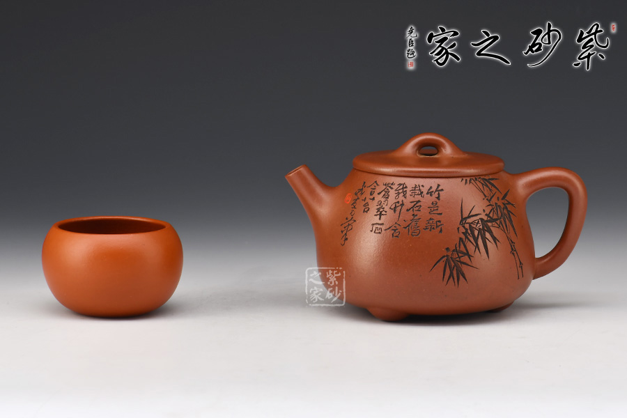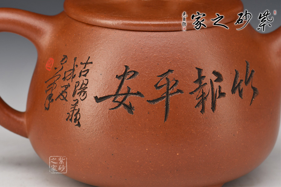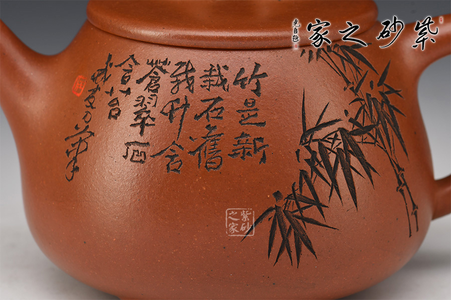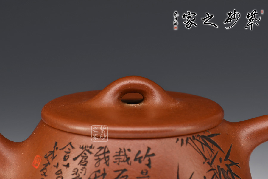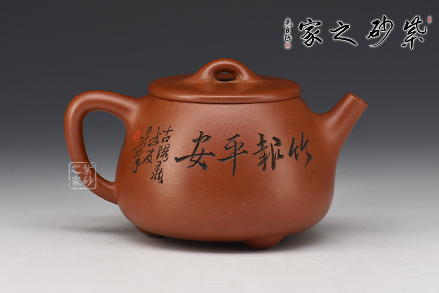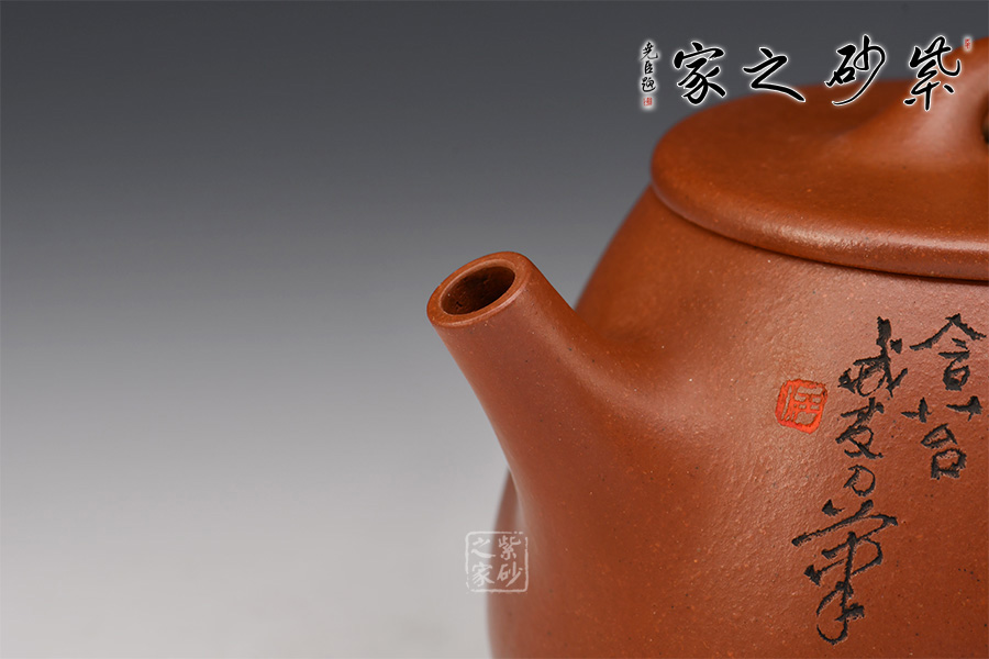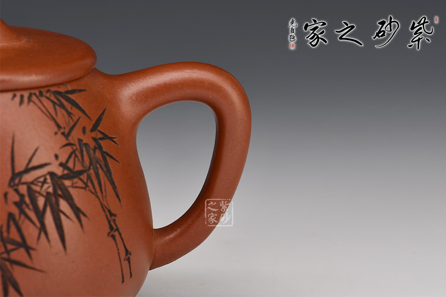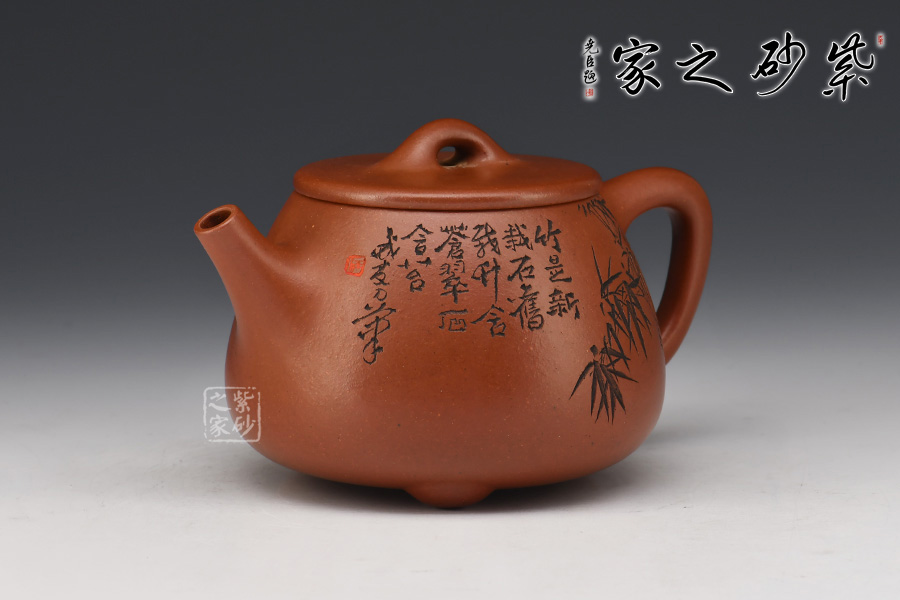 “石瓢”最早見于宋代稱為“石銚”,數(shù)百年來幾經(jīng)改良,至今仍是最受茶人喜愛的器形之一。作品線條流暢,飽滿圓潤的壺身,盡顯剛中有柔,和順有力。橋梁鈕與壺蓋和諧統(tǒng)一。壺嘴短直,剛勁有力,圈把彰顯曲線柔美之感。三乳足臥底,神韻自然,壺身刻繪,風(fēng)度大氣,回味無窮。