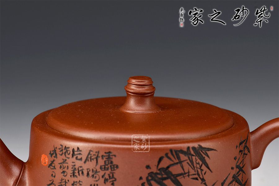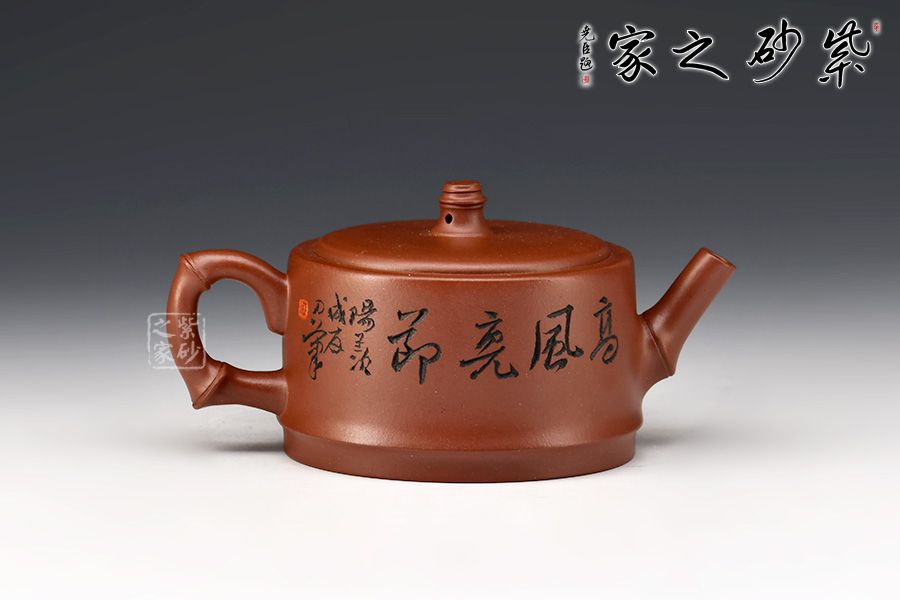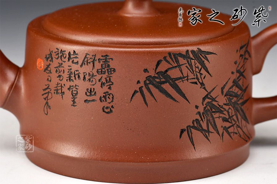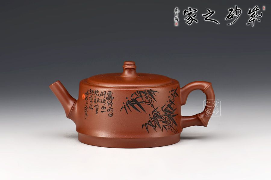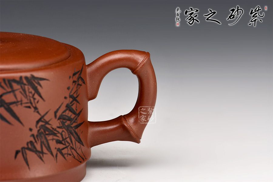 汪成友,國家級高級工藝美術(shù)師,國家高級鄉(xiāng)村振興技藝師。竹子歷來是文人墨客們喜歡的題材,匠人們別出心裁,將竹子與紫砂壺結(jié)合,造就了不一樣的視覺美。此壺壺嘴、壺把及壺鈕皆以竹節(jié)裝飾,壺身刻繪亦為竹葉,體現(xiàn)作者工藝精湛的同時,也凸顯了其高風(fēng)亮節(jié)的精神世界!