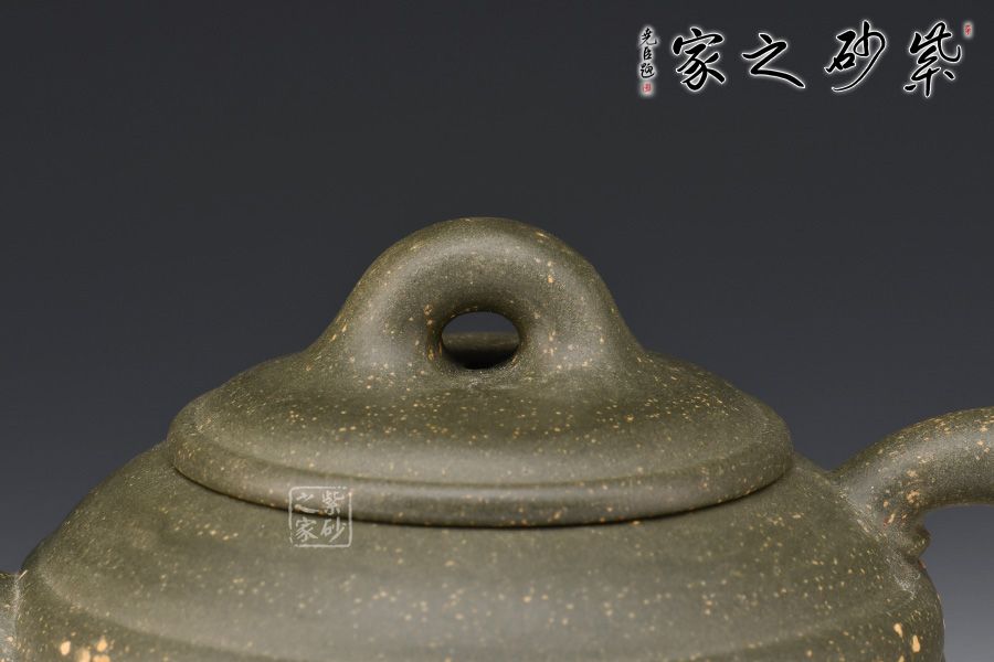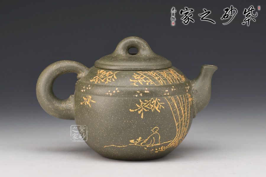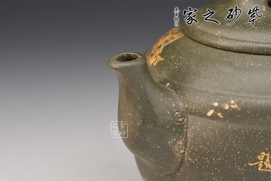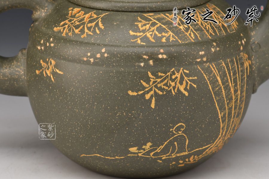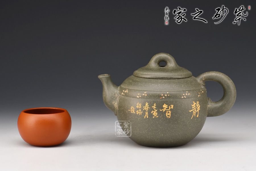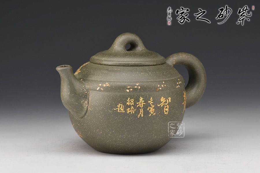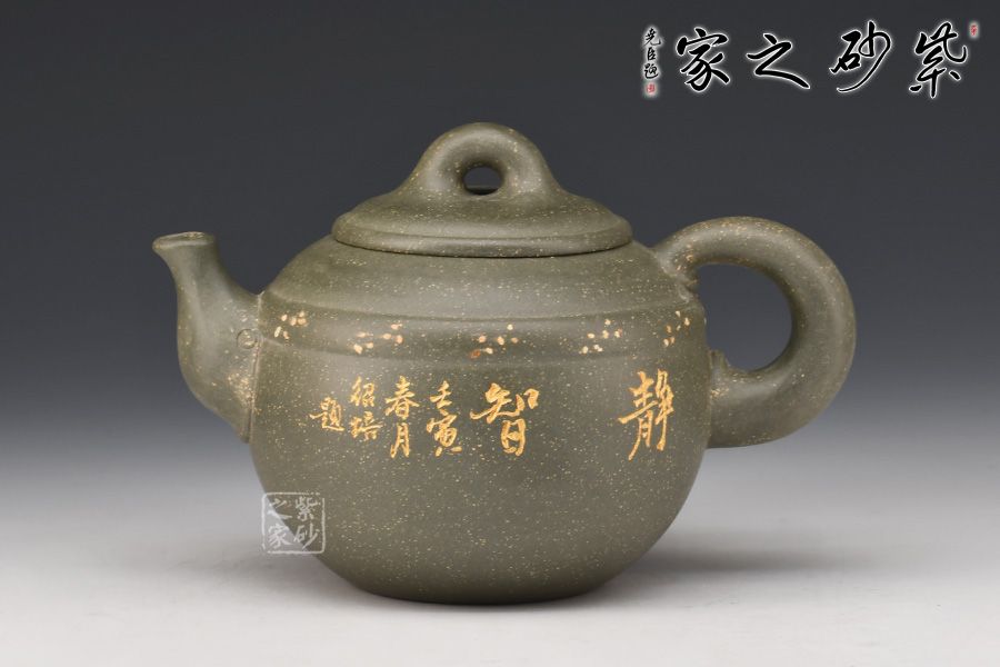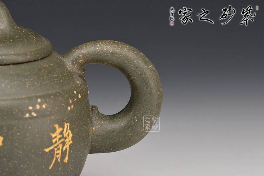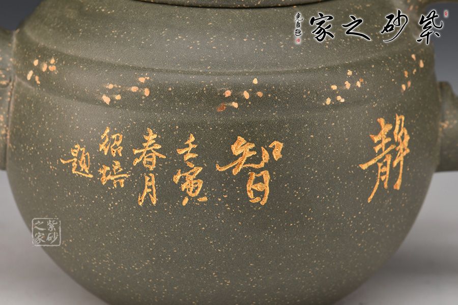許俊濤,國家級工藝美術師,得到顧紹培和顧勤父女兩代紫砂大師的長期指導和悉心栽培,是顧氏門下最具發(fā)展?jié)摿Φ淖仙八囆g家, 顧氏陶藝第六代傳人。此壺由顧紹培大師書題,壺身圓潤飽滿,嬌小可愛,壺把上細下粗,橋型鈕靈巧秀氣,壺頸處的鋪砂工藝更突顯作者的技藝之精湛!