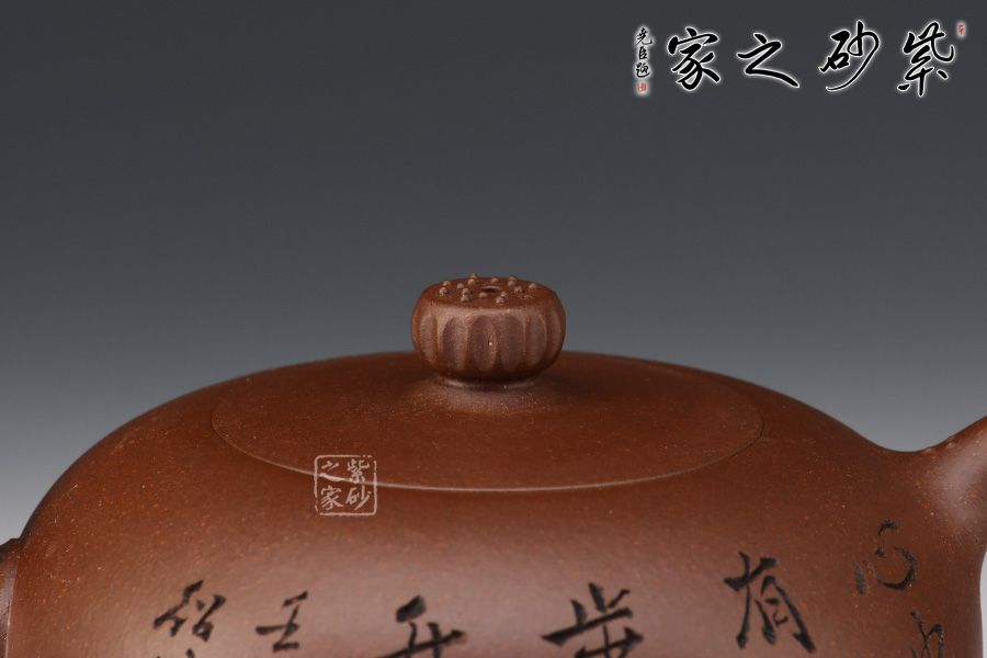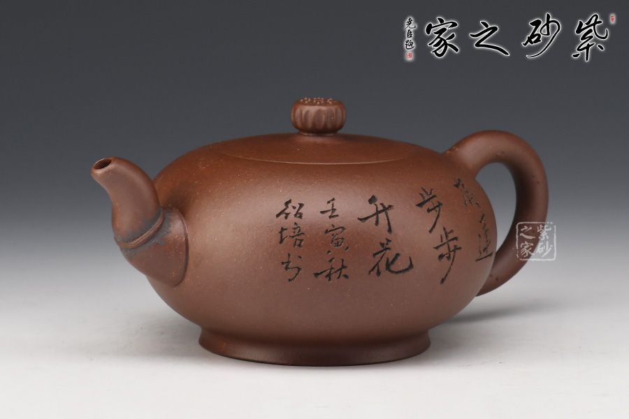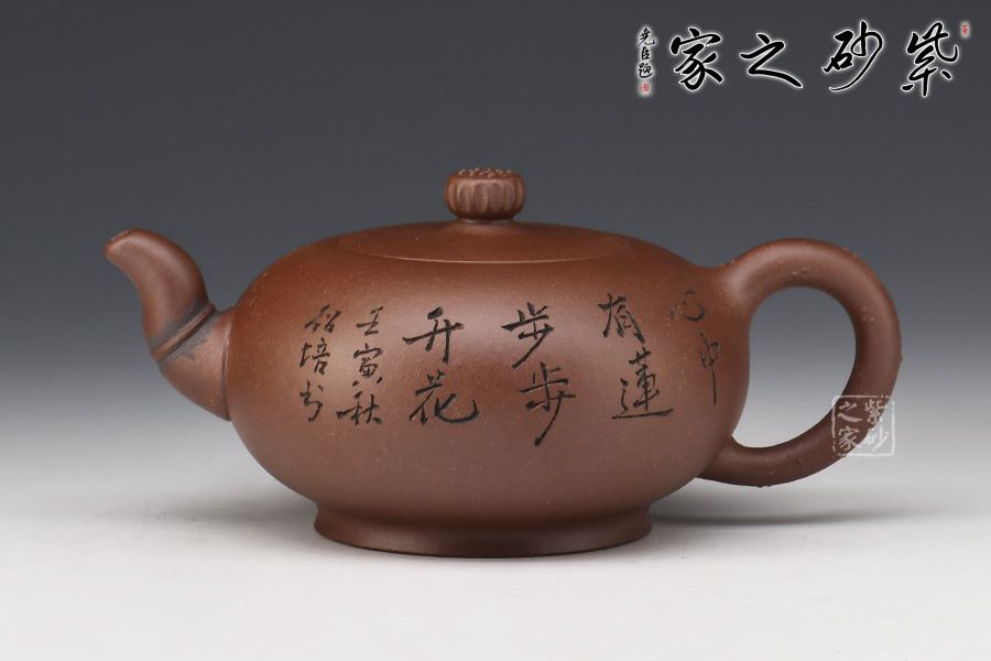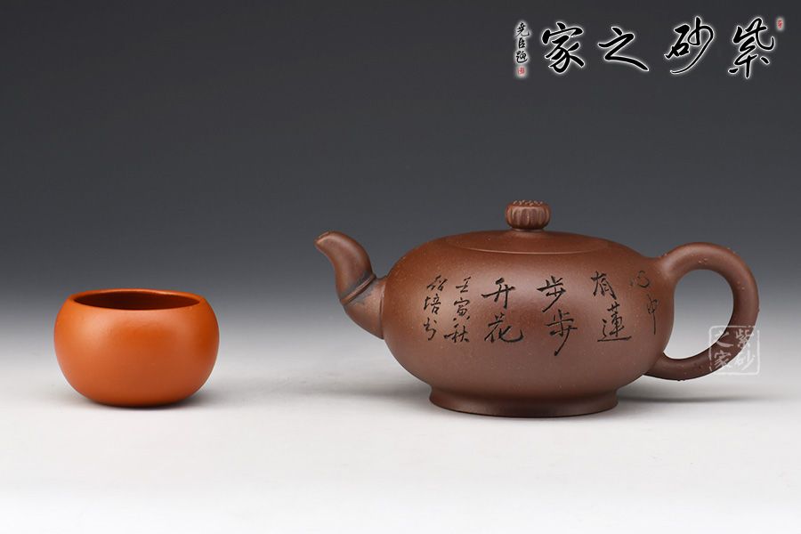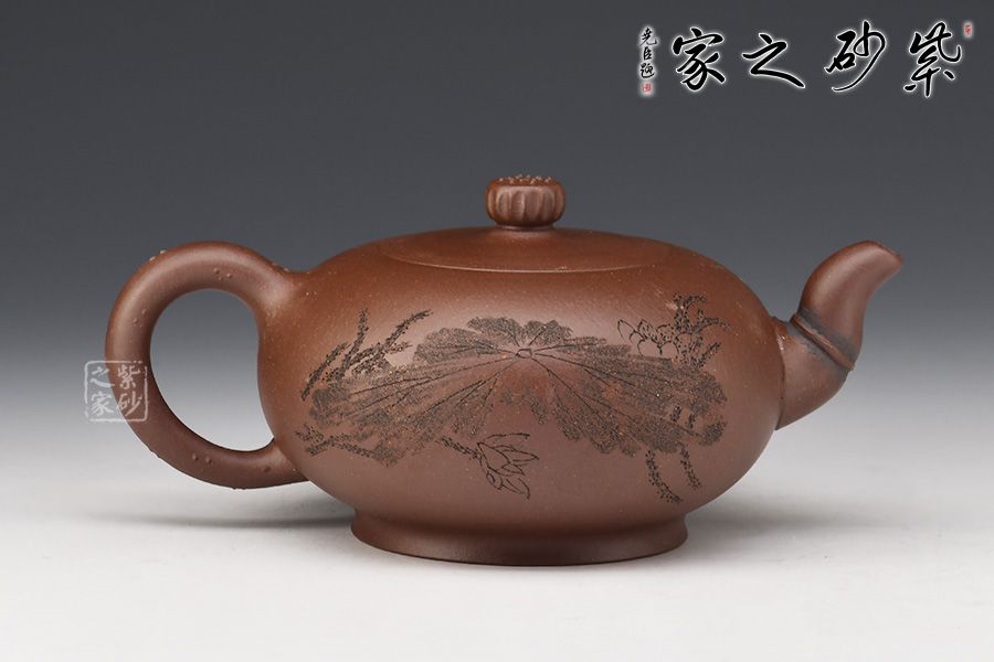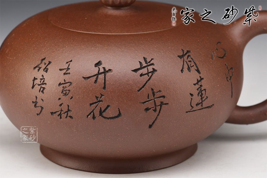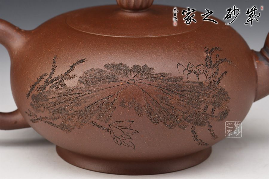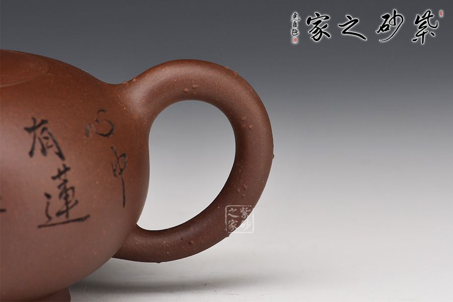 此壺由顧氏門下最具發(fā)展?jié)摿Φ淖仙八囆g家、顧氏陶藝第六代傳人許俊濤制作。壺身飽滿圓潤,壺嘴以竹節(jié)裝飾,壺鈕似一棵蓮蓬,整壺氣韻飽滿,禪意十足,壺身刻繪“心中有蓮步步升花”讓人心生歡喜,此壺已不是簡單的一把壺,而是一件藝術品!