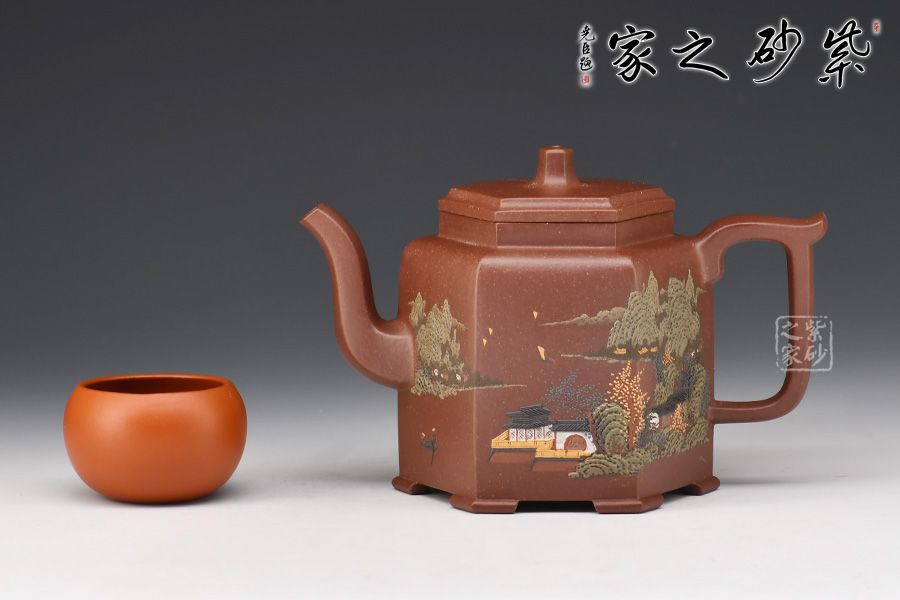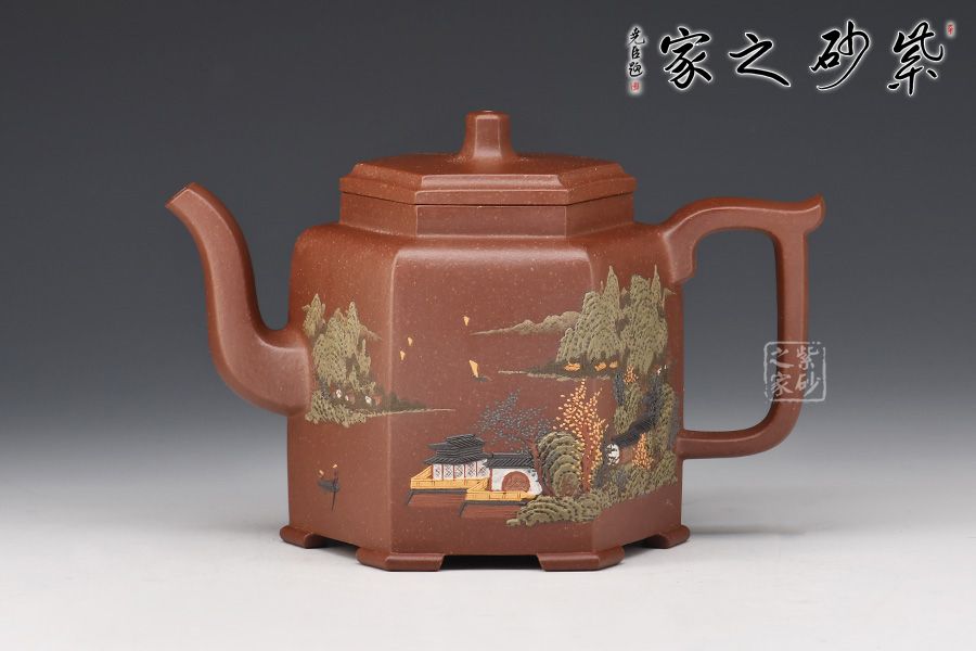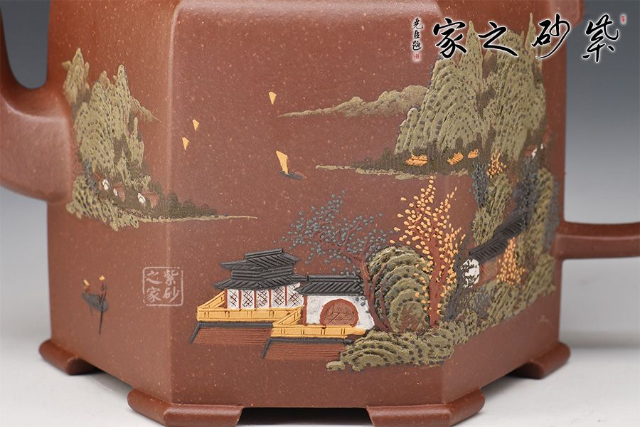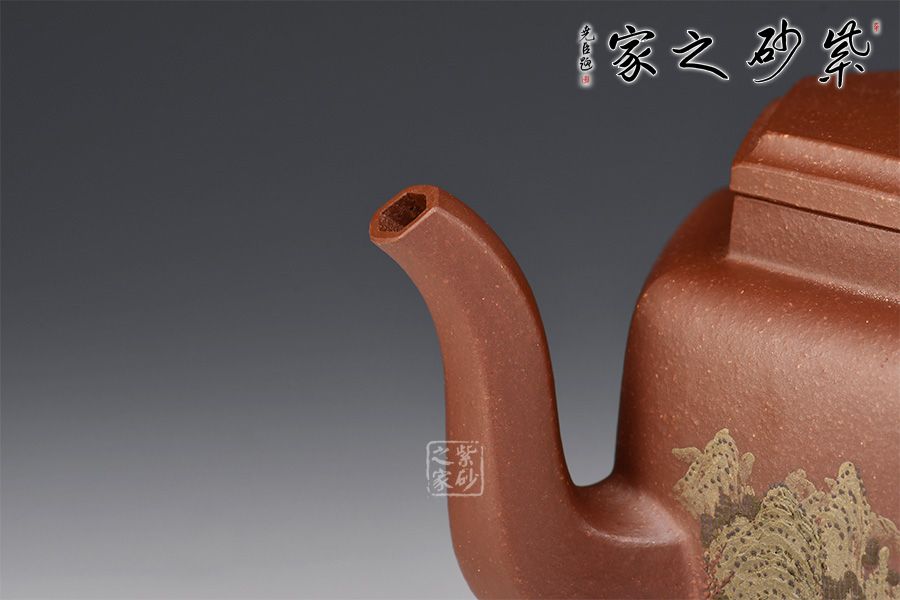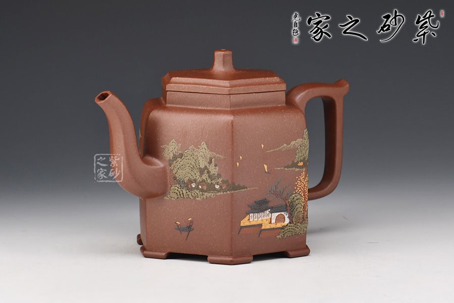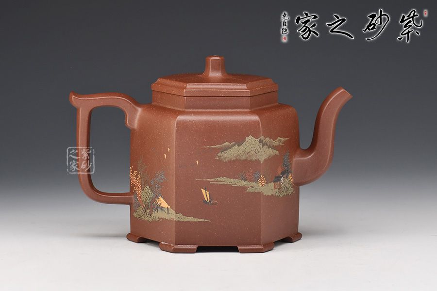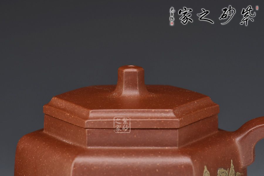 此壺以六方壺為形,壺身呈六棱柱型,身筒高挺端正。壺的所有部位與壺形體相稱,剛?cè)岵?jì),流把呈不規(guī)則六棱形,線條流暢自然,線面挺括平整,有棱有角。壺蓋與壺口相對(duì),亦呈六方圓形。上作六棱狀壺鈕,似壺身之縮影,渾然一體。