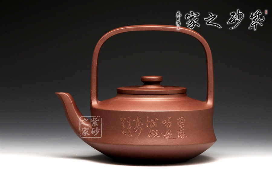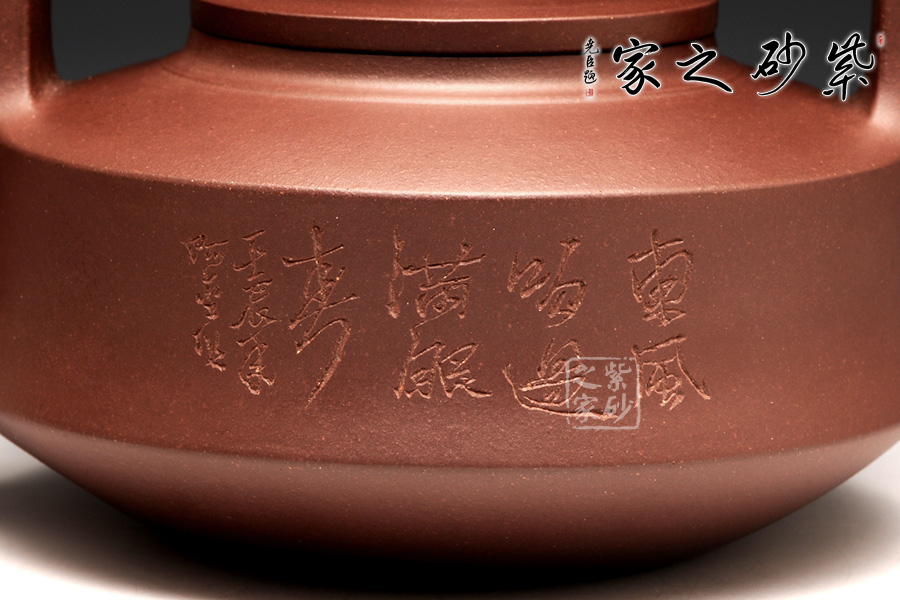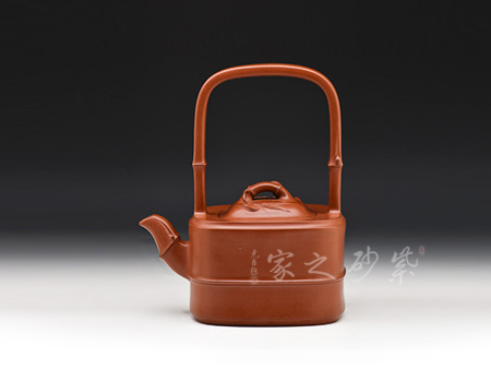 這款出自于潘明星之手的提壁壺,圓中寓方,俊朗的輪廓和與圓潤柔和的線條,勾勒出壺身大氣古樸,矯健精致的氣質。從壺鈕到壺蓋,再從壺身到壺底,圓形線條清新明朗,成比例放大,顯示出了精準的做工。