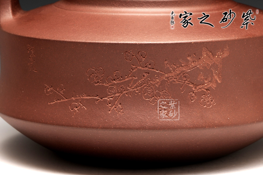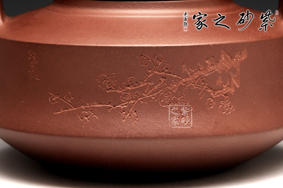 此壺正面刻繪有“東風吹過滿眼春”,背面刻繪的梅花,所在的位置,恰到好處,起到了為壺裝飾的作用,也展現(xiàn)了壺自身的品格和品味。