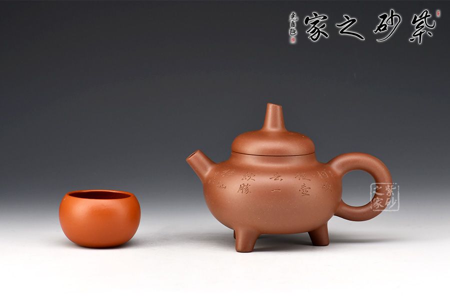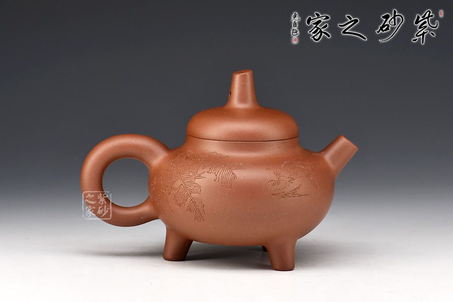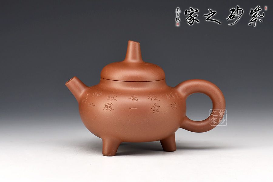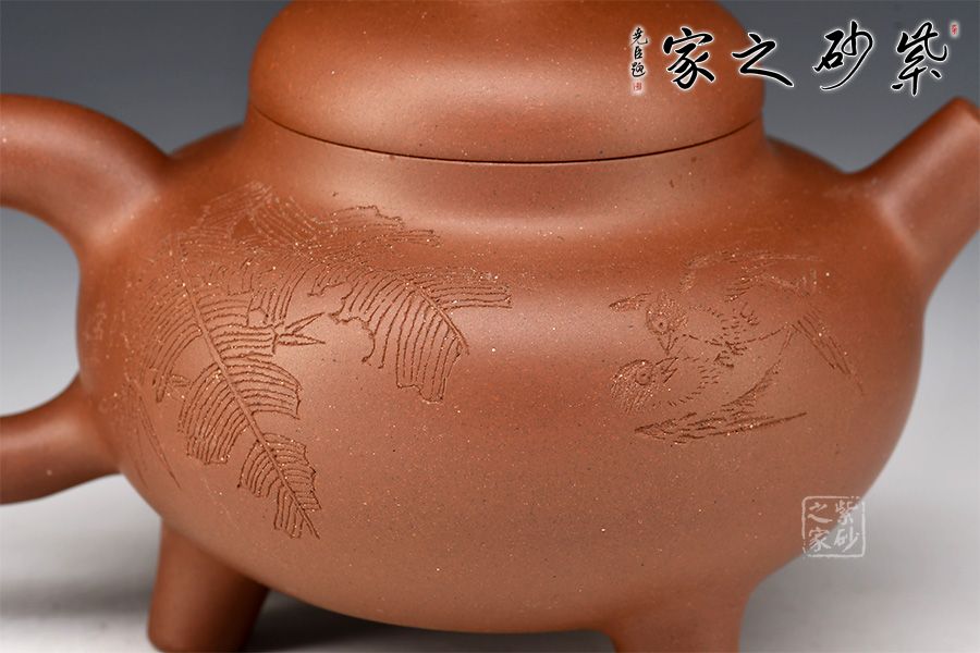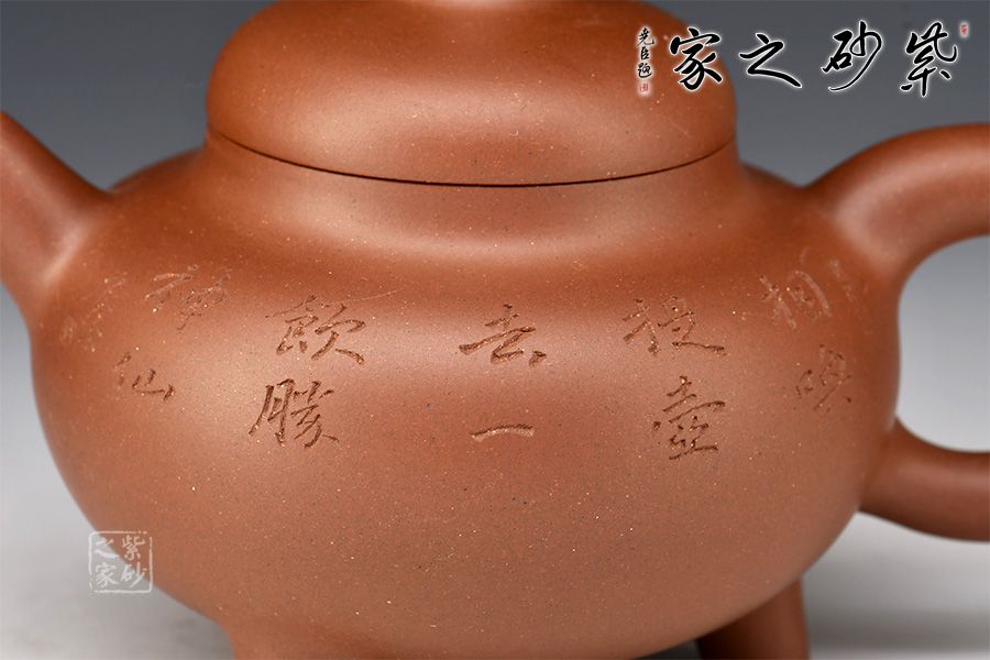 此壺端莊沉穩(wěn),大氣磅礴。壺身呈扁圓球型,線(xiàn)條厚重洗練,底部加三鼎足,古樸而渾厚。鼓蓋平滑簡(jiǎn)練,柱形壺鈕露鋒芒且沉著。直嘴和環(huán)形把相對(duì)應(yīng),一直一曲都古拙可愛(ài)。