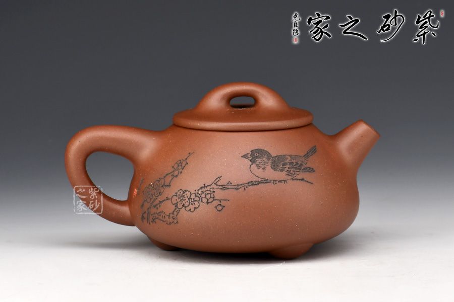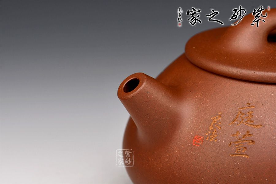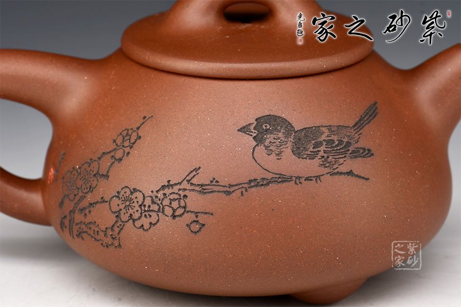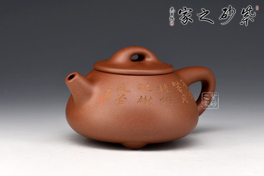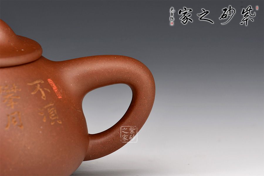 此壺壺身線條較為柔和,壺身飽滿,呈梯形。平蓋纖秀輕盈,暗接橋形鈕古雅精致,直流嘴胥出利落自然,出水迅猛大氣,三角把回歸經(jīng)典石瓢的氣勢,三只乳丁足抬高壺身,更顯威嚴。此壺通體流暢,曲線優(yōu)美,古樸大方,用泥溫潤,制作精美,格調(diào)高雅。
