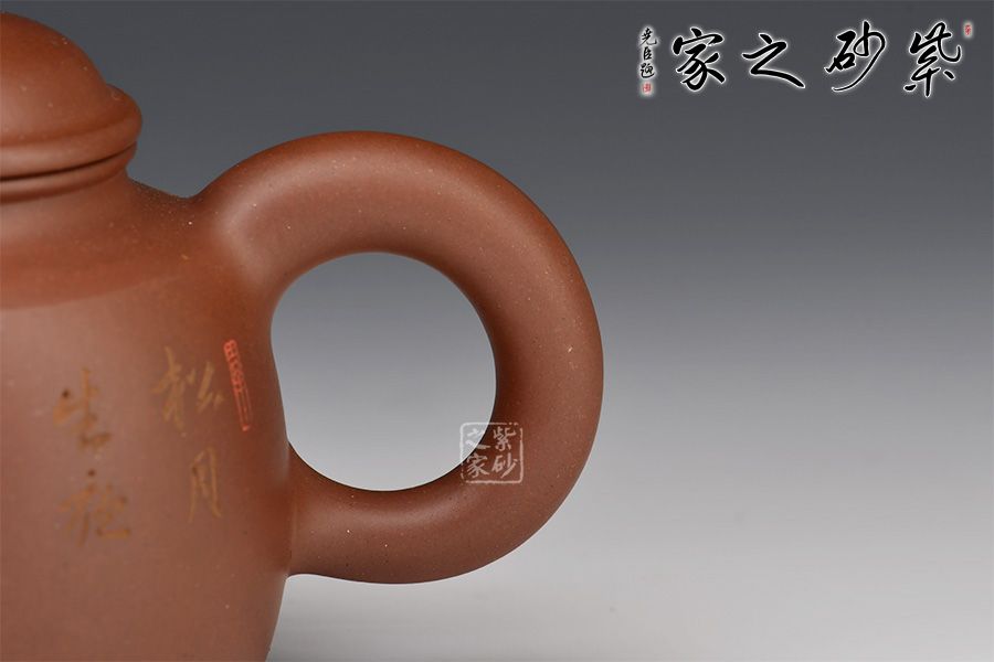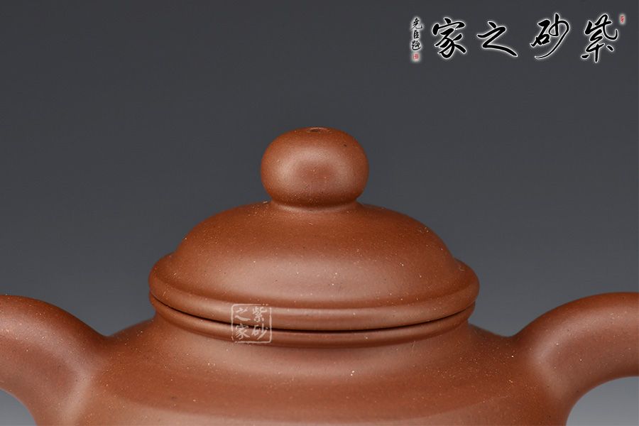 此壺方圓結(jié)合,大方高雅,是玩壺品茗的佳選。壺身圓中有方,肩線和足線上下對(duì)應(yīng),中間部分平滑洗練,有方器的工整味道。頸部和底足相互對(duì)應(yīng),更顯氣質(zhì)優(yōu)雅。子母線壓蓋設(shè)計(jì),對(duì)接工整。鼓蓋簡(jiǎn)潔流暢,珠型鈕小巧精致。壺把和壺嘴的造型都很傳統(tǒng),壺把環(huán)形,渾圓厚重,壺嘴彎流,線條簡(jiǎn)單。整個(gè)壺型厚重而不苦悶,優(yōu)雅又不輕佻。