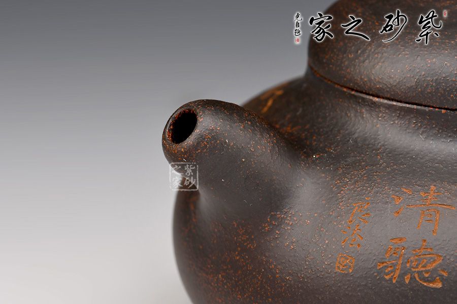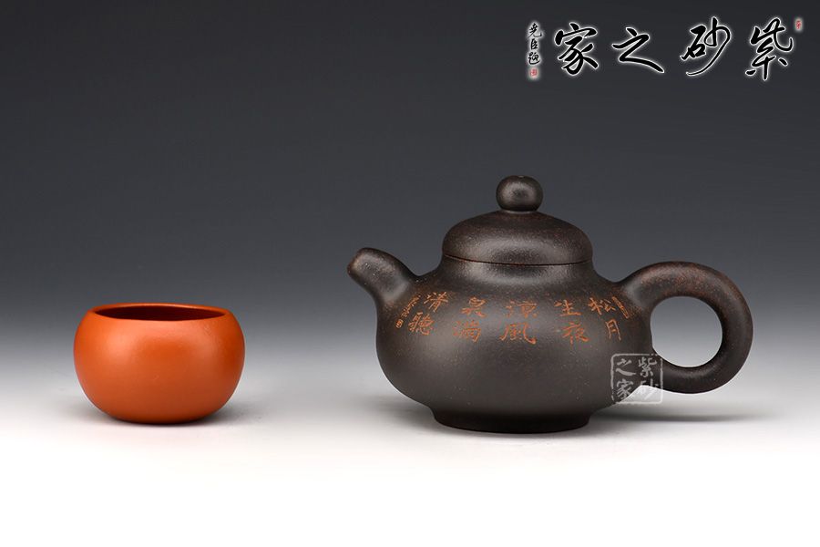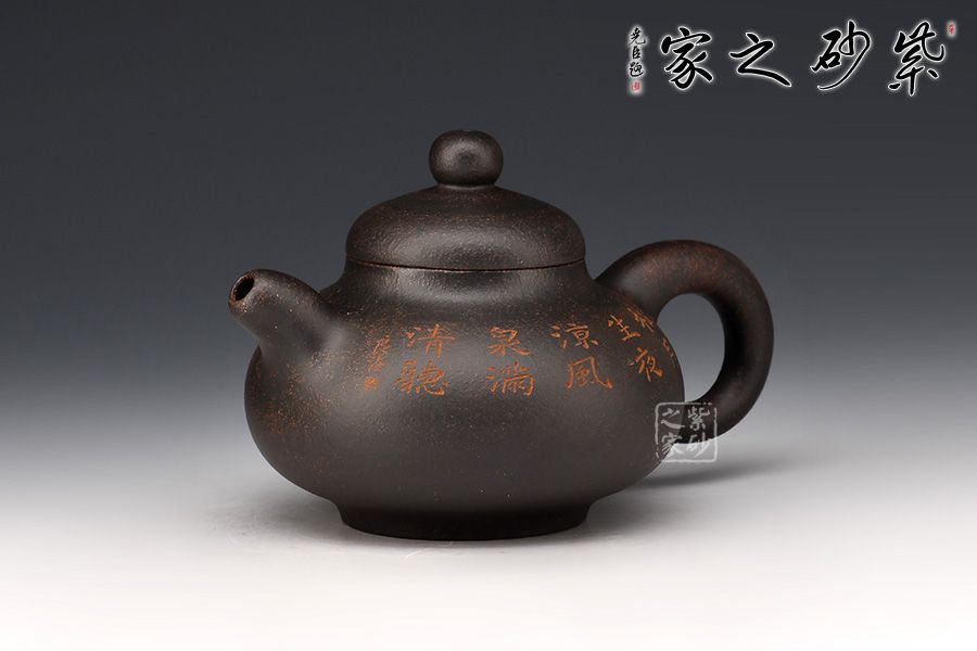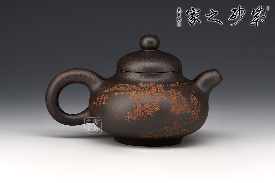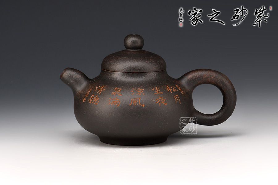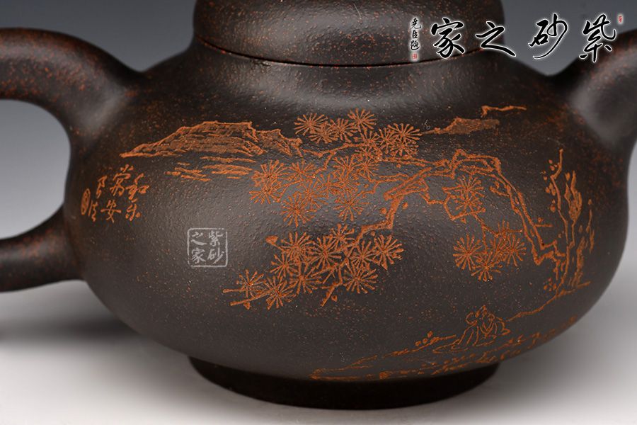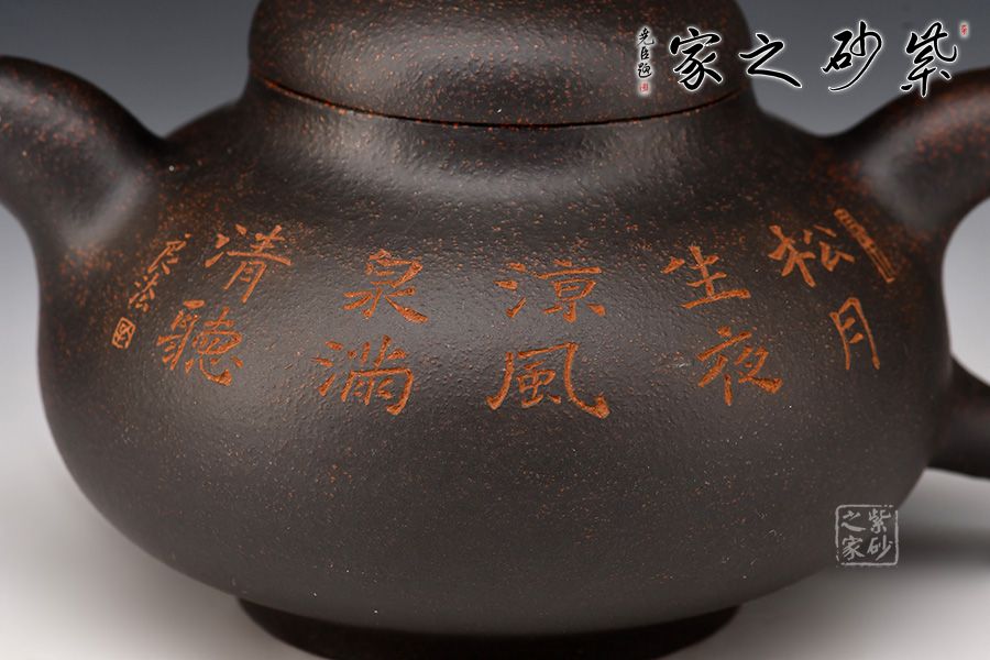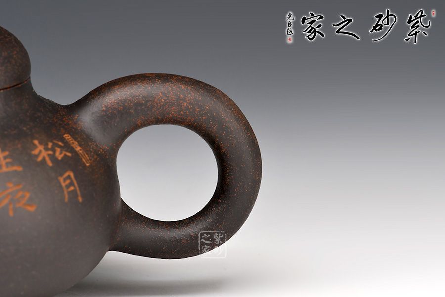 此壺壺身為扁圓球型,線條飽滿,輪廓柔和。壺底加圈足,和壺頸部上下對應,優(yōu)雅氣韻由此頓生。壺蓋飽滿圓潤,如一滴晃動的墨水。圓珠壺鈕圓滑可愛,精妙可人。粗把粗嘴相呼應,韻味濃厚??汤L的“松月生夜涼,風泉滿清聽”,描繪的秋夜涼爽幽靜,背面的松月景致意境深遠。