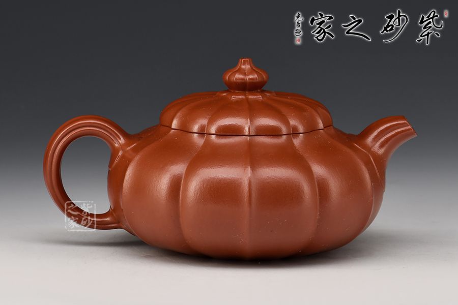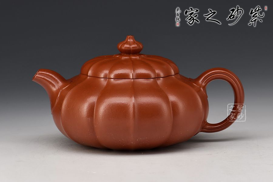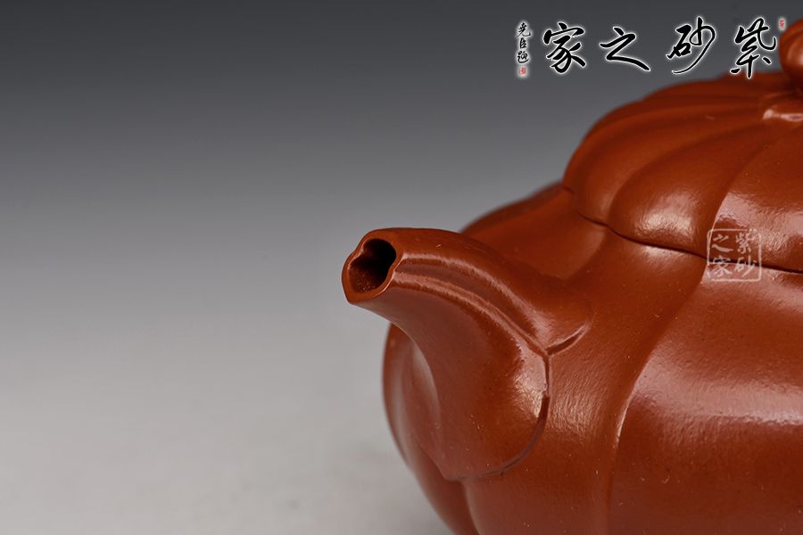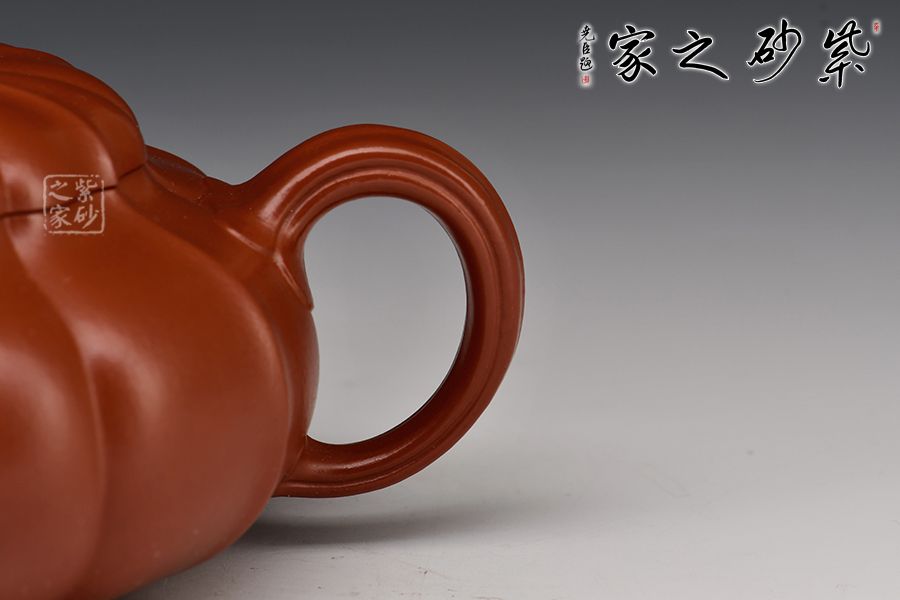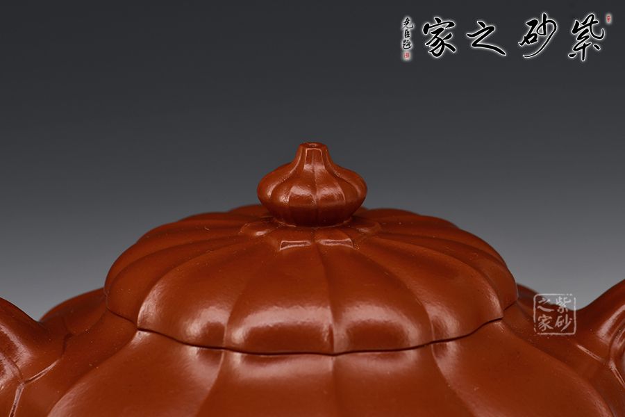 此壺采用原礦朱泥制成,泥質(zhì)細(xì)膩,色澤紅艷亮麗,整器為筋紋器,壺身、壺蓋及壺鈕均以筋紋貫穿,分布均勻,上下線條完美吻合,口部與半球狀蓋相切,口蓋較大,實(shí)用性特別強(qiáng),一彎流自壺腹胥伸自然,把高挑圓潤(rùn)下留垂耳,與流對(duì)應(yīng)稱勢(shì)。整器溫潤(rùn)透明、質(zhì)感絕佳!