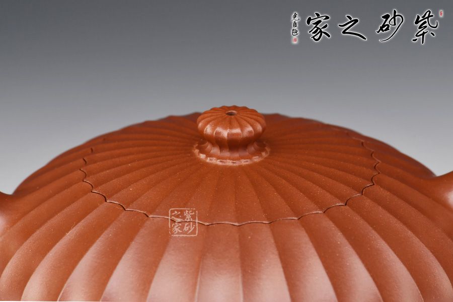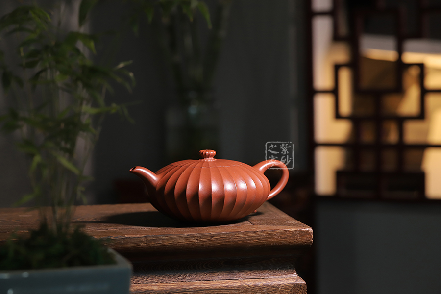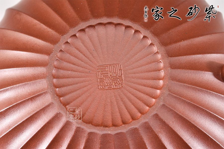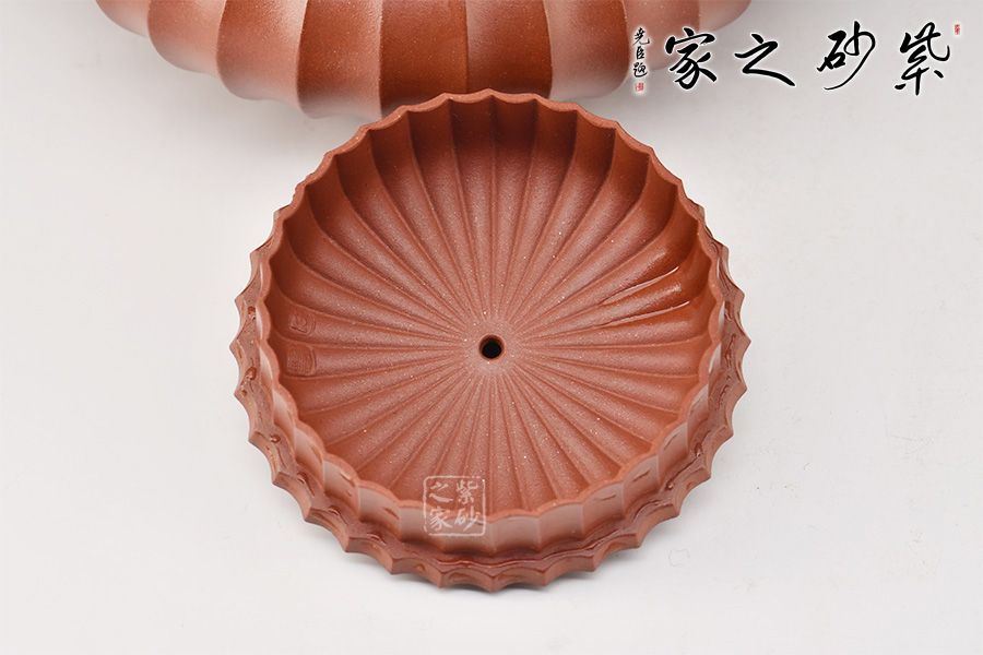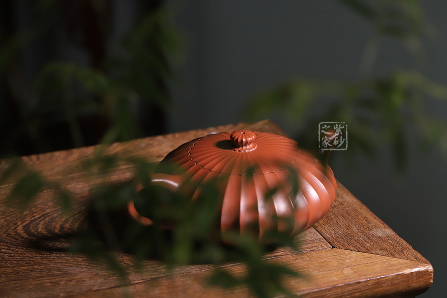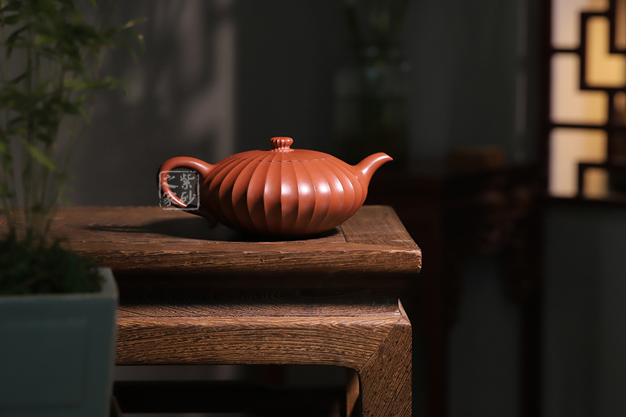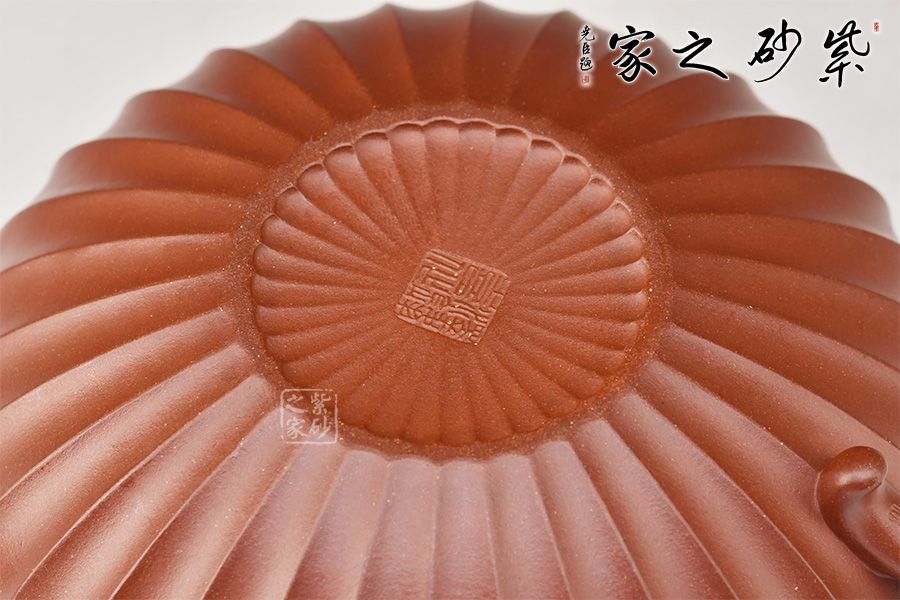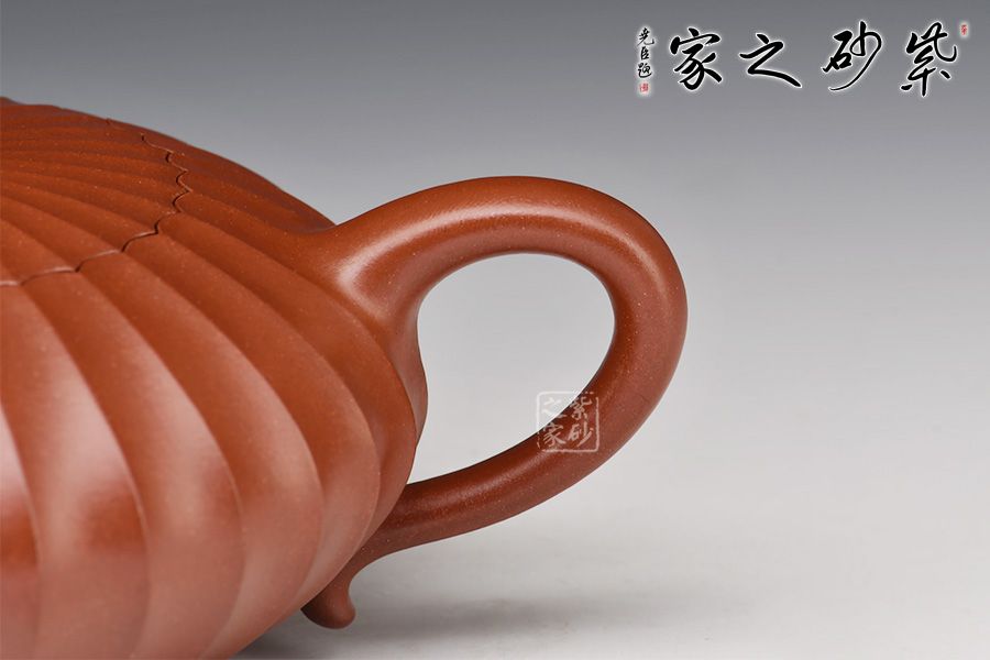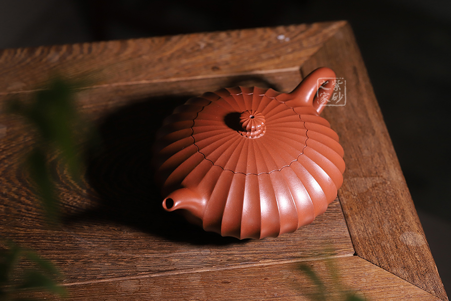 此壺通體布滿筋紋線條,以一朵盛開的花為原型進(jìn)行創(chuàng)造和制作,整個壺身由均勻等分的花瓣筋紋所組成,線條清晰有致,鼓囊圓潤,向外突出,使得整個壺身看起來十分飽滿。隨著筋紋的線條向上,逐漸向內(nèi)收成一個圓形的壺口。
