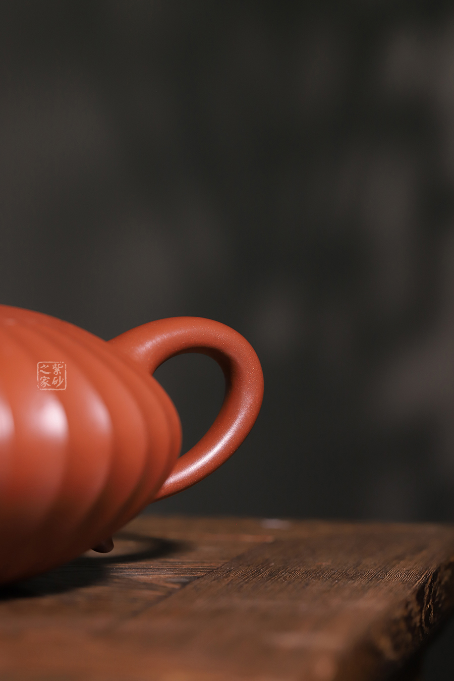 壺蓋嵌于壺中,與壺口融為一體,邊緣與筋紋線條整齊地對仗貼合,筋紋線條從壺身底部一直延伸到壺鈕頂端,壺鈕上的筋紋線條清晰分明、精巧細(xì)致。一彎流壺嘴與壺把在壺身的兩側(cè)相互對應(yīng)著,具有動感與張力。