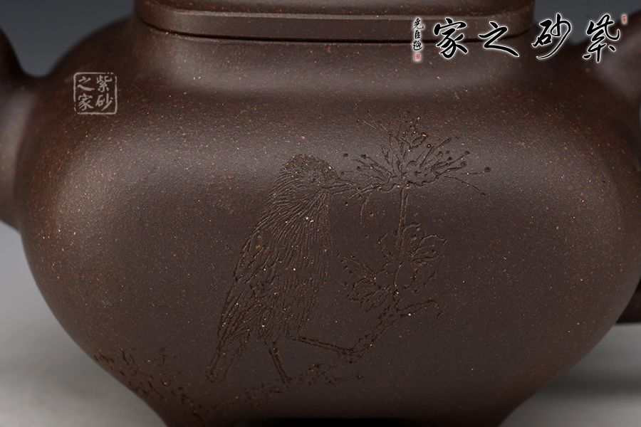 此傳爐壺,精選原礦紫泥精制而成,端莊穩(wěn)重,底蘊(yùn)儒雅。整壺仿若一個香爐,壺身骨肉亭勻,上豐下斂,輪廓清晰,線條流暢并過渡自然。三彎壺嘴蜿蜒上翹,優(yōu)雅自然,出水爽利。耳形壺把端莊自然,壺底處四個乳足高挺,襯托了壺的高俊挺拔之氣。此壺,值得珍藏。