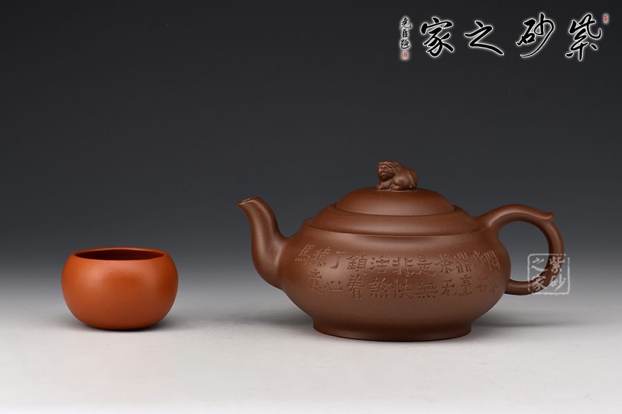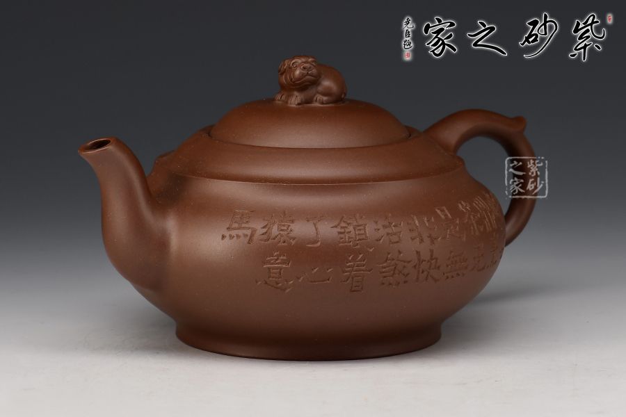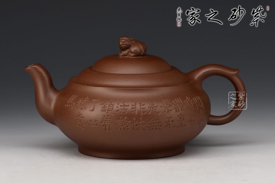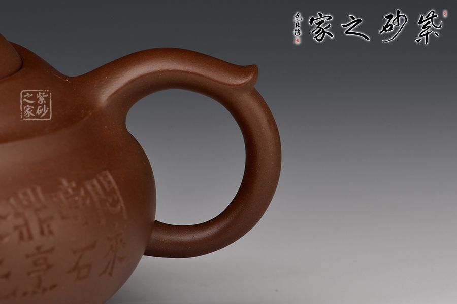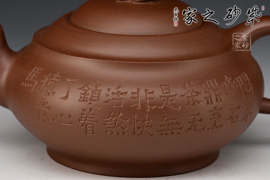 此款望月壺由老紫泥制作而成,色澤端莊穩(wěn)重,壺身飽滿(mǎn),重心下沉,瑞獸鈕,彎流與圈把相呼應(yīng)。壺身刻繪為《閑居》中的“悶來(lái)時(shí)石鼎烹茶,無(wú)是無(wú)非快活煞,鎖住了心猿意馬”,體現(xiàn)了作者的閑情逸趣!此壺性?xún)r(jià)比極高,值得推薦!