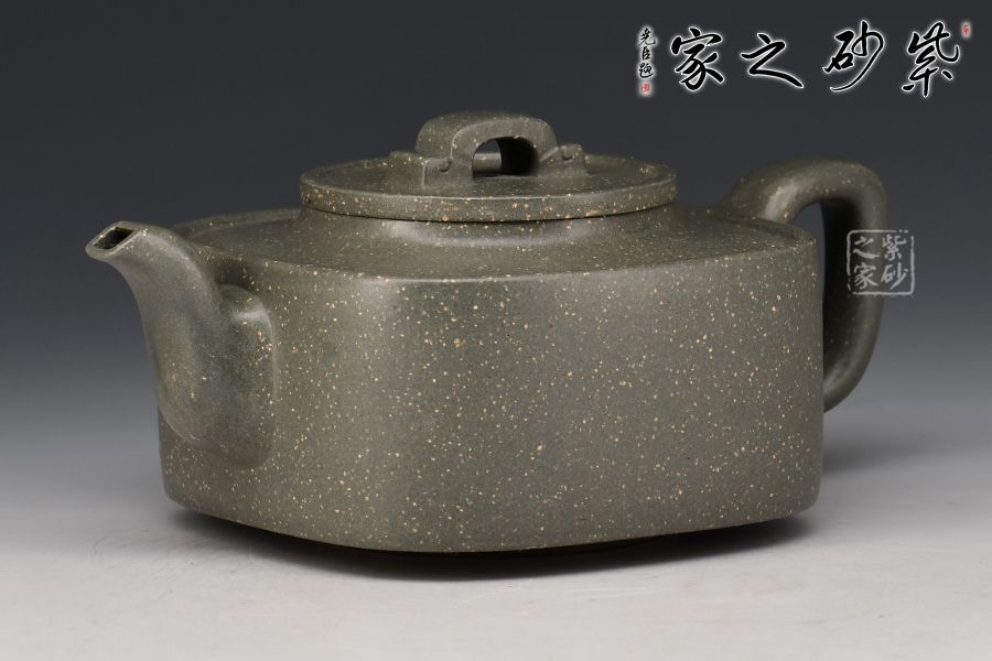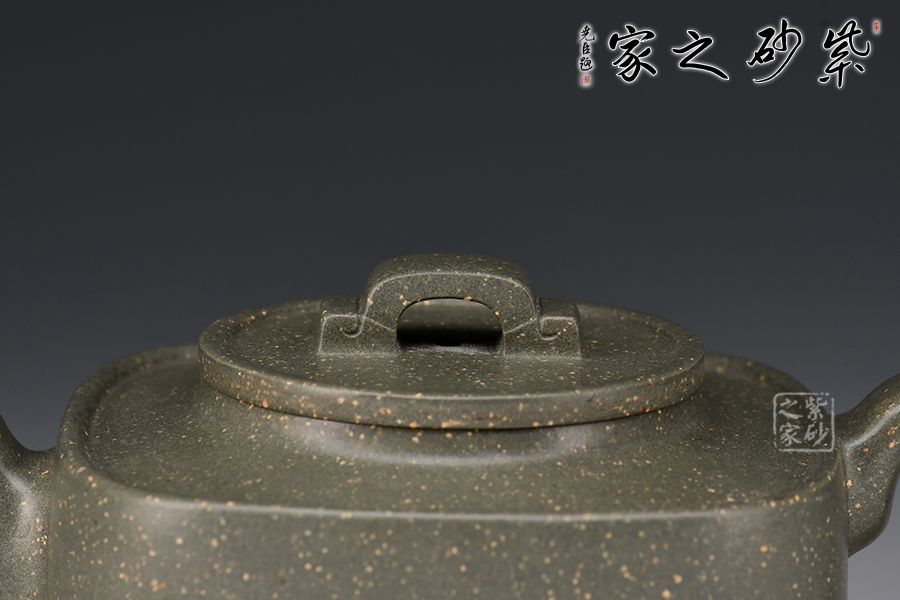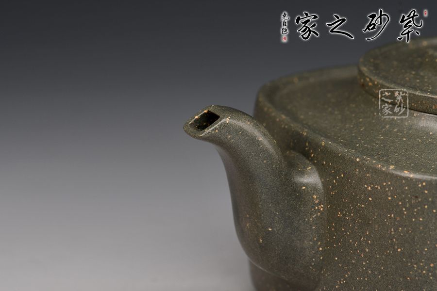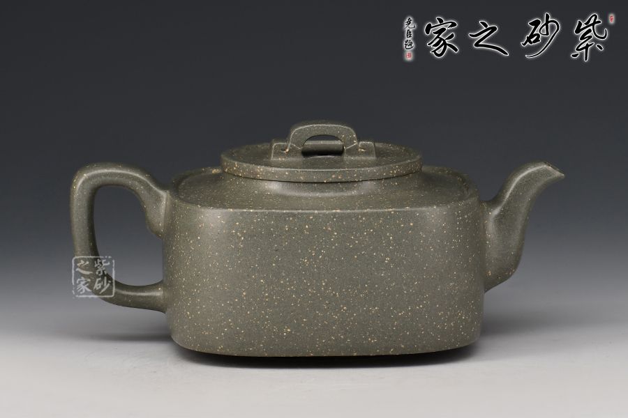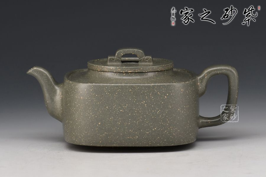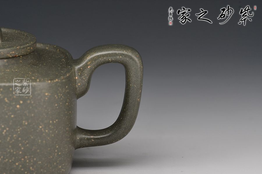 嚴(yán)偉,國家級(jí)高級(jí)工藝美術(shù)師,景舟杯“金獎(jiǎng)”得主。師承于省大師徐元明先生和國大師徐秀棠先生,并有幸得顧景舟大師指點(diǎn)。此款作品采用顧景舟同款泥料雪華綠泥制作,通身好似繁星點(diǎn)點(diǎn)。四方壺身,方中帶圓,轉(zhuǎn)折合度。圓壓蓋設(shè)計(jì),蓋口嚴(yán)密,如意形橋鈕,美觀而實(shí)用。壺嘴彎流,出水爽利!此壺實(shí)用性很強(qiáng),賞藏皆宜!