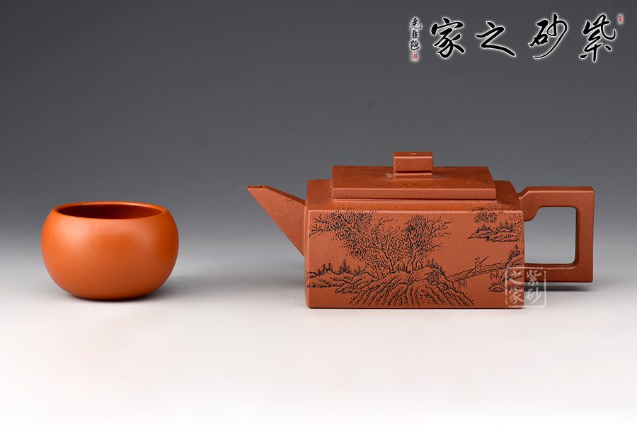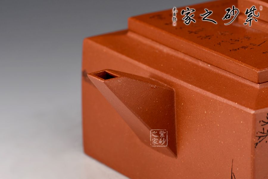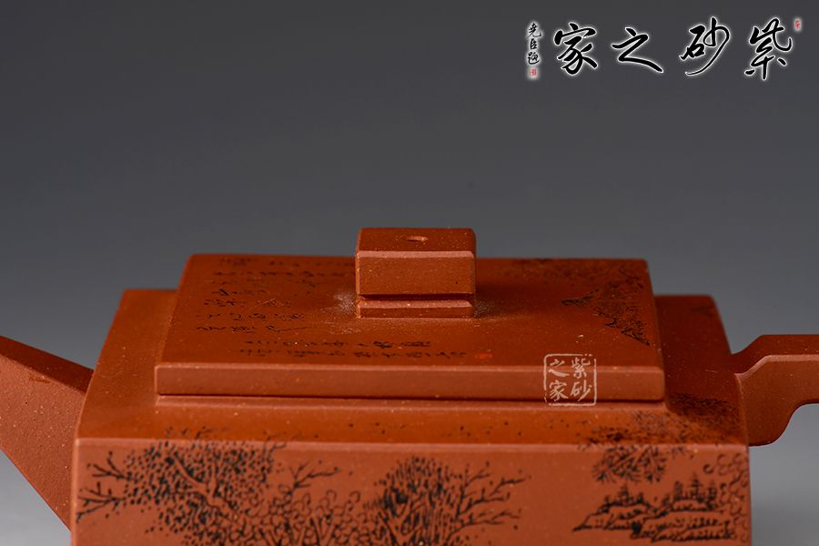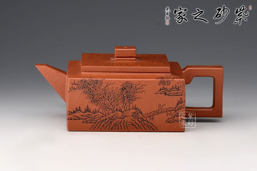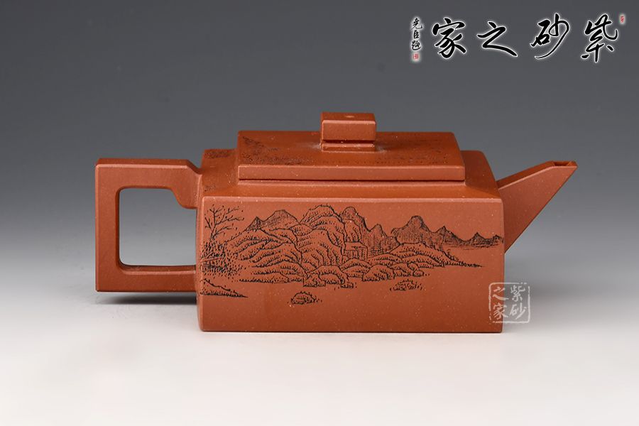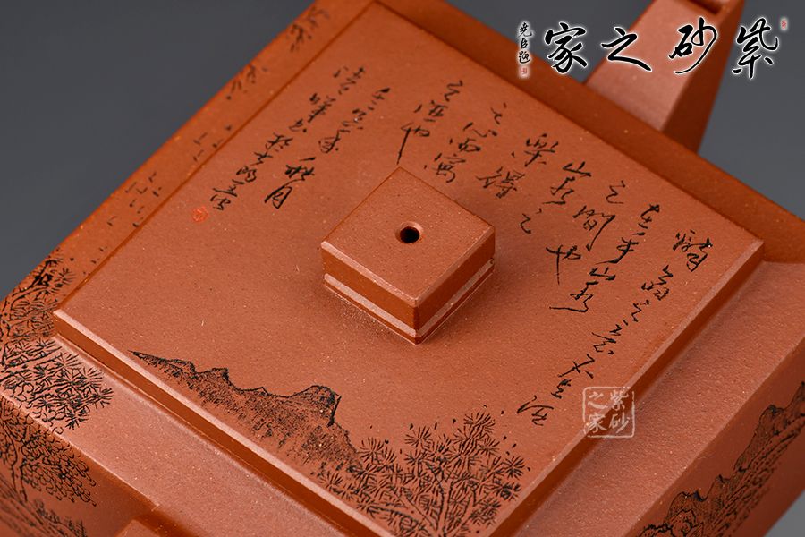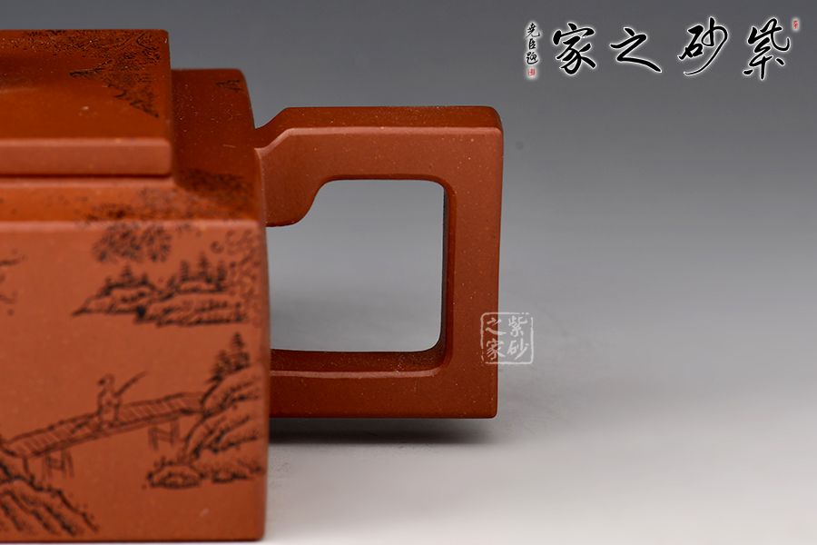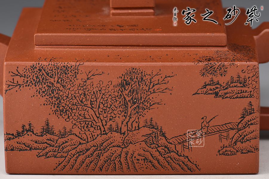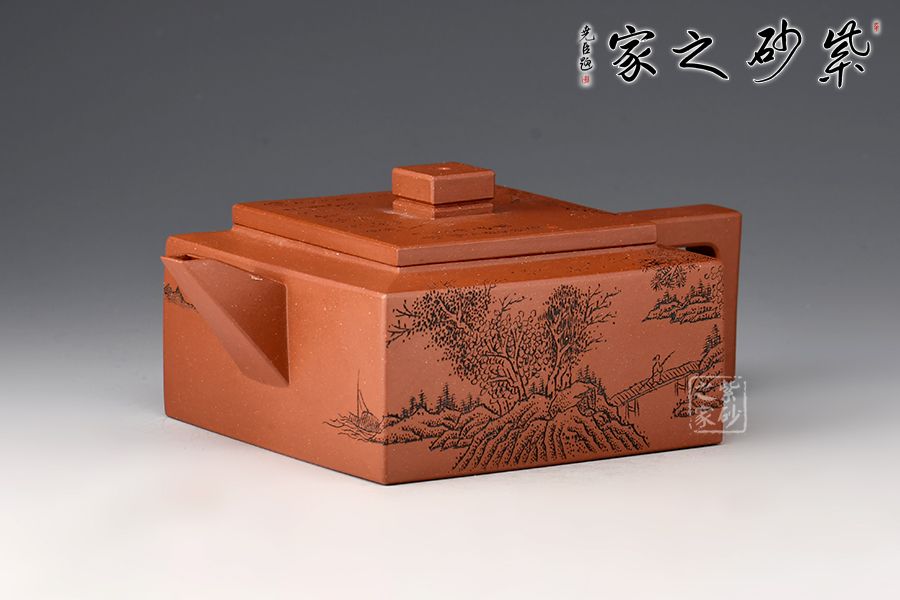 此壺壺體輪廓明朗,于拙樸中見纖巧,器形簡約,凝練線條完美展示造型魅力。四方壺型,線條流暢自然,肩部線條干凈利落。四方壓蓋與壺口吻合嚴密,同型四方壺鈕。壺鈕、壺蓋、壺身均四方,從小至大,錯落有致。壺嘴直流與壺把均是四方,線條剛健,透露剛毅之氣,剛勁有力,精致美觀。壺身陶刻山水之景,賞用皆宜!