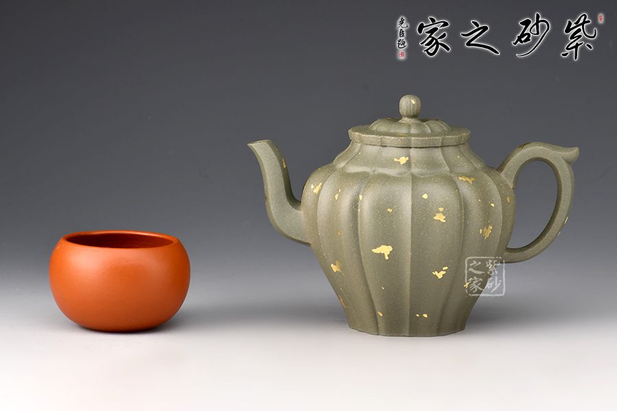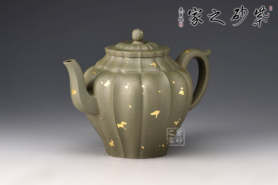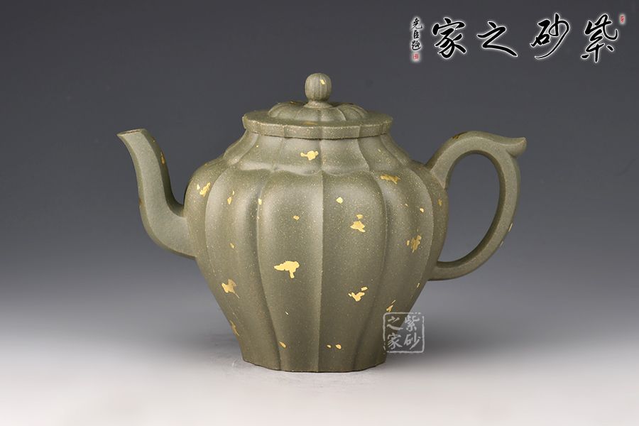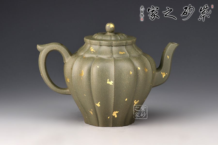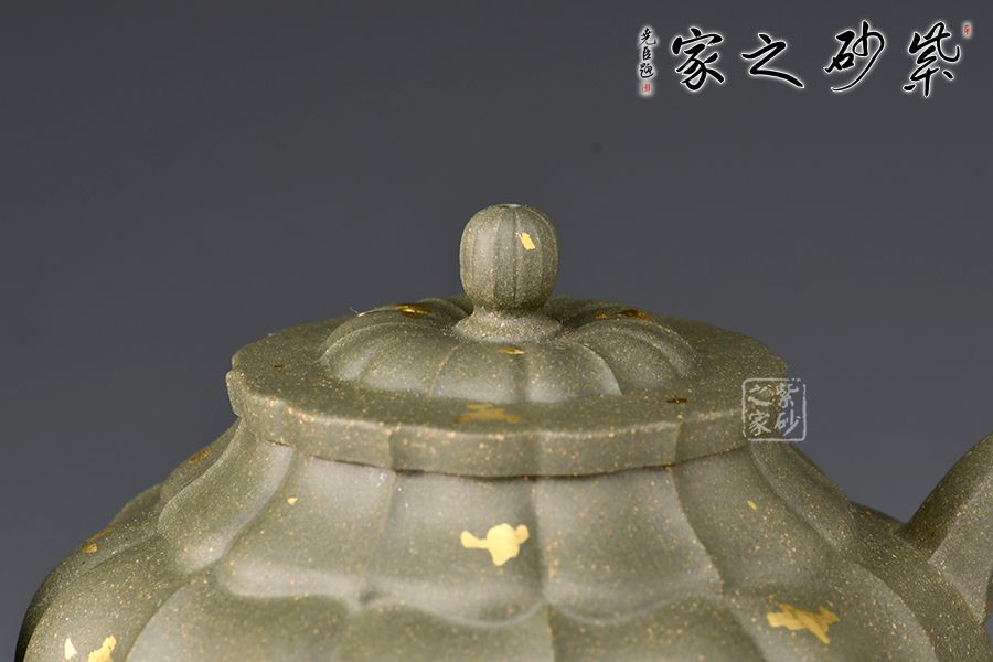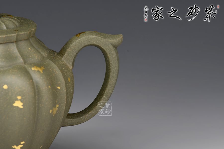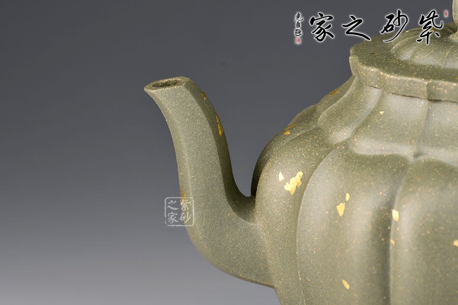 耳形壺鋬修長(zhǎng)隨身勢(shì),與高昂的壺流呈相望之姿。宮燈造型是經(jīng)過(guò)精心布局的,口蓋稍大,壺頸立器,顯得端莊威嚴(yán)。線條流暢通順,高度對(duì)稱(chēng)的抽象圖形展現(xiàn)出了扎實(shí)的手工技藝。灑金裝飾,在豆青砂的襯托下,華麗富貴。