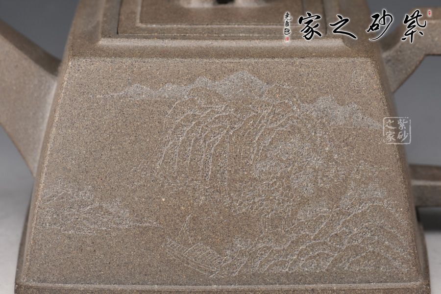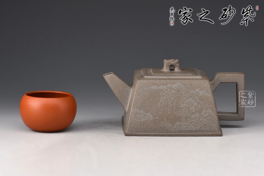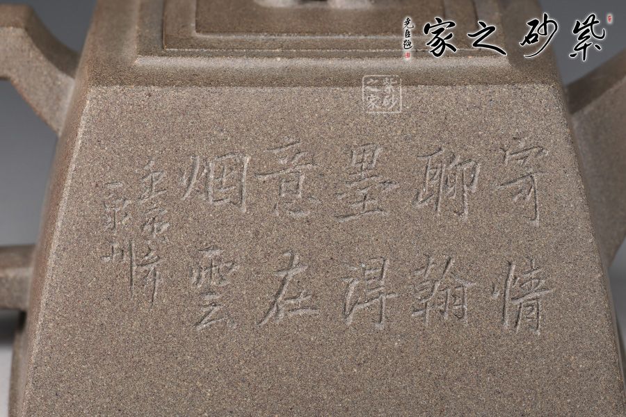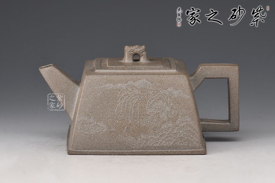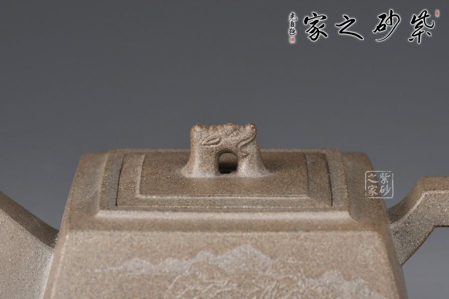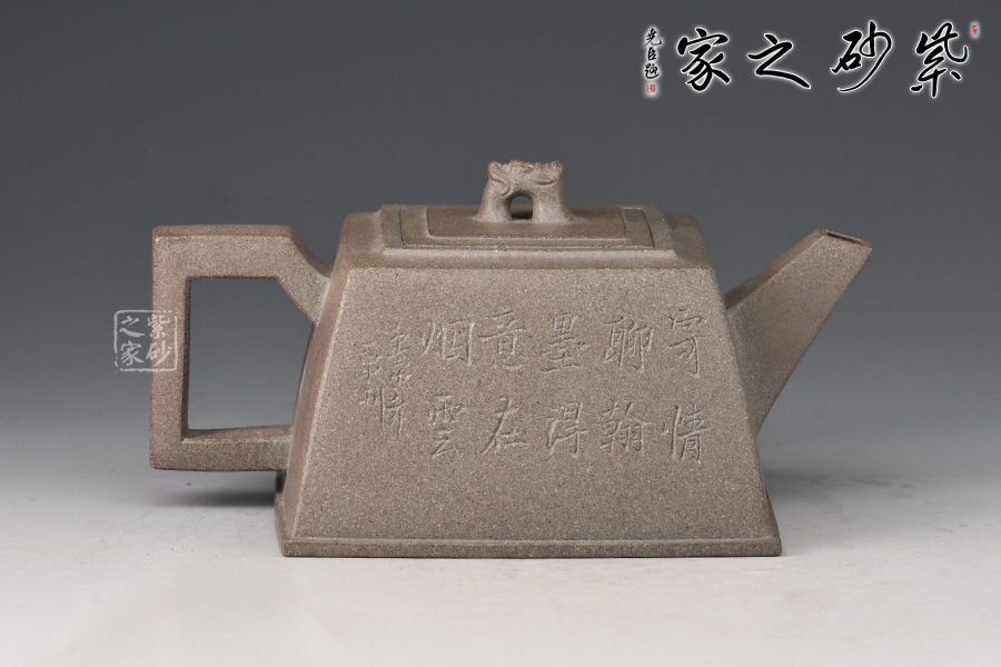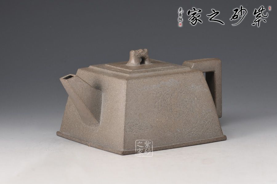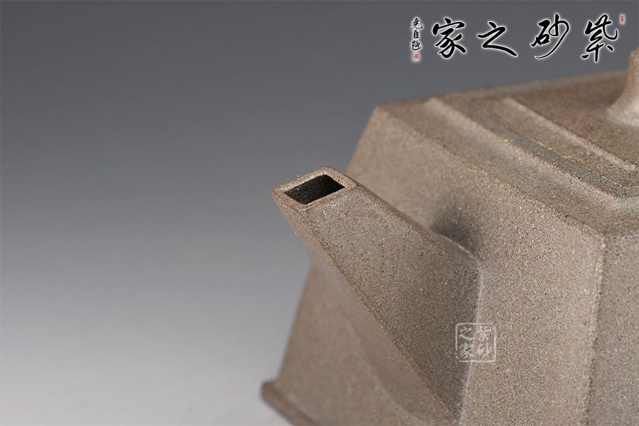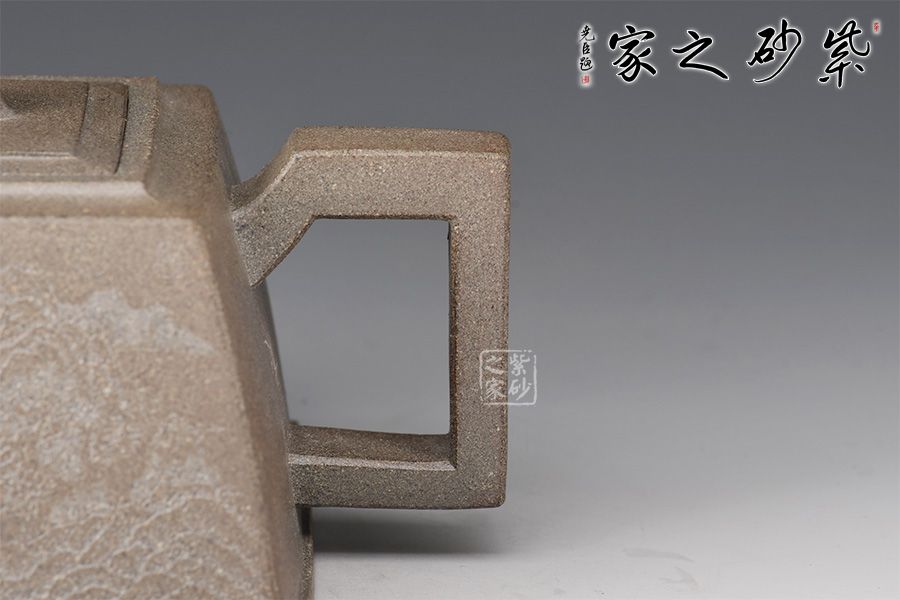 此壺器形似磚,主體、附件均由直線組成,為傳統(tǒng)優(yōu)秀壺式。制作顯其功力,線面干凈利索,直挺不板,給人以坦坦蕩蕩之式。